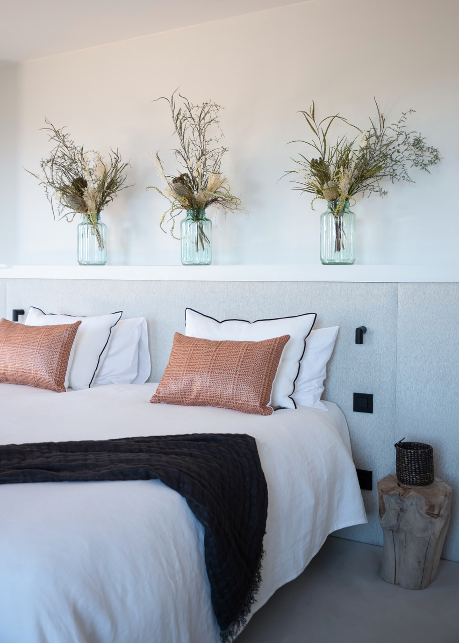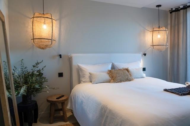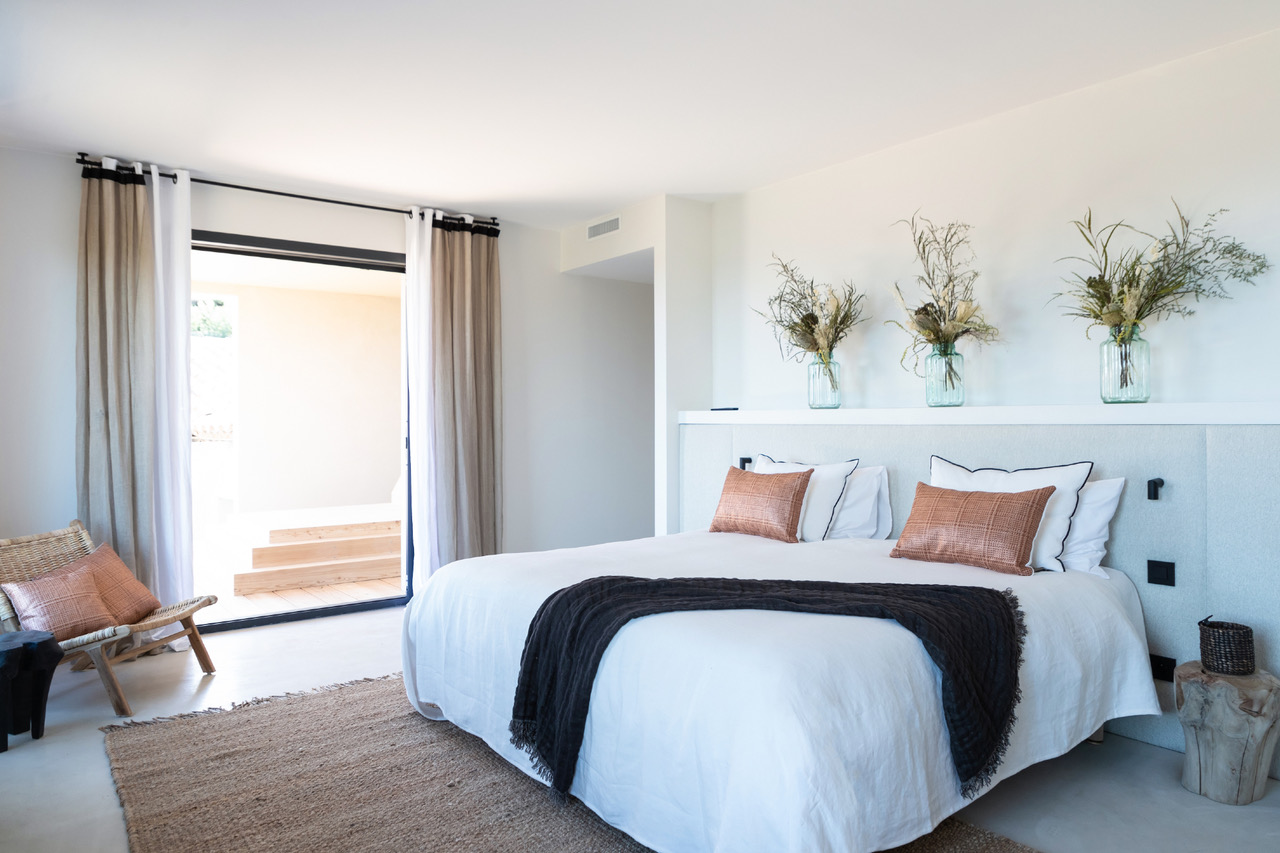 Master bedroom of 60 m2 with super king-size bed, walk-in closet, safe and Ensuite bathroom with double sink, shower, bath and Equipped Terrace private, with day bed with sea view