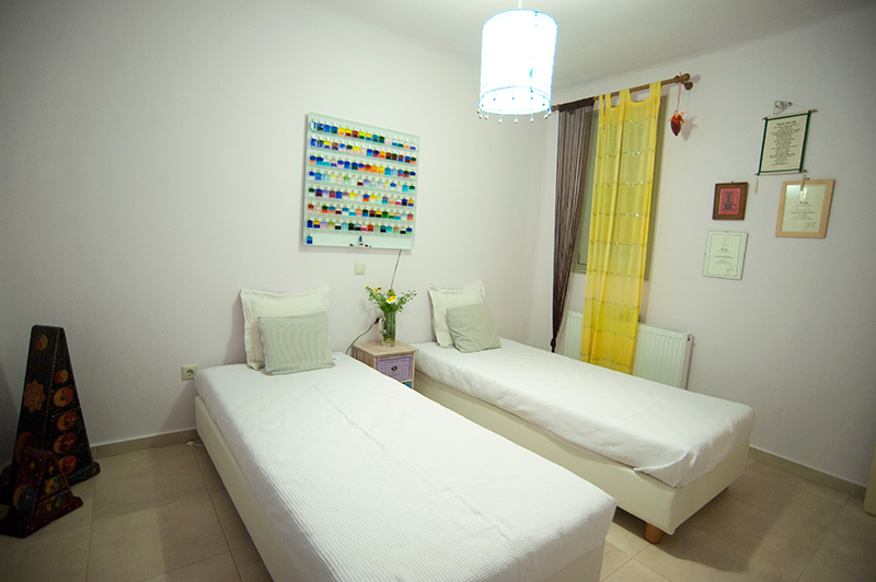 Twin bedroom easily connected to become a double bed and Veranda with access to the pool are