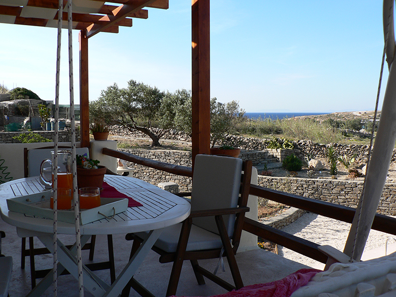 A wooden pergola creates a cool shade so you can sit and enjoy the view to the port of Parikia.