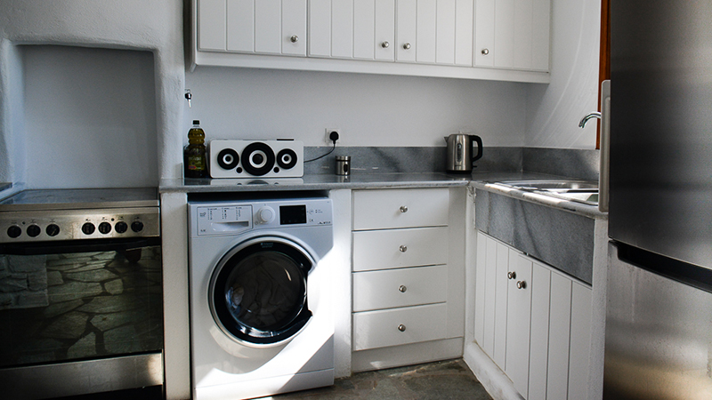 Open kitchen with washing machine, fridge, freezer, vitroceramic stove, microwave oven, toaster