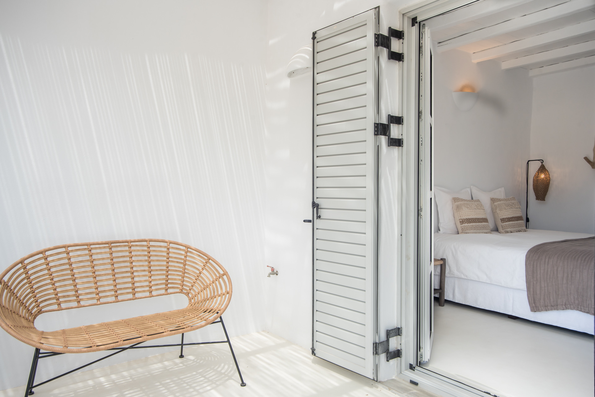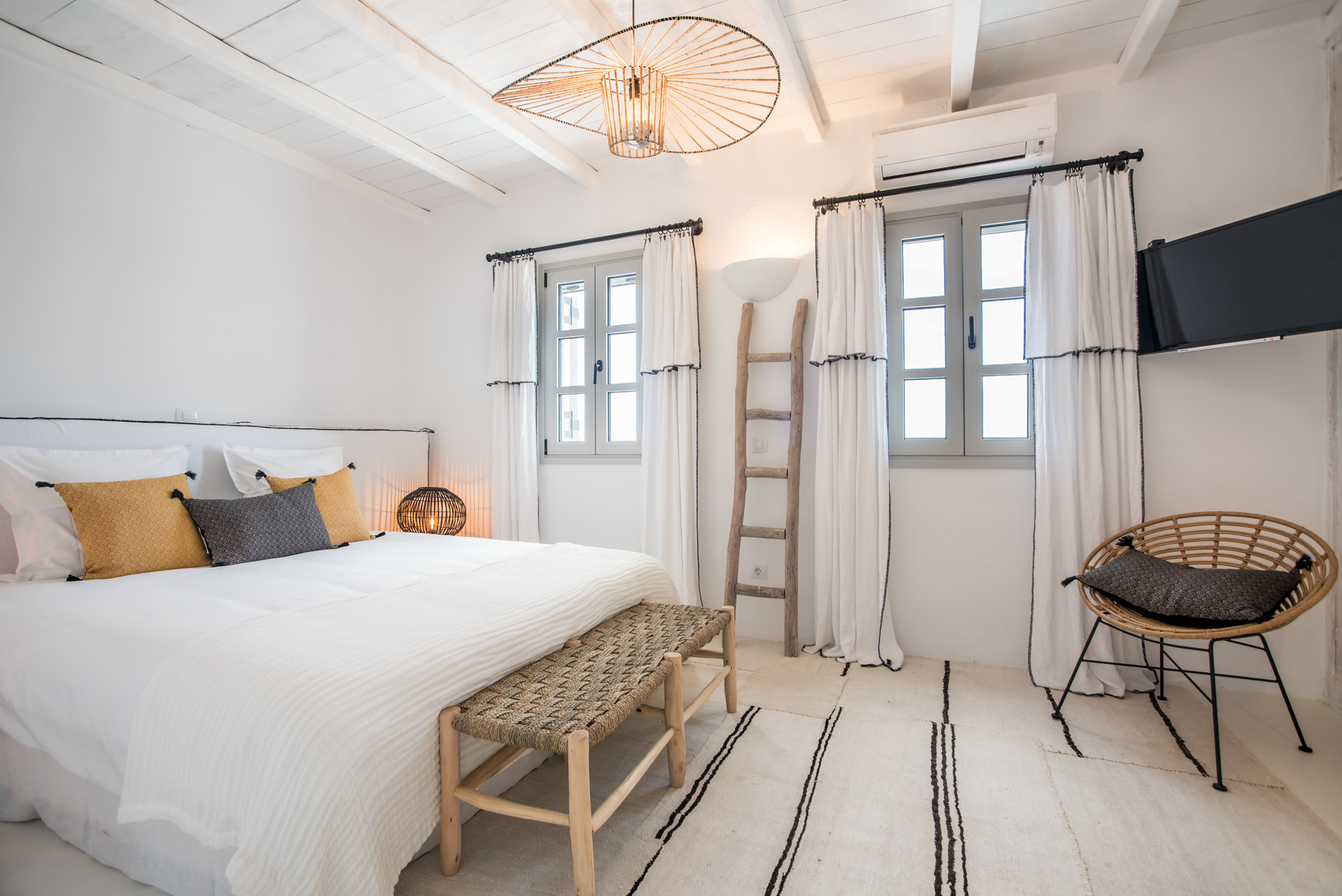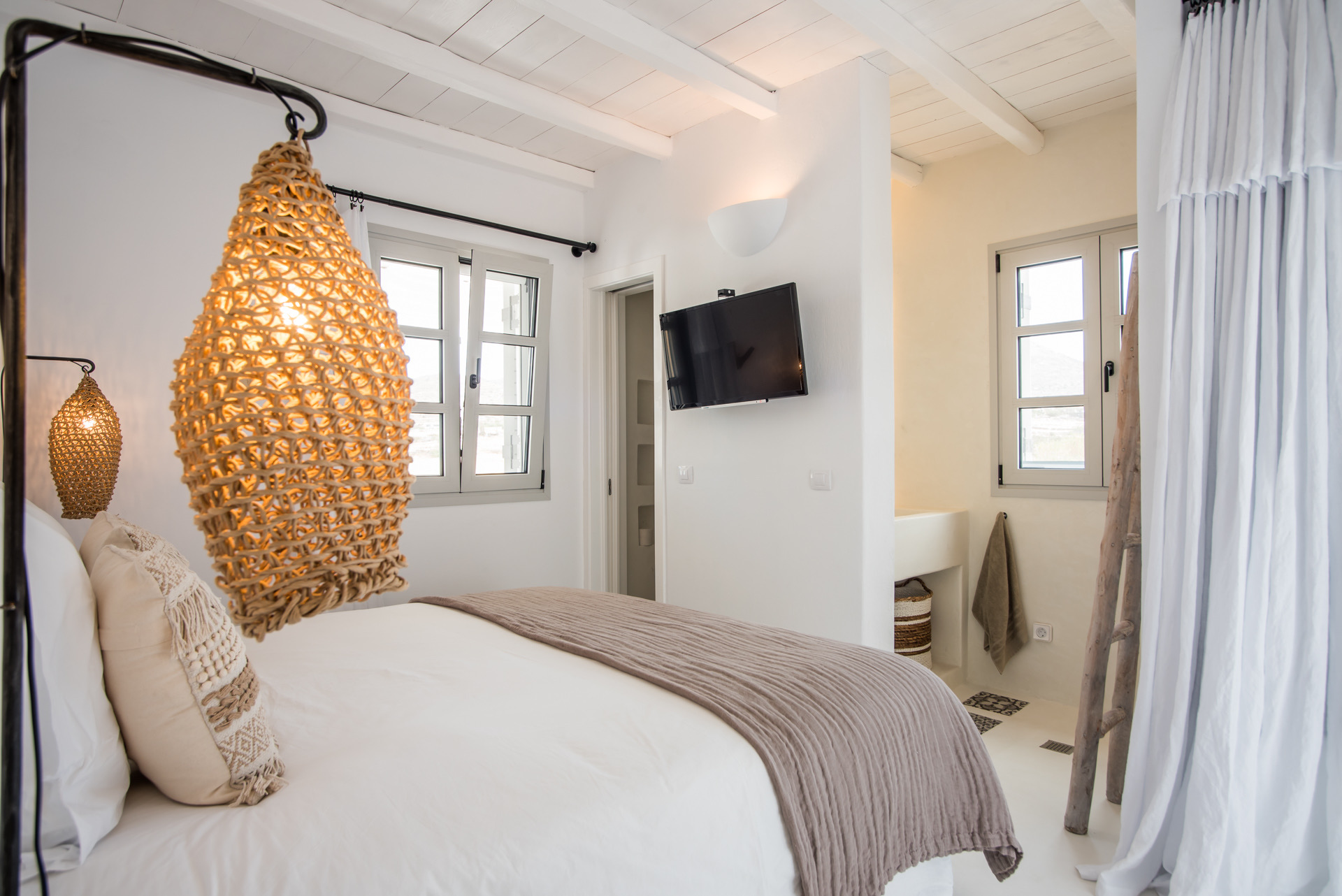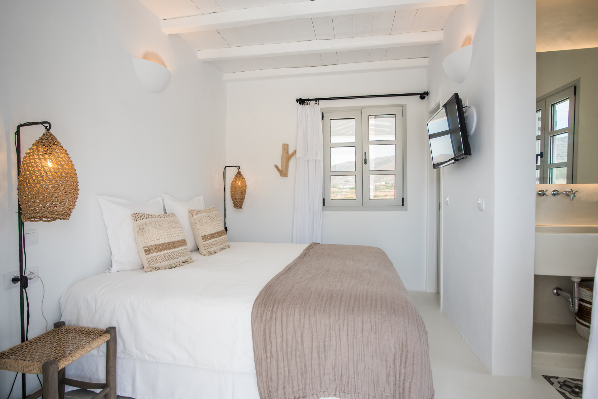 The interiors have been designed and furnished with great taste in white and brown tones, noble and refined materials. Small touches of wood and wicker bring this traditional and rustic chic side of the Cyclades. All the inviting and warm rooms have private bathrooms.