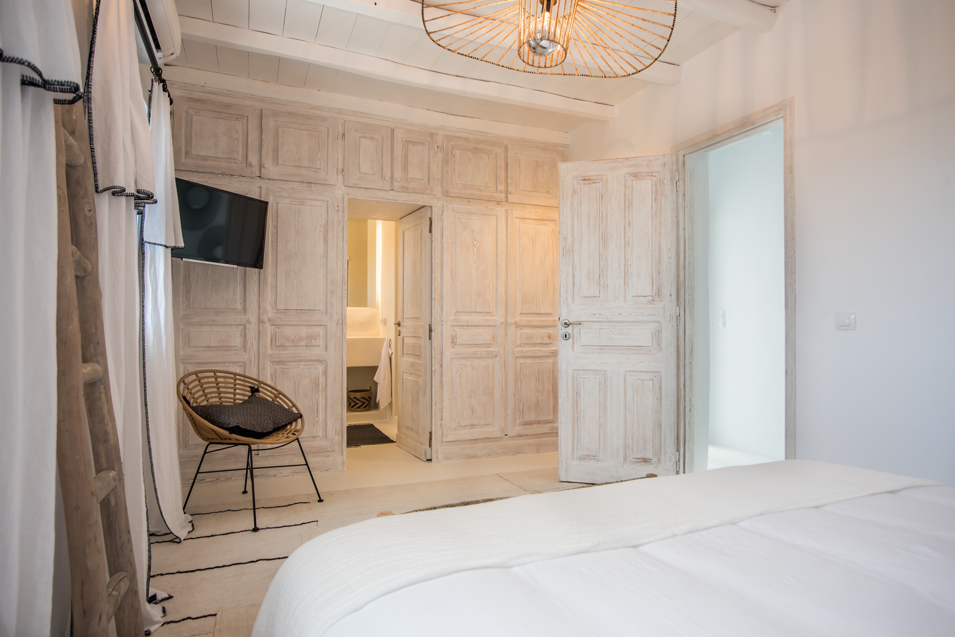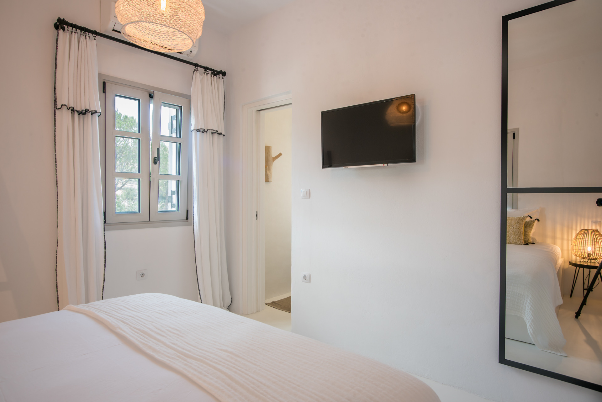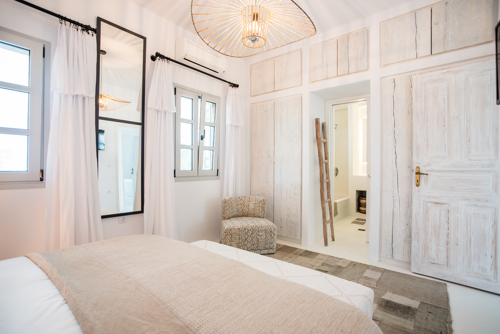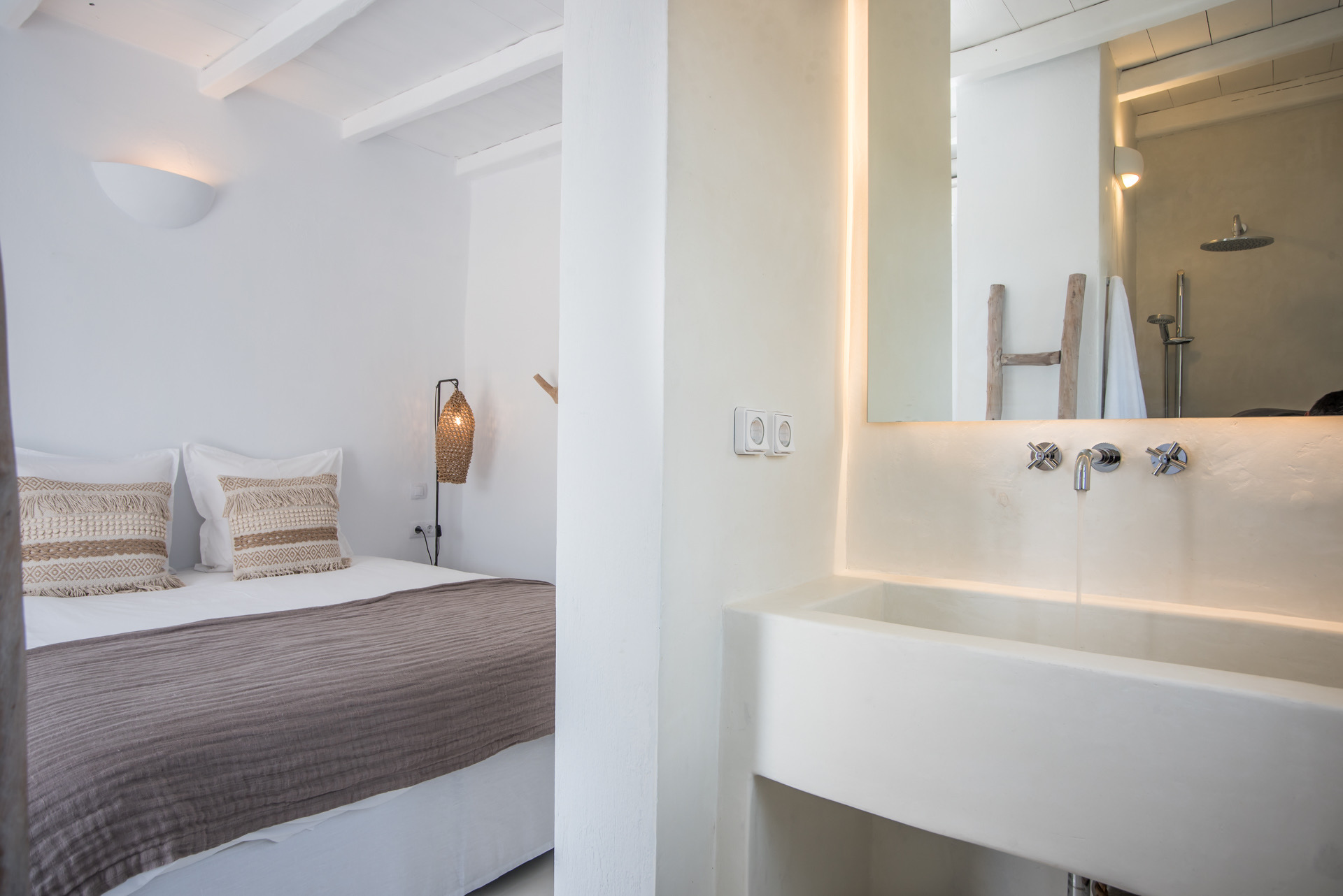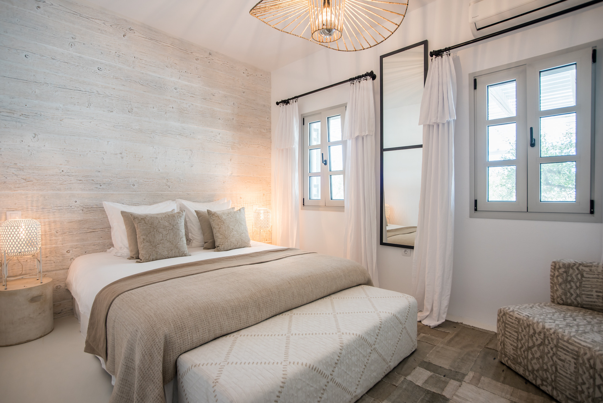 The interiors have been designed and furnished with great taste in white and brown tones, noble and refined materials. Small touches of wood and wicker bring this traditional and rustic chic side of the Cyclades. All the inviting and warm rooms have private bathrooms.