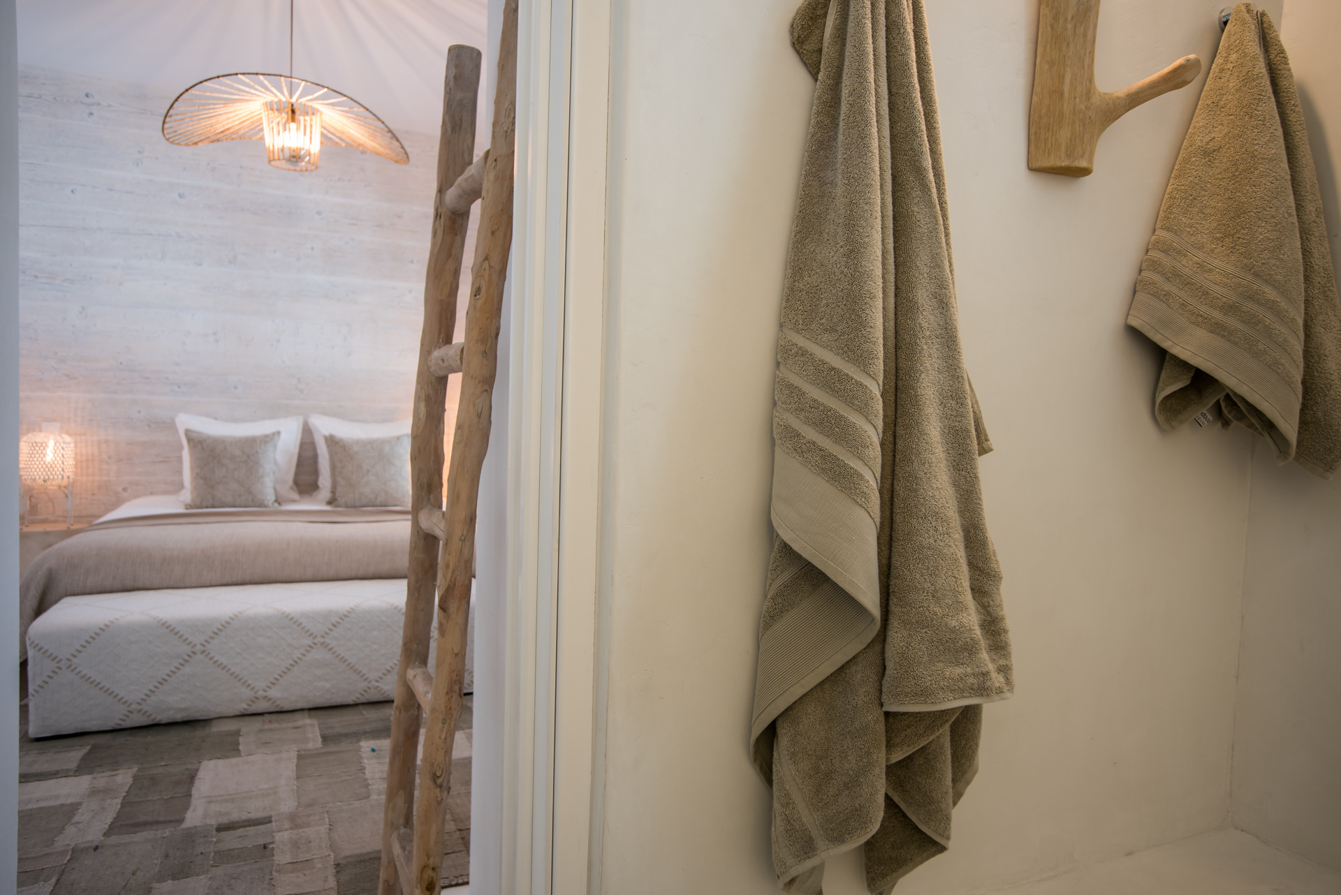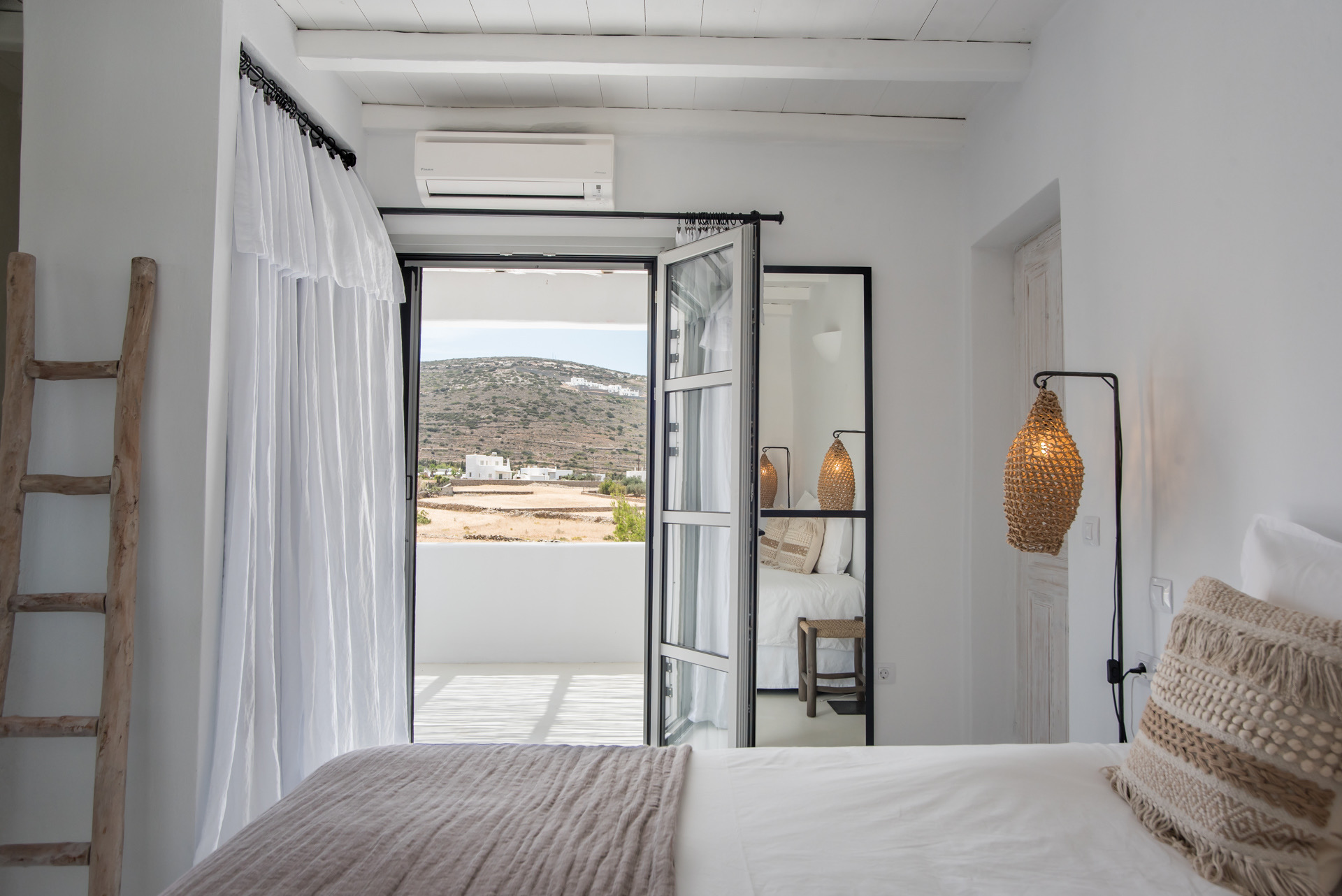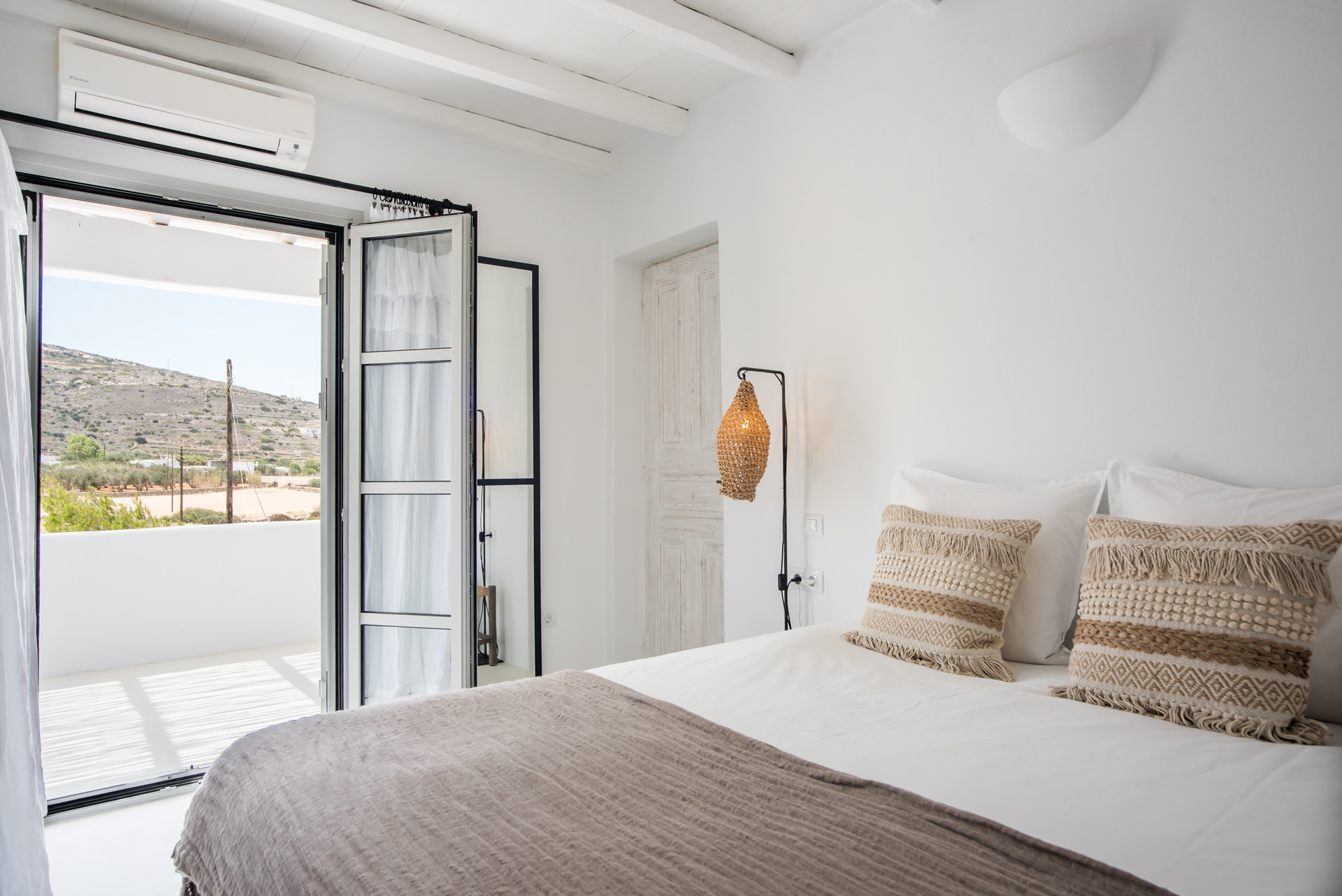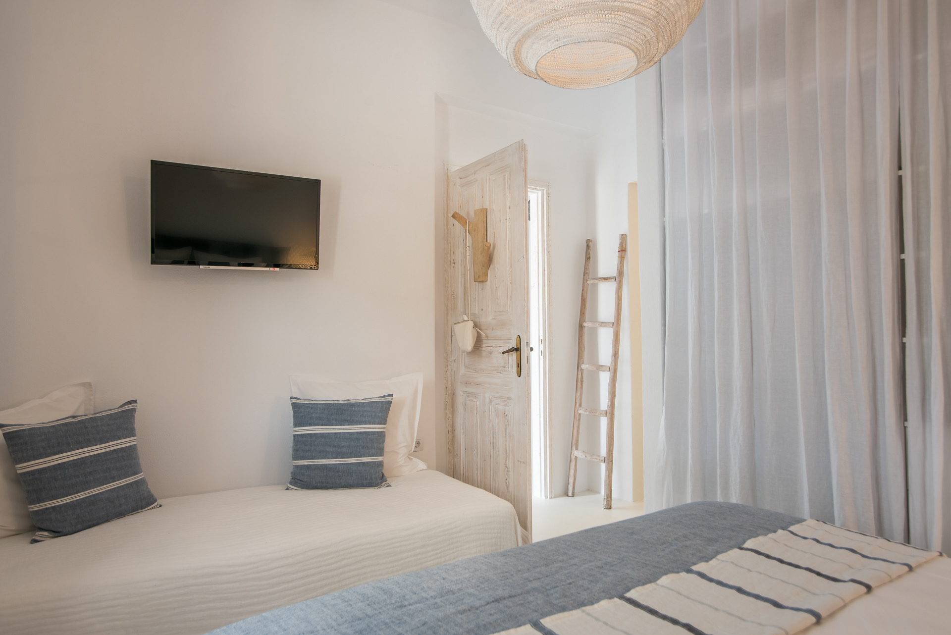 The interiors have been designed and furnished with great taste in white and brown tones, noble and refined materials. Small touches of wood and wicker bring this traditional and rustic chic side of the Cyclades. All the inviting and warm rooms have private bathrooms.