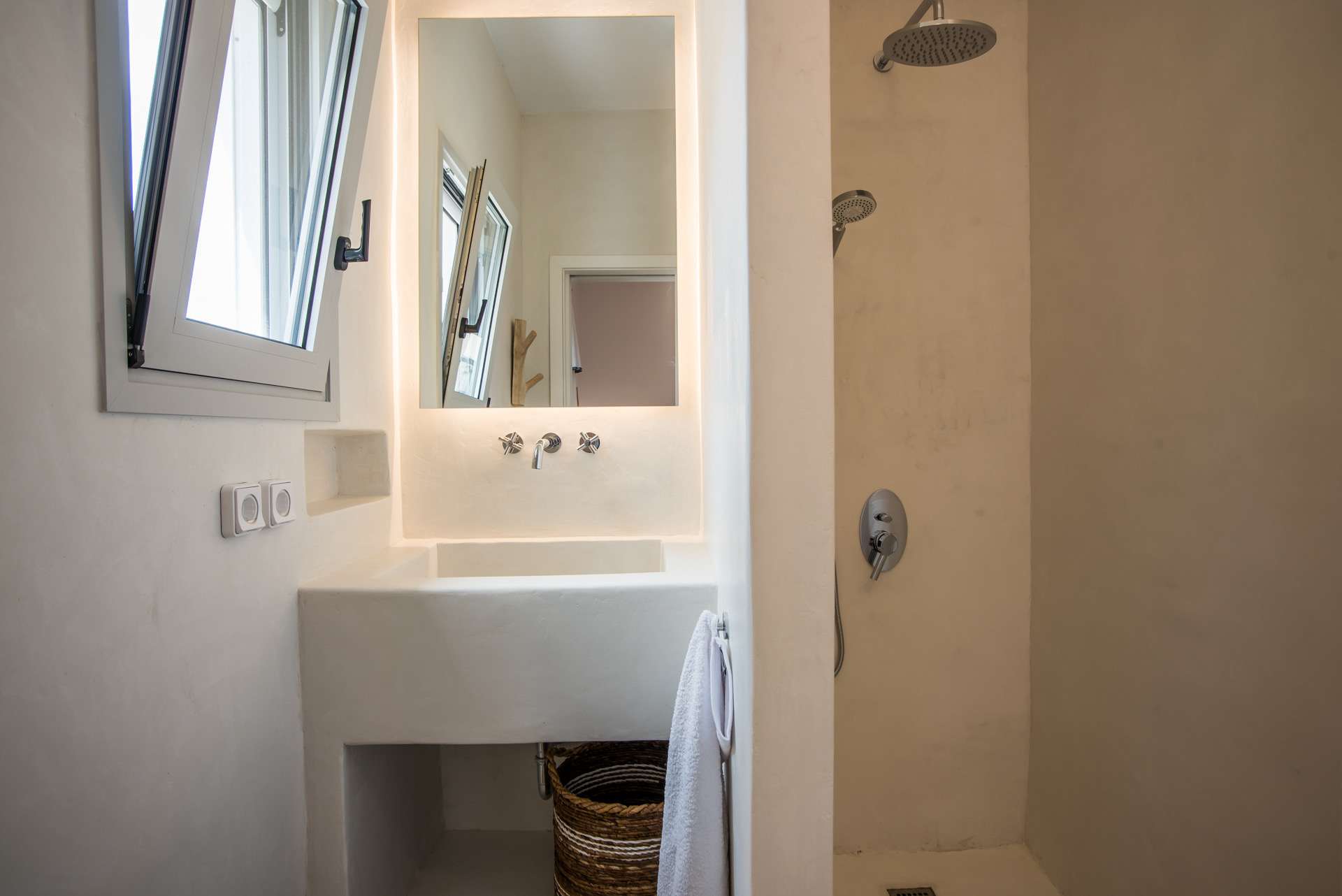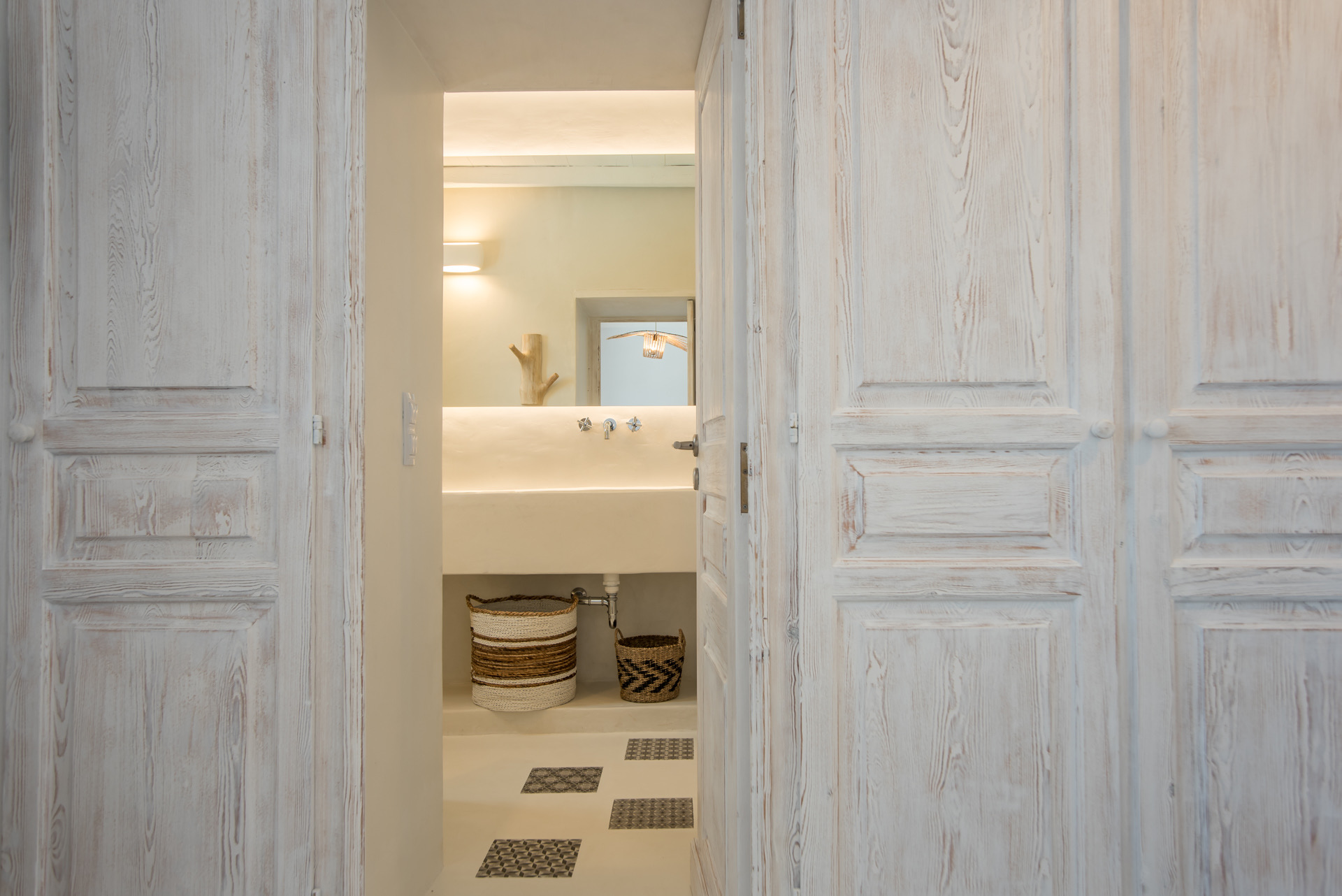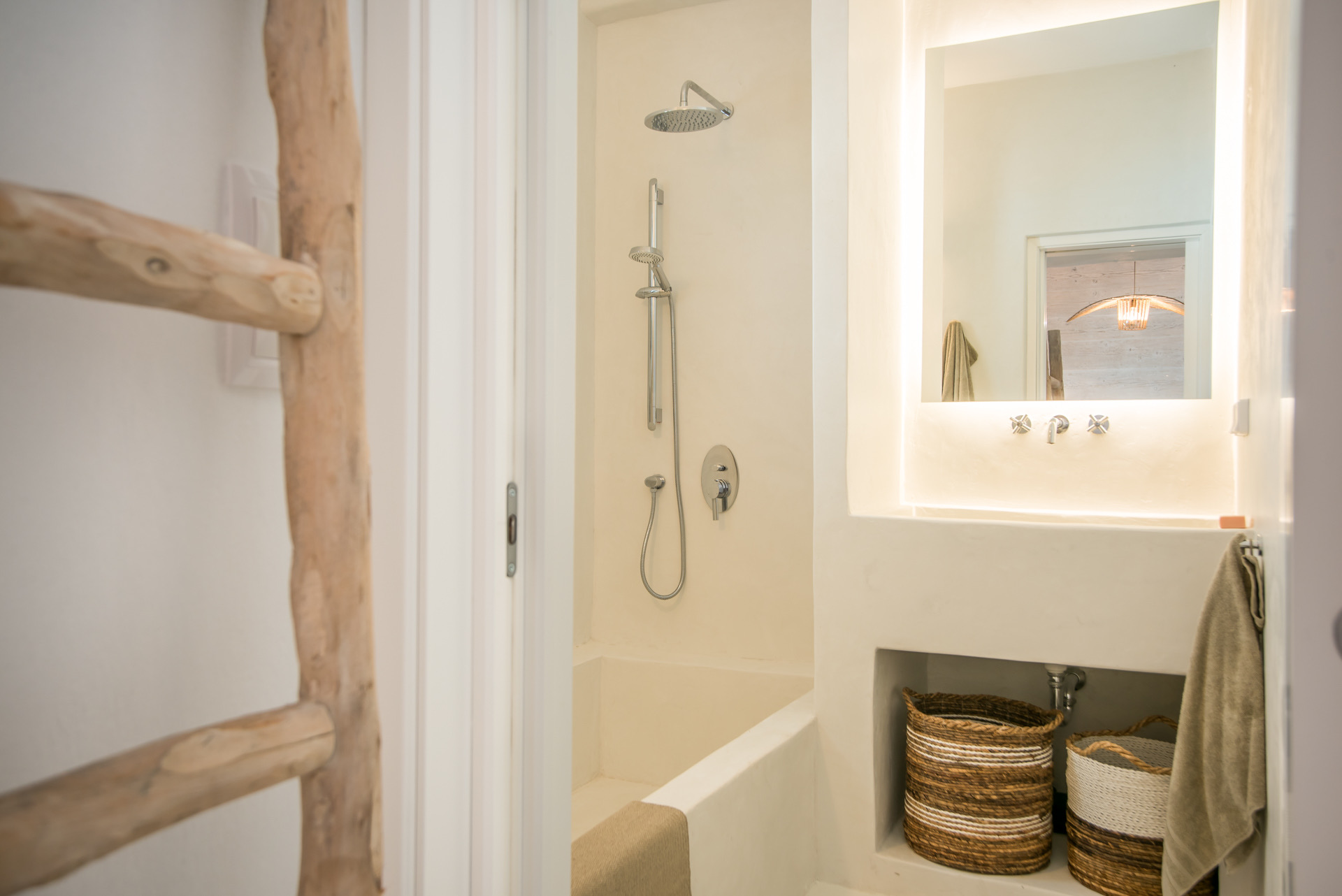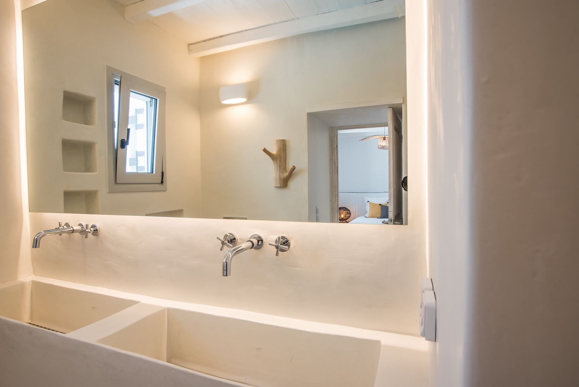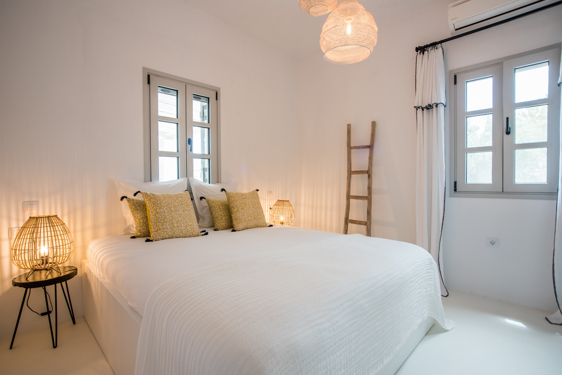 The interiors have been designed and furnished with great taste in white and brown tones, noble and refined materials. Small touches of wood and wicker bring this traditional and rustic chic side of the Cyclades. All the inviting and warm rooms have private bathrooms.