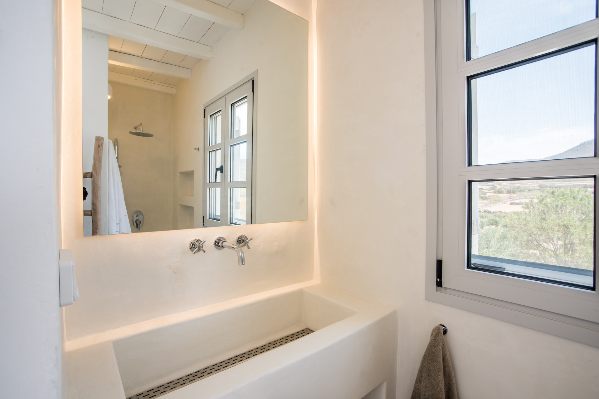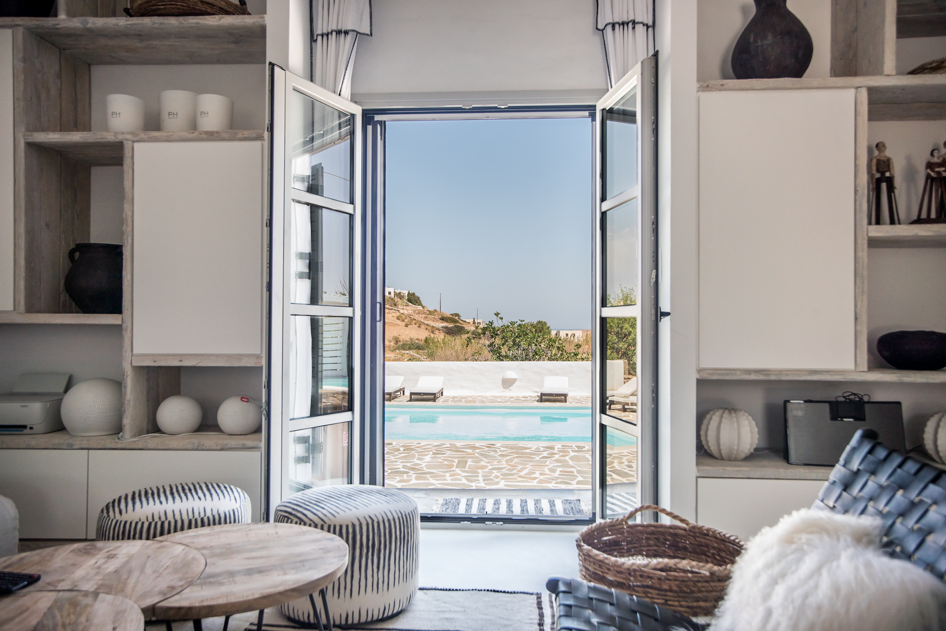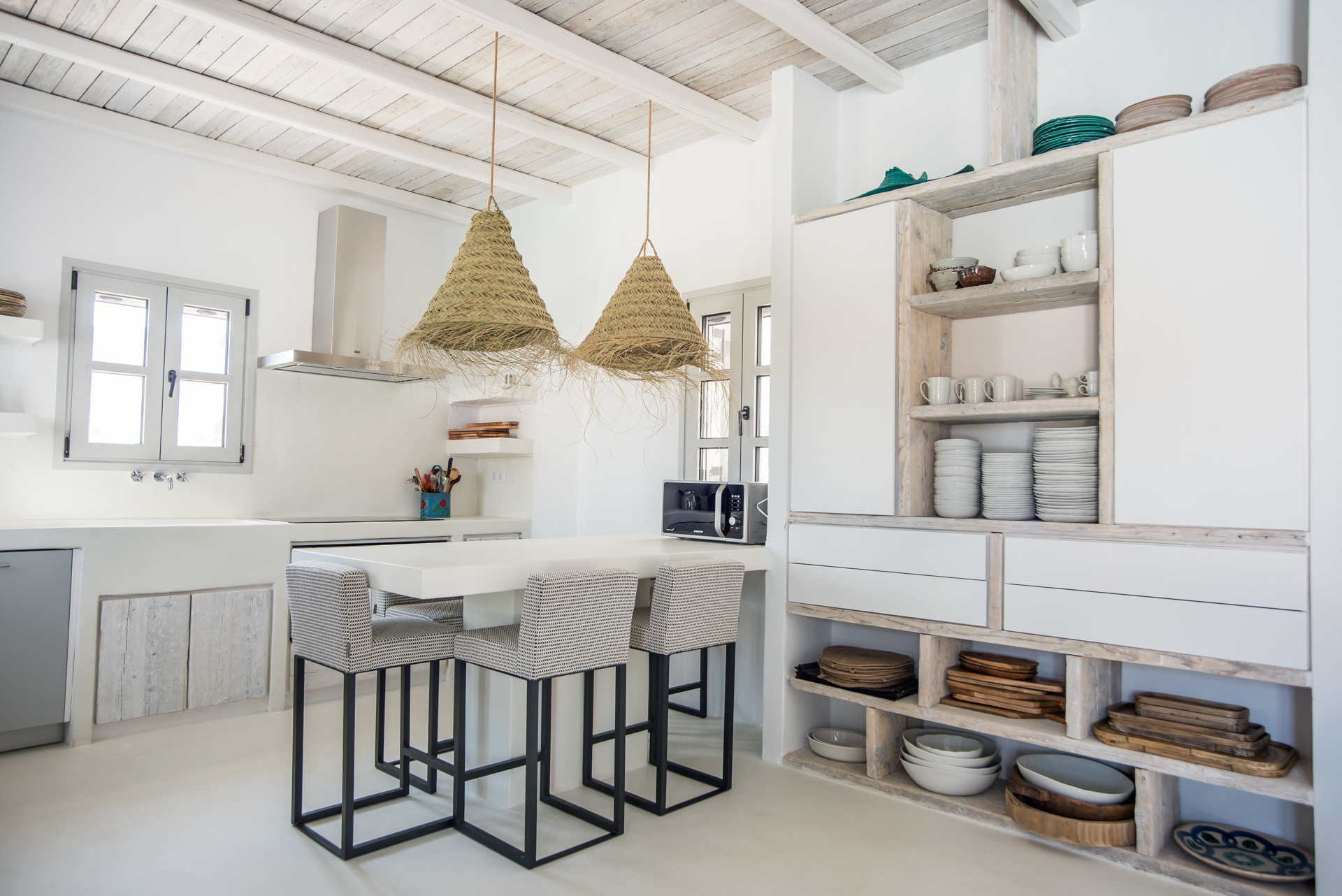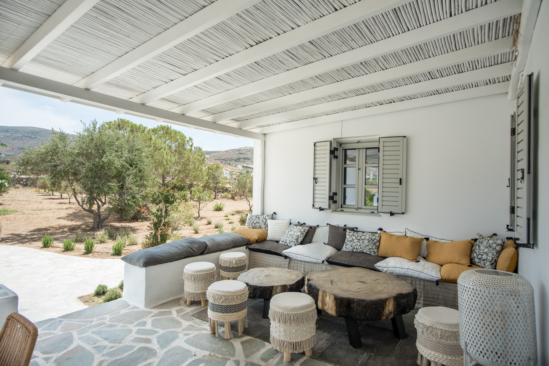 The interiors have been designed and furnished with great taste in white and brown tones, noble and refined materials. Small touches of wood and wicker bring this traditional and rustic chic side of the Cyclades. All the inviting and warm rooms have private bathrooms.