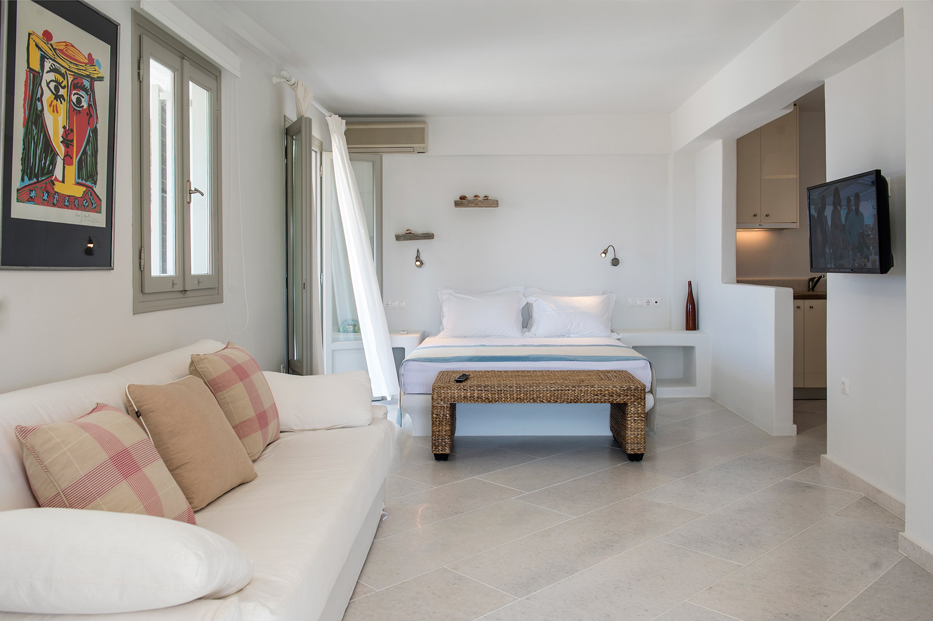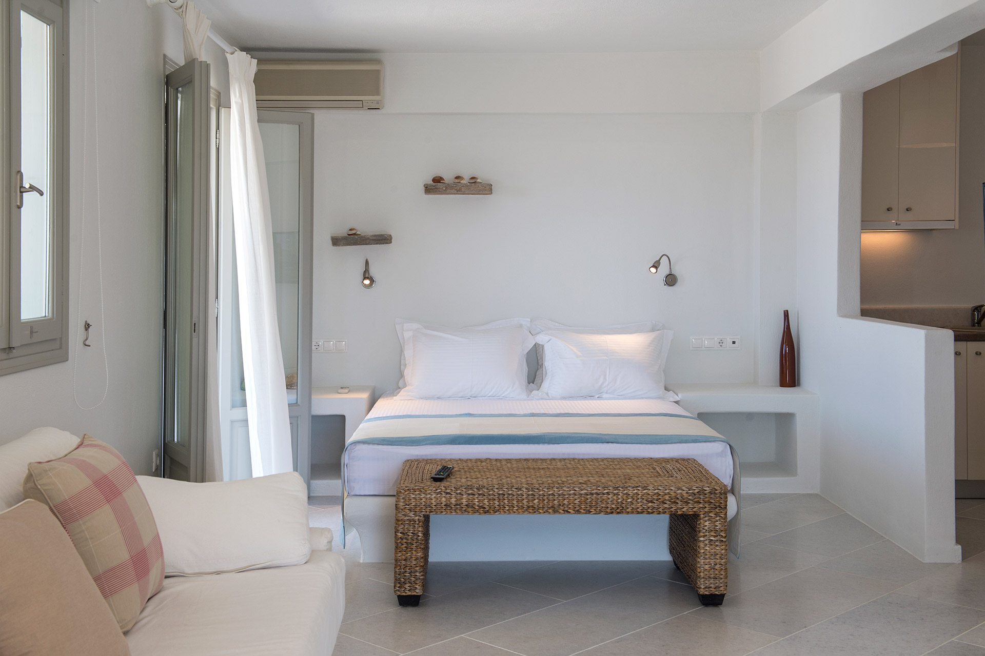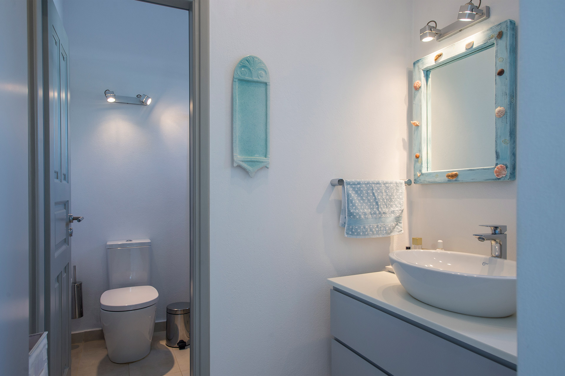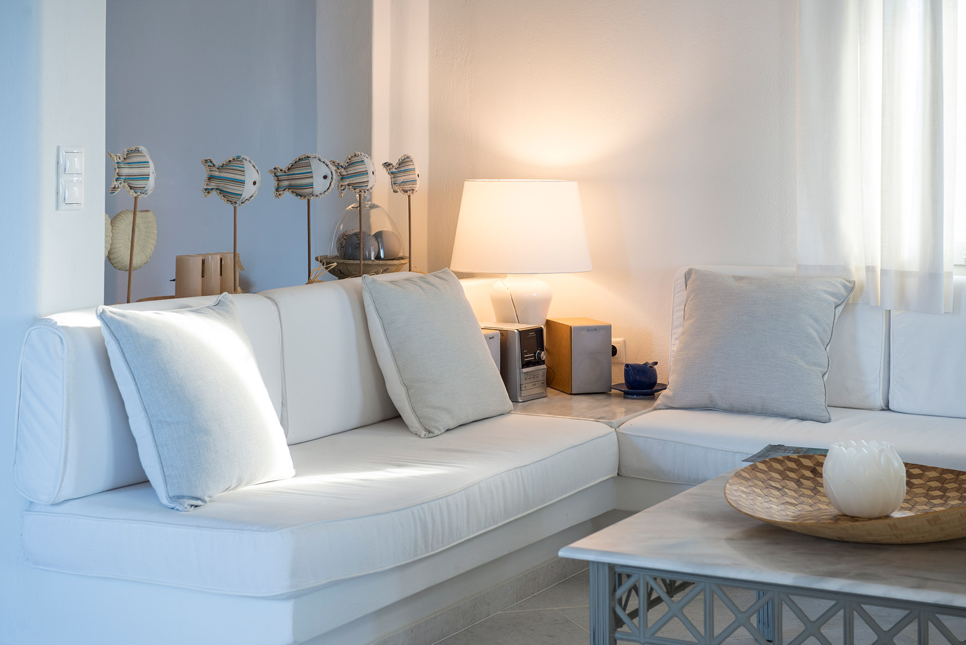 The villa has a superb view over the bay of Parikia and the countryside at the back of the house which can be admired from the outdoor terraces arranged for relaxation or for meals. You will just have to go down the hill to the beach which is only 1 km from the villa.