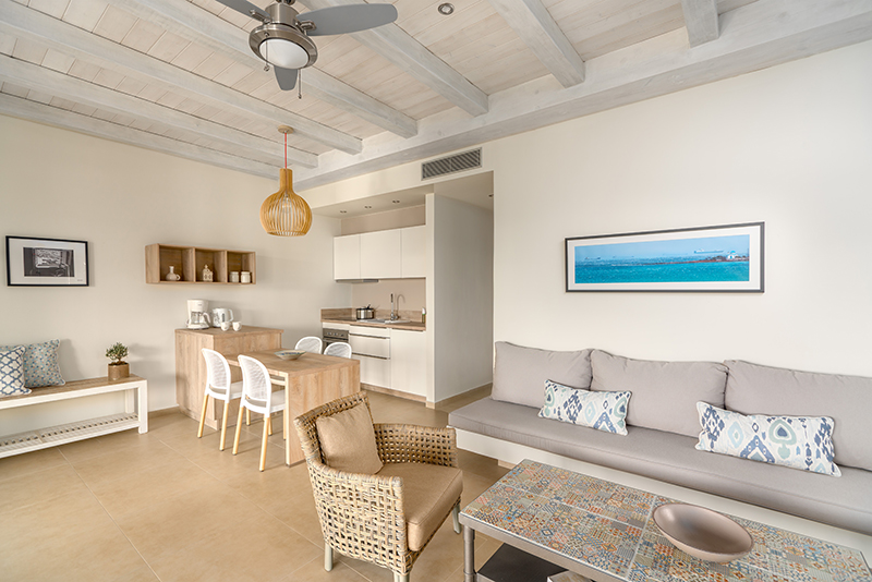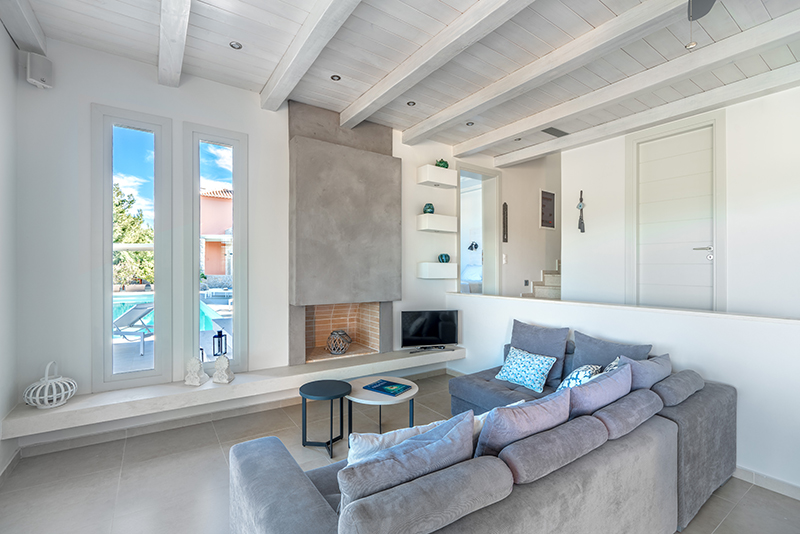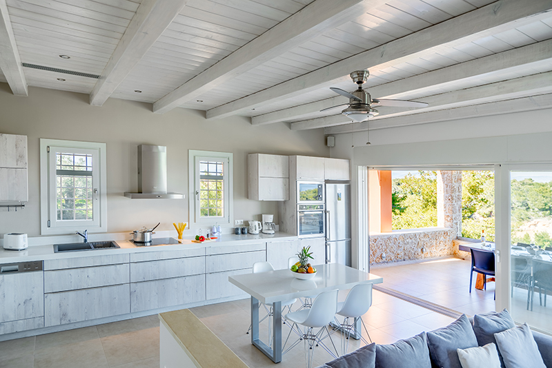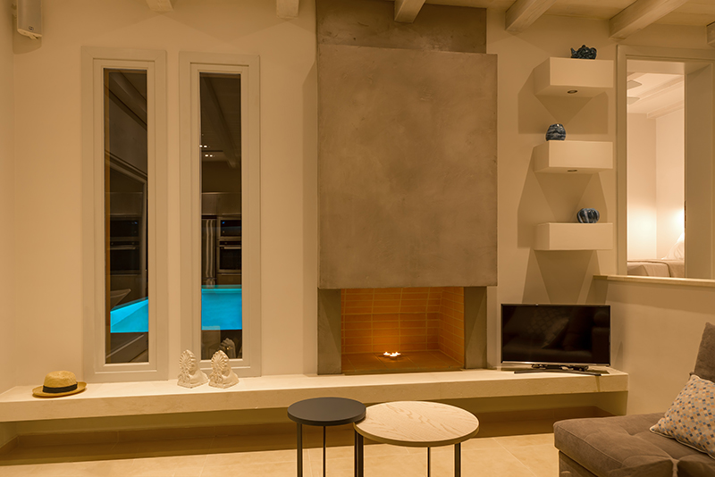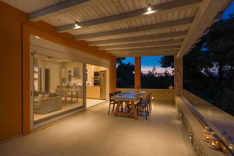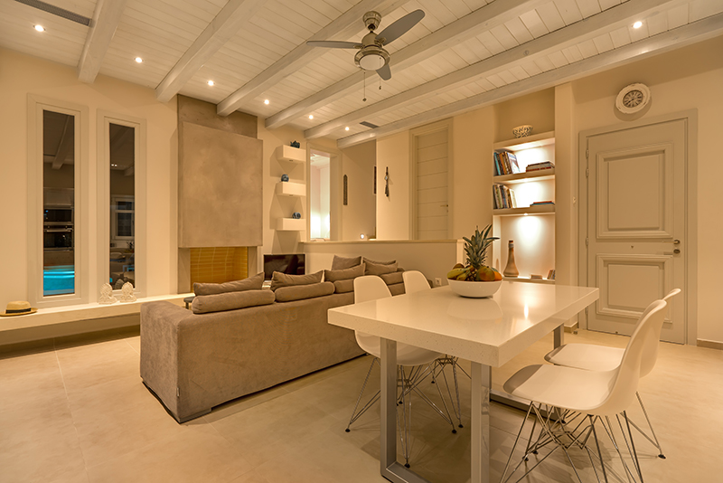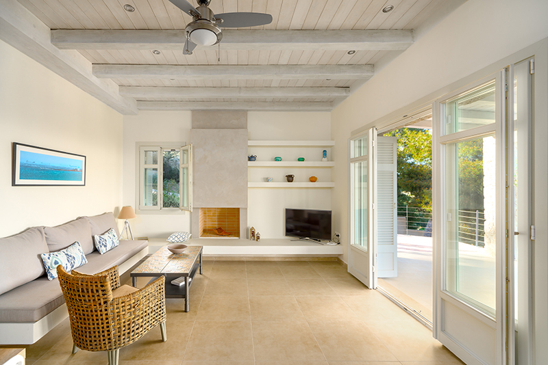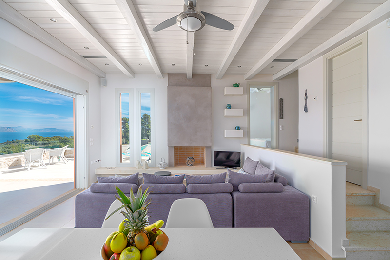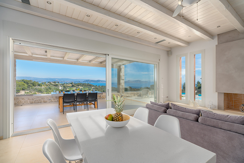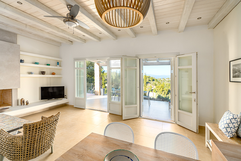 Living Room with dining area opens up to a large covered terrace ideal for breakfast and home cooked meals with awesome views to the Greek landscape and to a complex of islands and direct access to the pool with lcd tv, hifi system, satellite