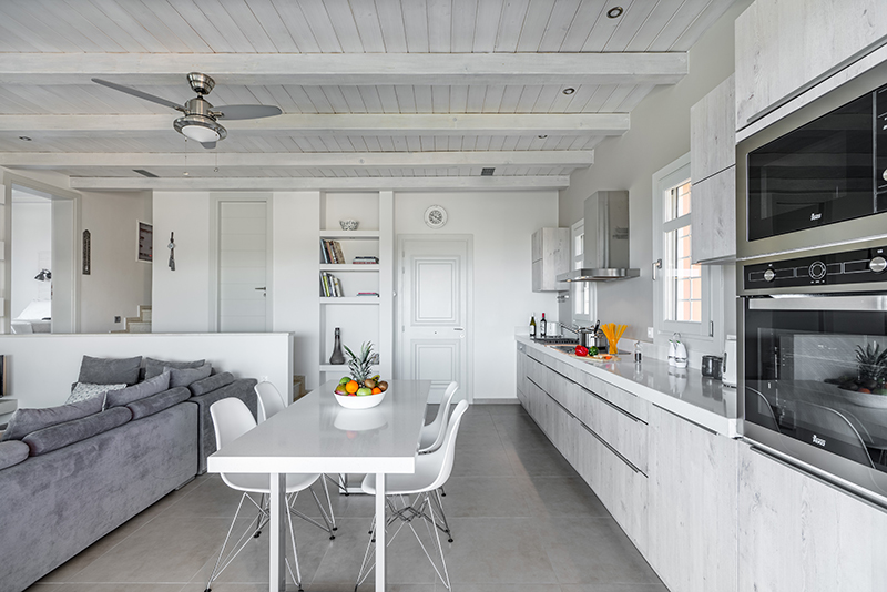 Open kitchen with dishwasher, washing machine, microwave oven, coffee machine, fridge, freezer