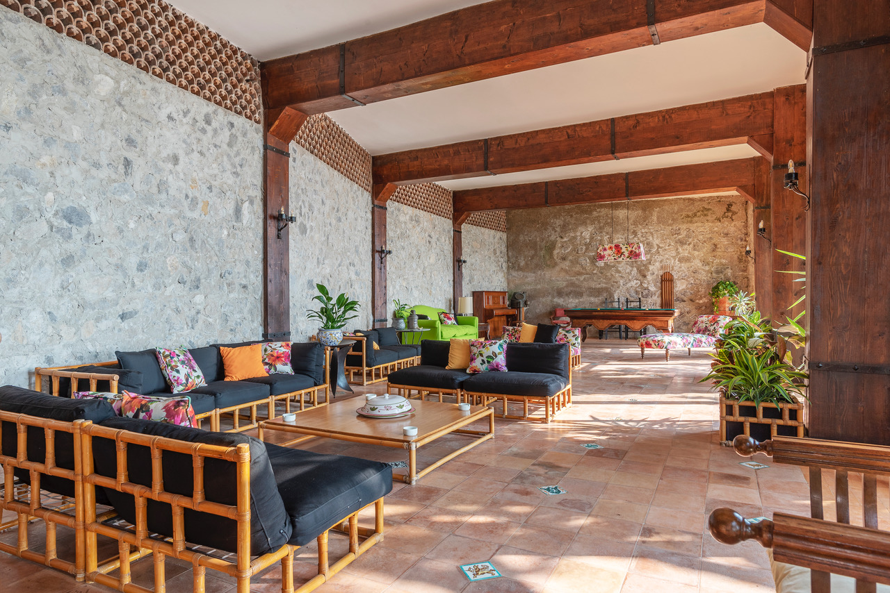 Living Room with dining area with fire place and Equipped Terrace with living room area, sea view