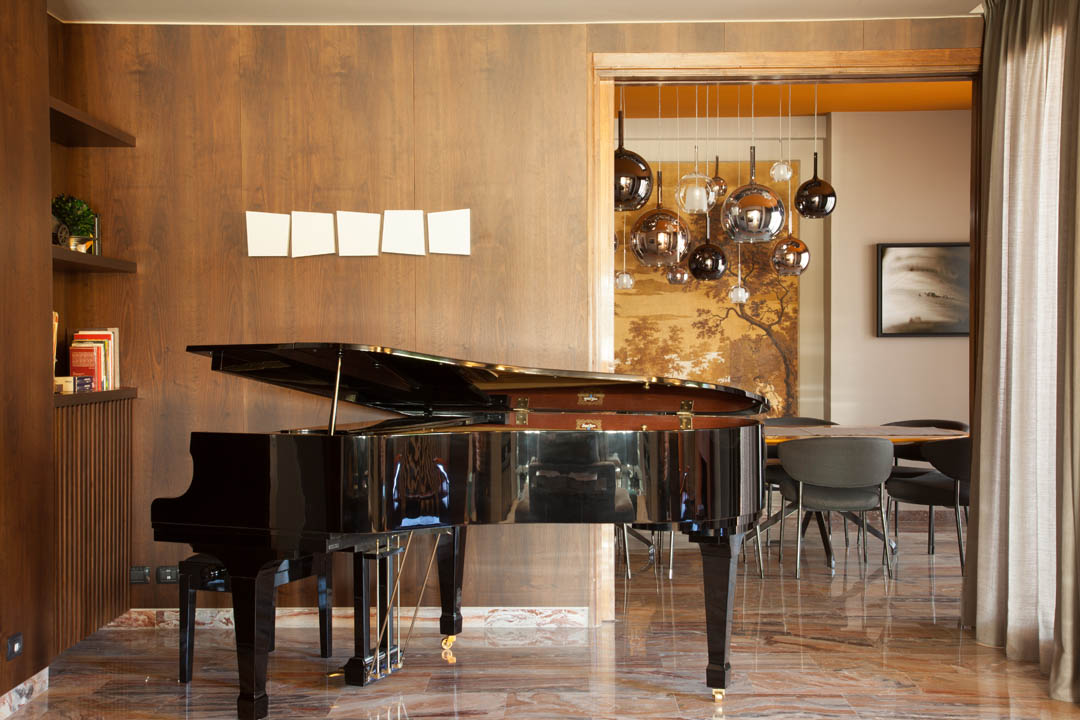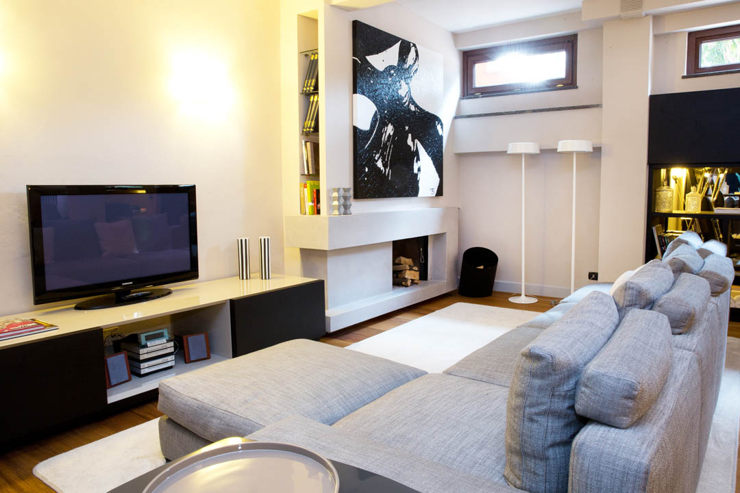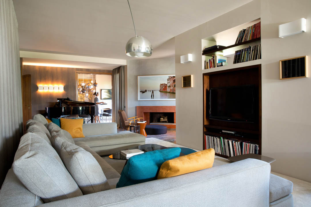 Living Room with piano, fire place, internet access, ipod dock, air conditioning, hifi system, television, satellite and Covered Terrace with living room area
