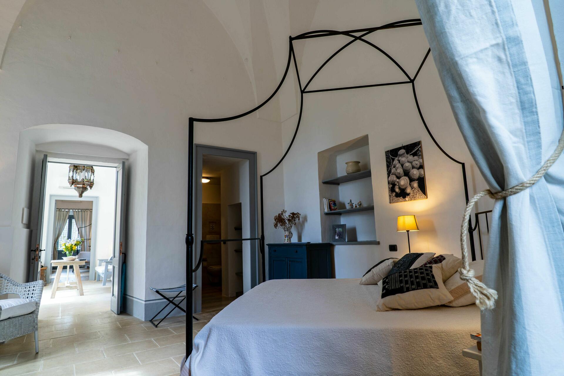 The main building features a large entrance hall decorated with a fresco by David Tremlett, a cosy lounge with a fireplace, and a kitchen opening onto a private courtyard. The bedrooms, all equipped with private bathrooms, combine simplicity and elegance. The old annex buildings have been tastefully converted and now house bright bedrooms, some with private patios, as well as a second convivial kitchen with an outdoor dining area. The surrounding area, between Ruffano and Specchia, reveals the most authentic side of lower Salento. Visitors can discover the picturesque charm of the villages, with their typical narrow streets and culinary traditions, before heading to the splendid sandy beaches and rocky coves that line the coast between Gallipoli and Otranto. Cultural excursions, bike rides through centuries-old olive groves, local wine tastings and lively evenings in the neighbouring villages complete the range of activities on offer, ensuring a relaxing and enriching stay.