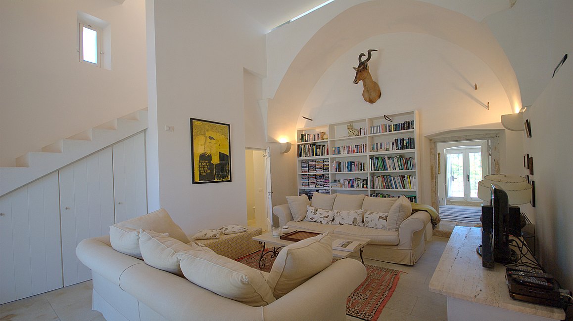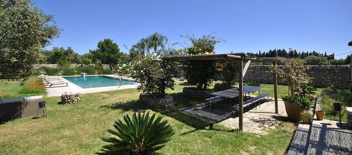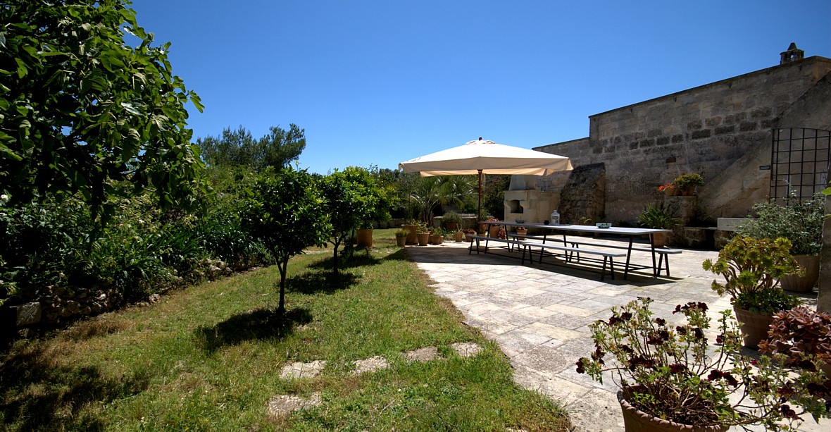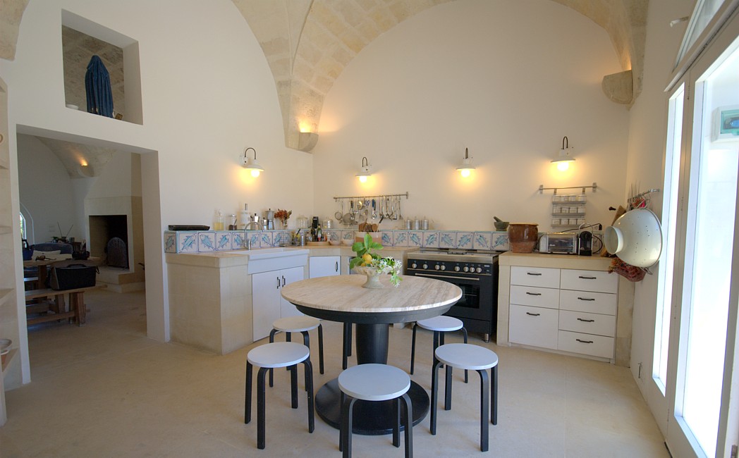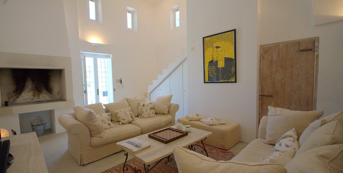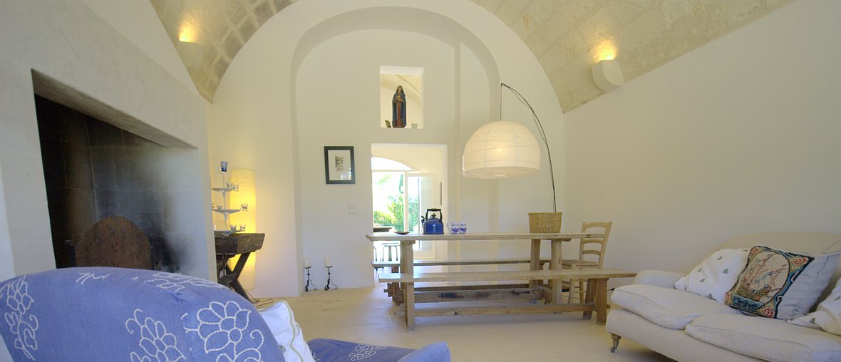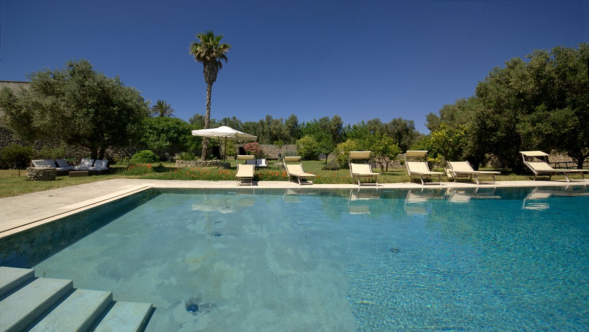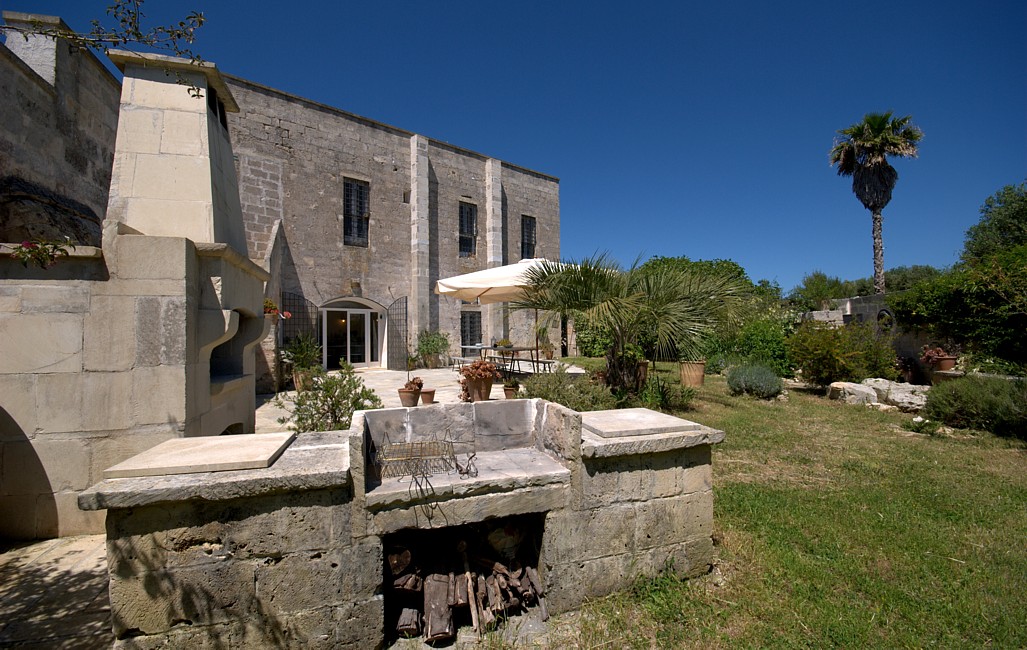 Typical “masseria” of the Salento area, in the surroundings of Otranto, and only 2 km from the sea. The house is set in a 20 000 sqm land with white dry-stone walls that are peculiar to the area. The outside is composed with a big garden and fruit trees, garden furniture and lounge chairs, a heated pool with showers, and a sheltered patio with wooden table and chairs, a barbeque and a summer kitchen. The villa has been restored with lots of elegance and soberness, using the local Lecce stone, the “pietra Leccese”, but also antics and artifacts.