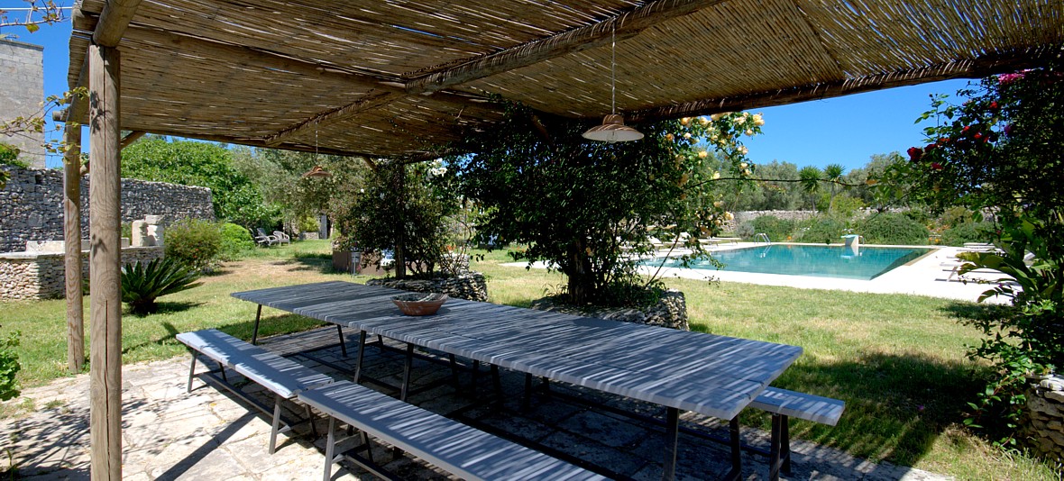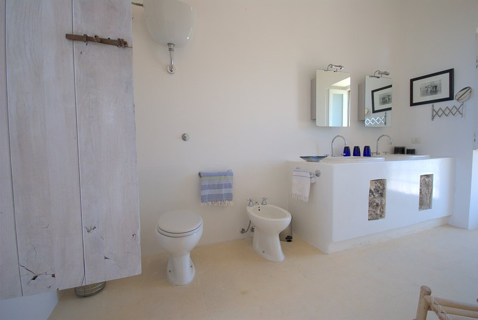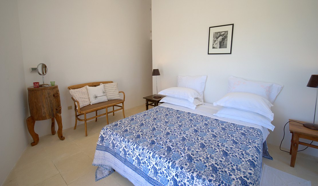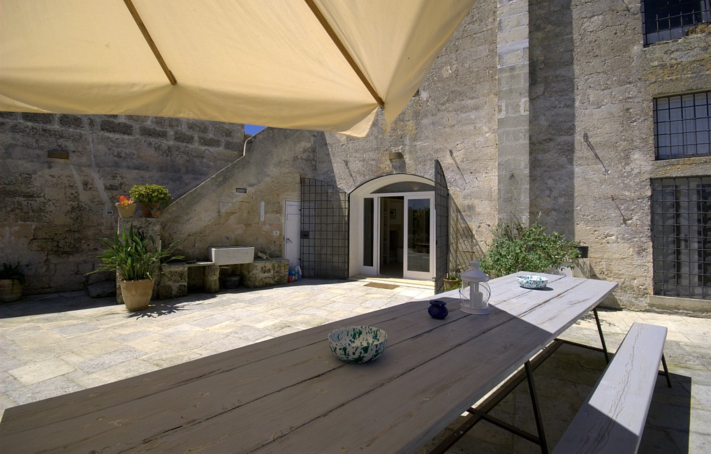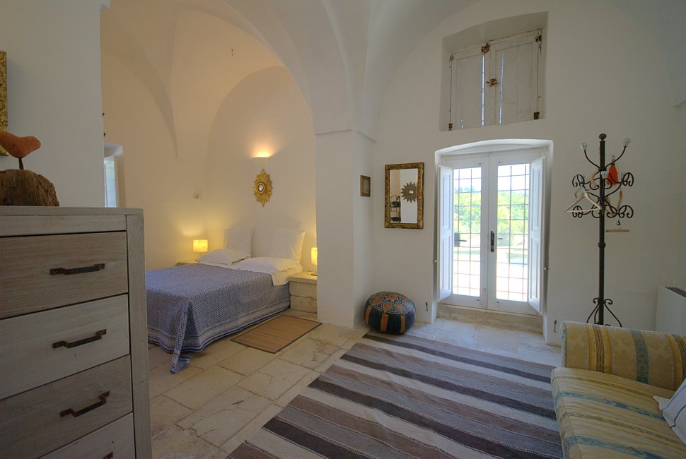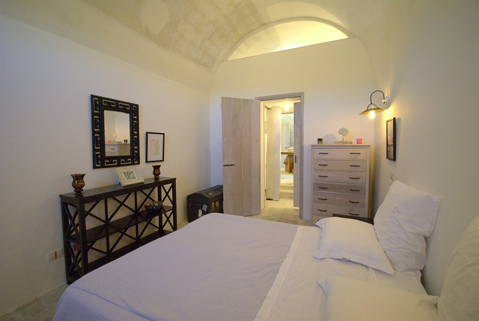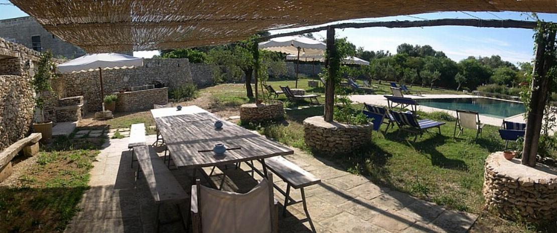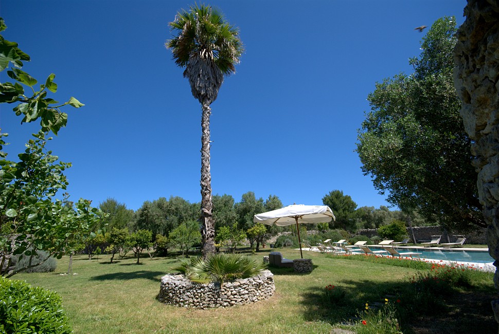 Typical “masseria” of the Salento area, in the surroundings of Otranto, and only 2 km from the sea. The house is set in a 20 000 sqm land with white dry-stone walls that are peculiar to the area. The outside is composed with a big garden and fruit trees, garden furniture and lounge chairs, a heated pool with showers, and a sheltered patio with wooden table and chairs, a barbeque and a summer kitchen. The villa has been restored with lots of elegance and soberness, using the local Lecce stone, the “pietra Leccese”, but also antics and artifacts.