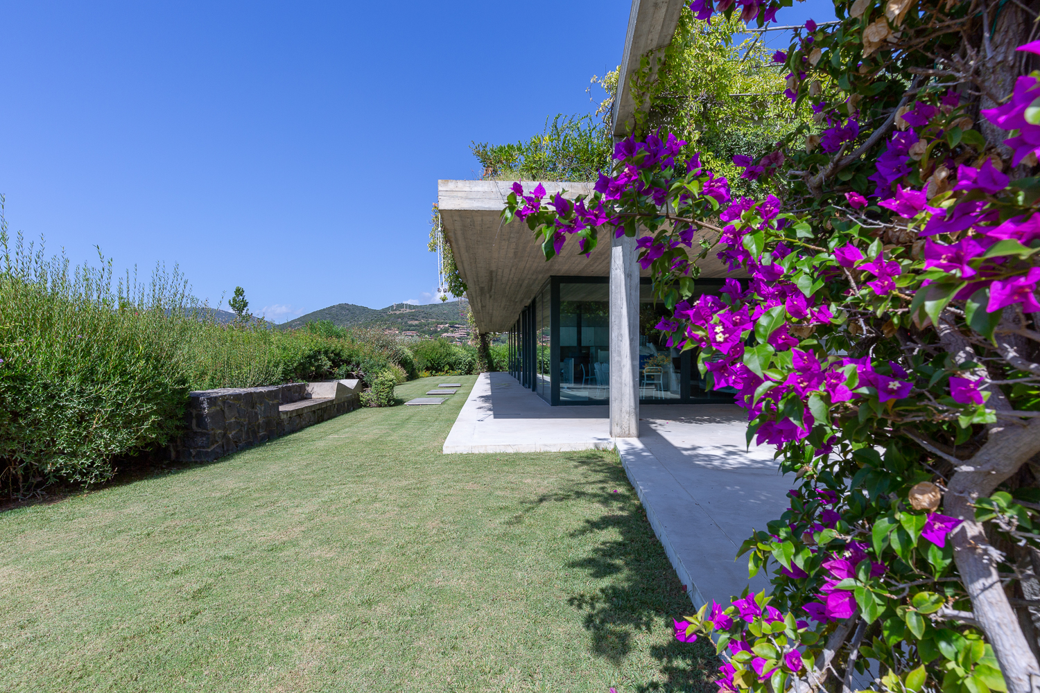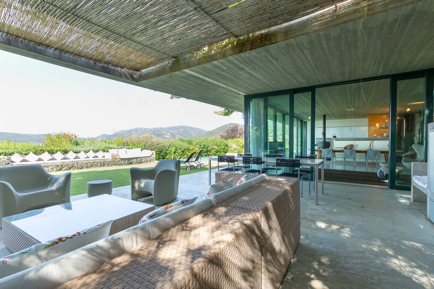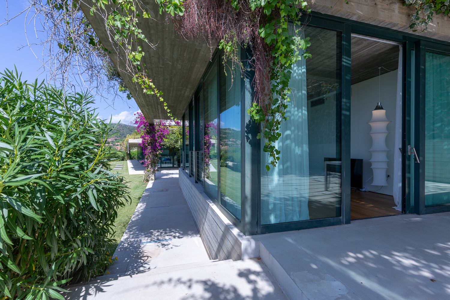 In part A you will find the kitchen and the living room, as well as 4 double bedrooms with bathrooms. In part B, 1 double bedroom, a kitchen and a living room with sea view. For part C, there are 4 other double bedrooms with a kitchen. All bedrooms have en-suite bathrooms and 8 of 9 bedrooms have direct terrace access. Perfect to accommodate up to 18 people, all its spaces are air-conditioned and offer maximum comfort for your holidays. Very modern and design, the stone of the walls contrasts with the interior and brings character to the rooms of the house. Very bright with its large openings, it has a very pleasant interior-exterior continuity. In the garden, the 14m x 4m swimming pool is arranged along the house and is decorated with a lounge area to enjoy the sun or share a moment of conviviality in the evening. The superb view of the mountain is appreciable on the entire terrace which runs along the house. Very close to the sea, you can reach the beach on foot since it is only 400 m from the villa. You will find all the shops you need for your stay nearby. This beautiful luxury villa is also very close to golf courses. At 3 min by car, you will find the Chia golf sporting club. Immersed in a splendid setting, this site is a paradise for golfers. The Is Molas golf club is 20 minutes away by car, and has a total of 27 holes. If you rather want to bask on the sand, Capana Dune Beach is quickly reachable (4 min by car). You can choose between rest or Wind Surf. Boat trips are also possible and offer a unique panorama of Sardinia.