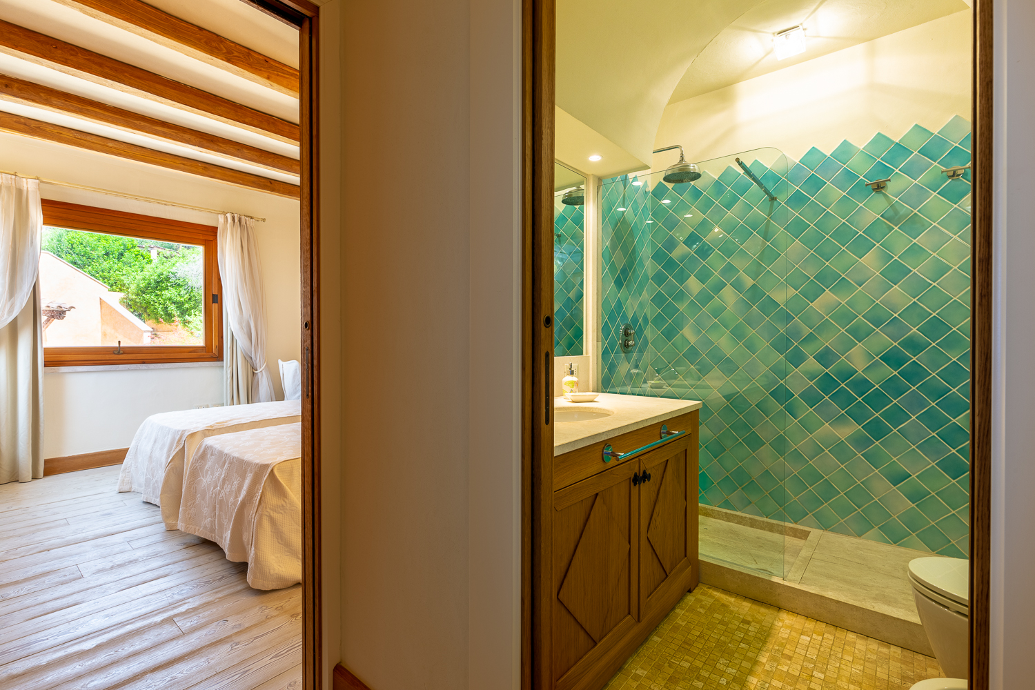 Double bedroom with pool view, garden view, sea view and Ensuite bathroom with shower