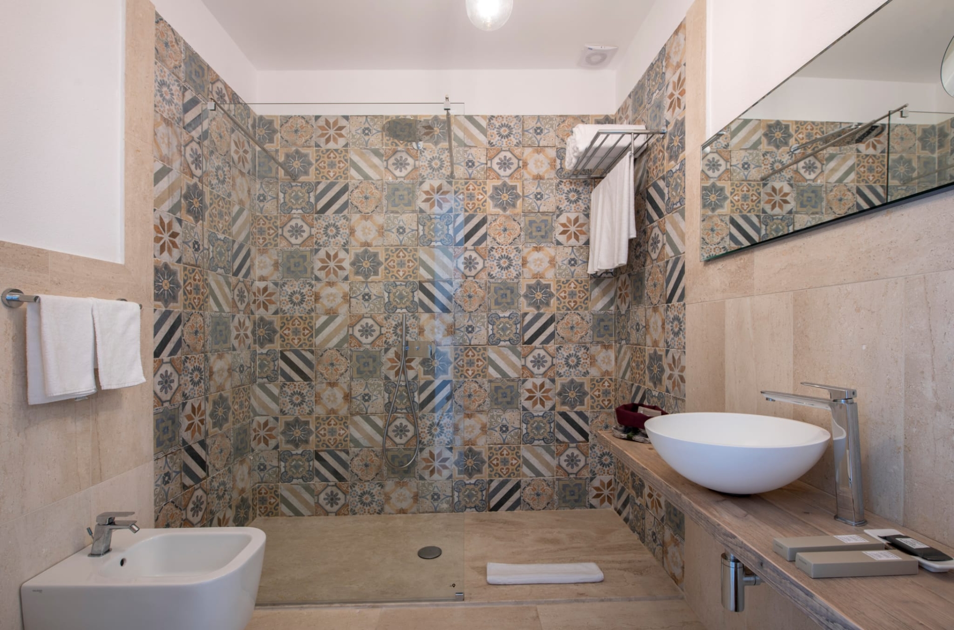 Double bedroom with television, terrace access and Ensuite bathroom with sink, shower, wc, hair dryer