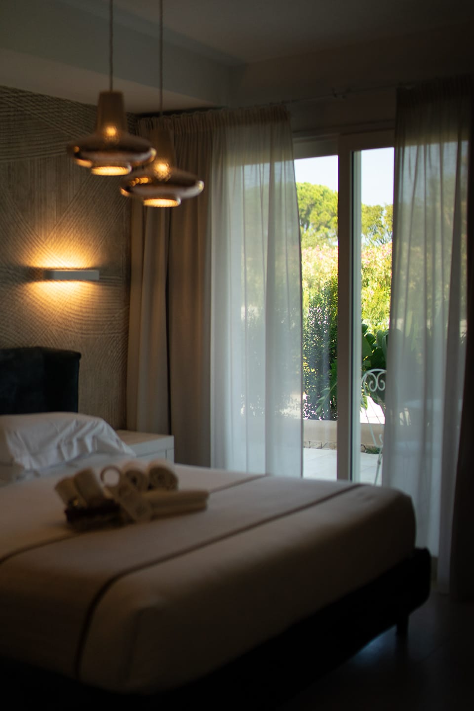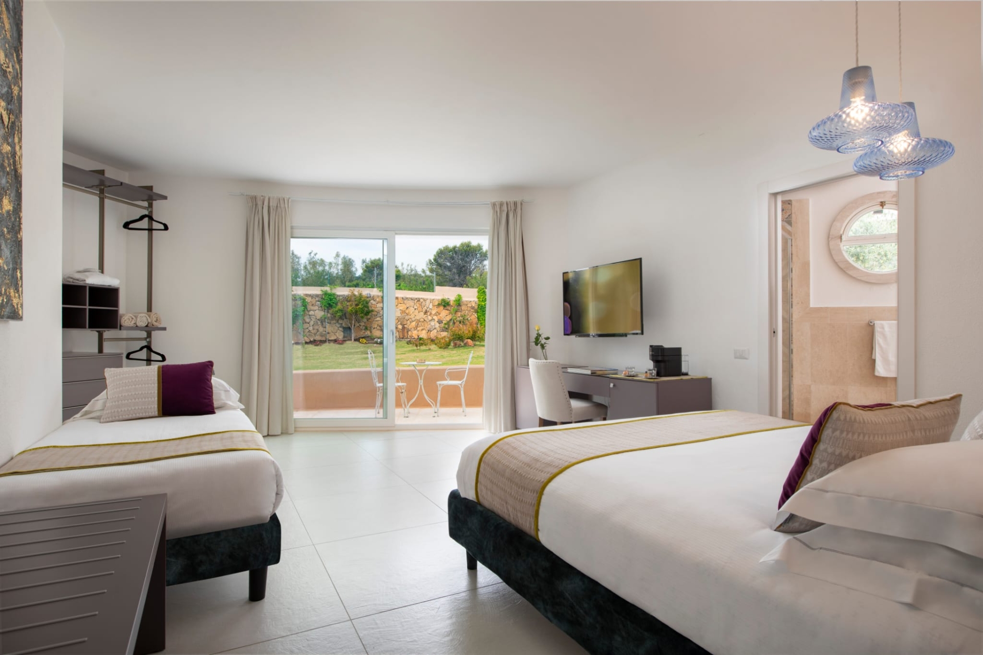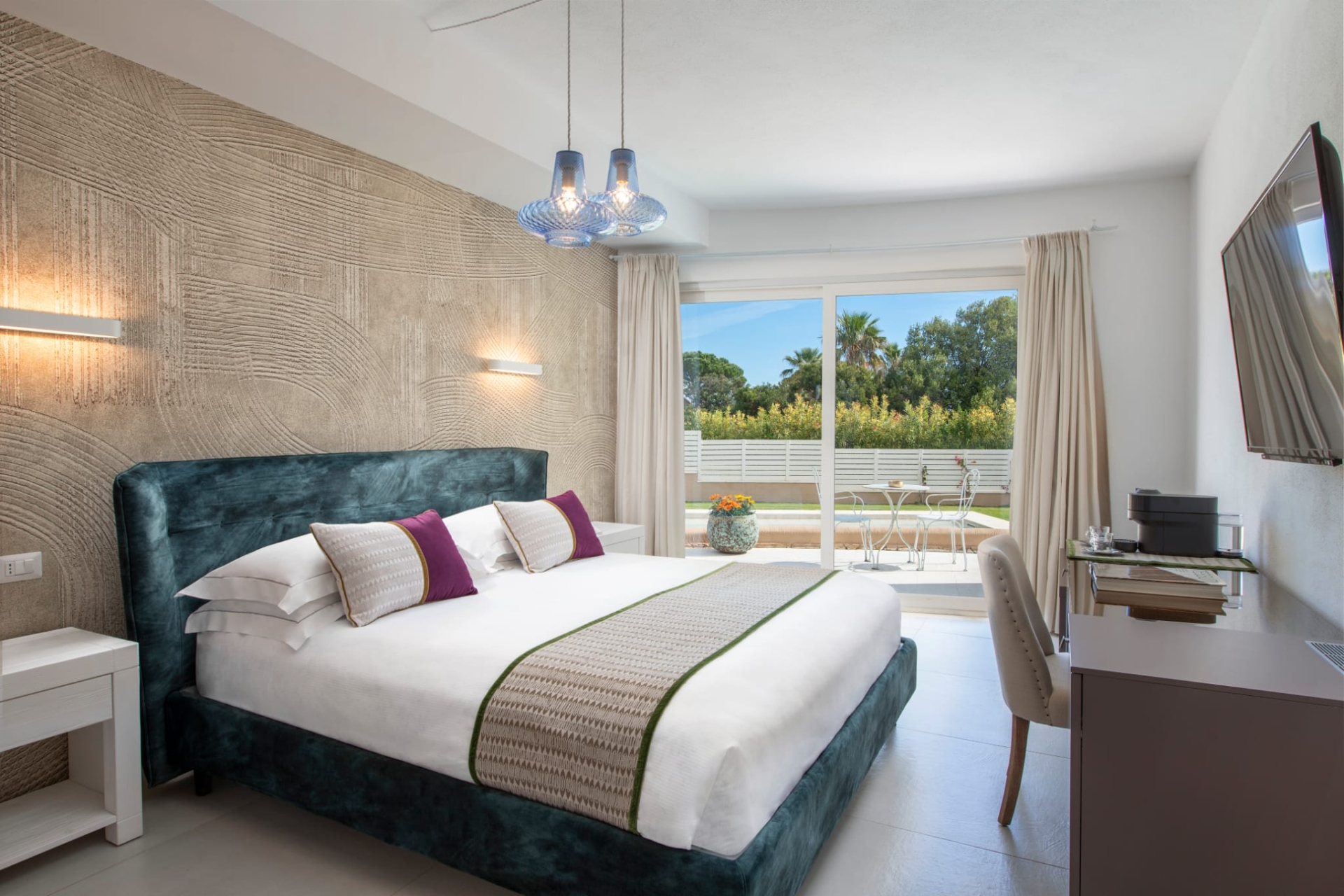 Double bedroom with terrace access, television, garden view and Ensuite bathroom with shower, sink, wc, hair dryer