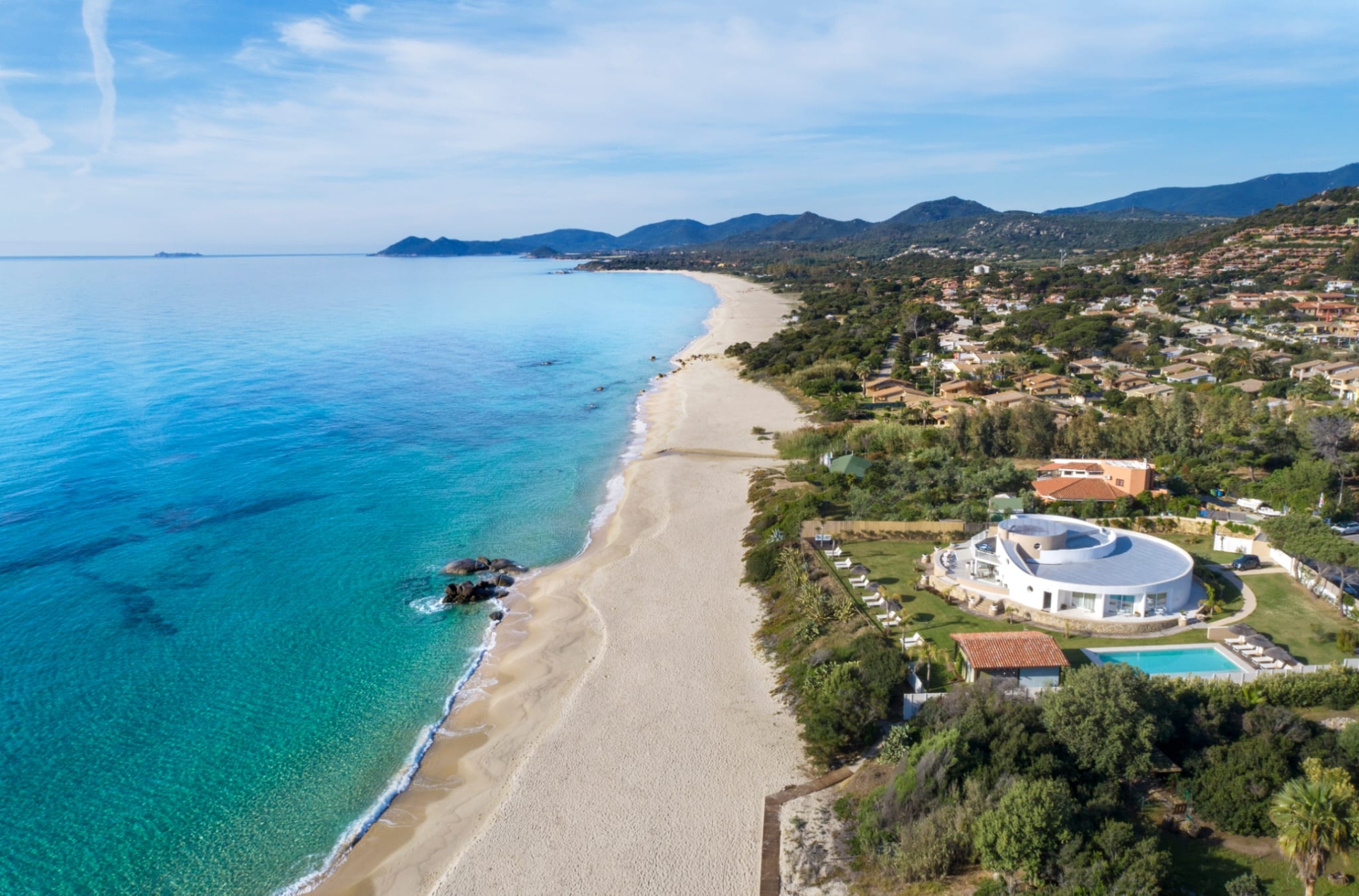 This sumptuous villa facing the beach of Costa Rei, in the south of Sardinia, offers an idyllic setting with its vast white sandy beaches bordered by a crystal-clear sea. During your stay you will enjoy the services of a chef, housekeeping staff and concierge for your absolute comfort.