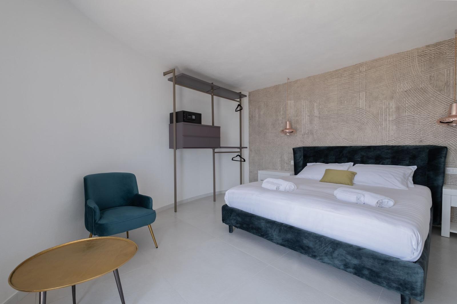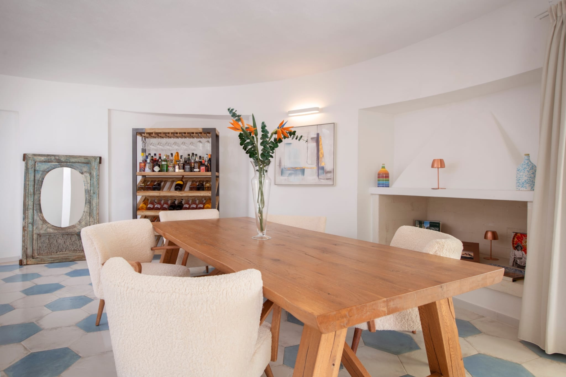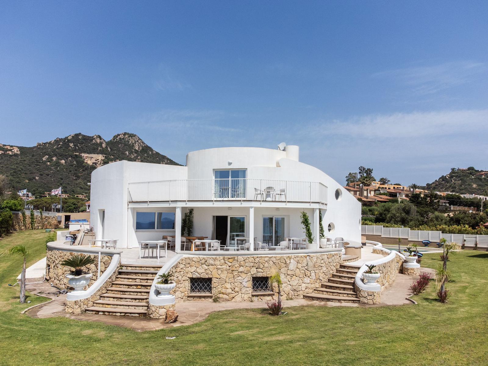 The interior of the villa, designed by a renowned architect, meets the highest quality standards. It is arranged over two floors linked by a staircase in Sardinian travertine marble. There are six spacious and bright double bedrooms, each with flat-screen TV and marble bathroom with shower, washbasin, toilet, bidet, hairdryer and welcome kit. Five of these rooms are on the ground floor and have a private patio with direct access to the garden and swimming pool. The master suite, on the first floor, has a large private terrace with stunning sea views. The ground floor features a spacious living area dominated by a large fireplace, several conversation areas with lounges and armchairs, and a fully equipped kitchen. This is the domain of the chef, who will prepare refined dishes inspired by local and international cuisine.