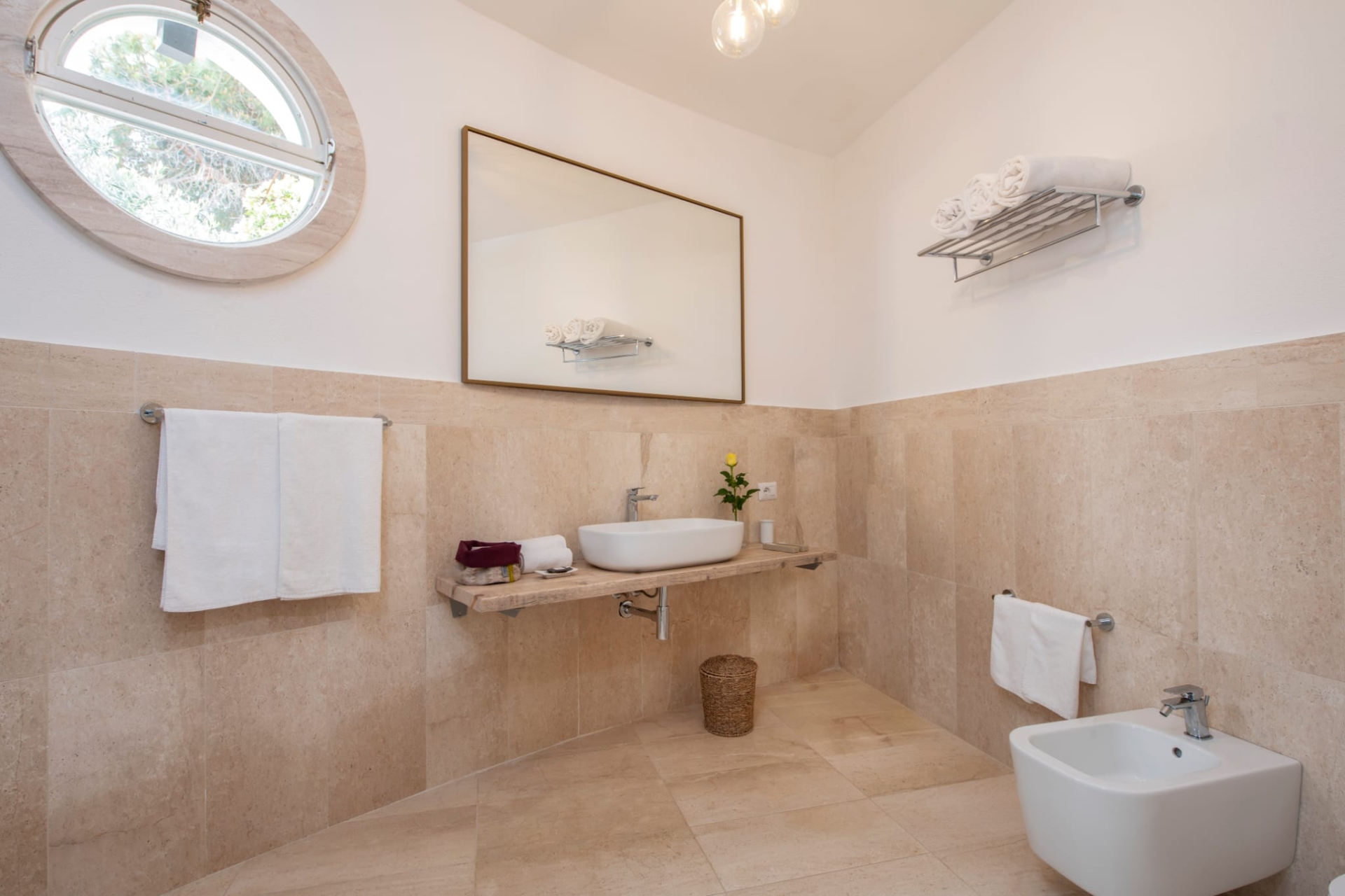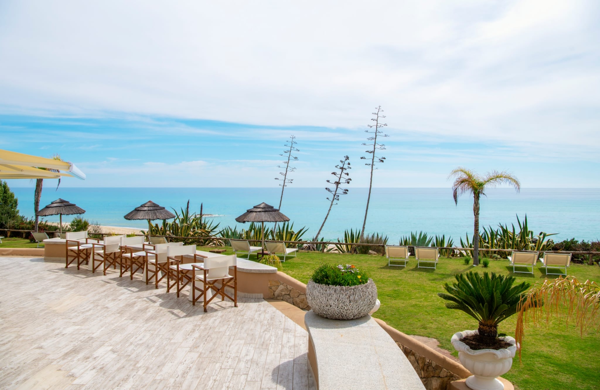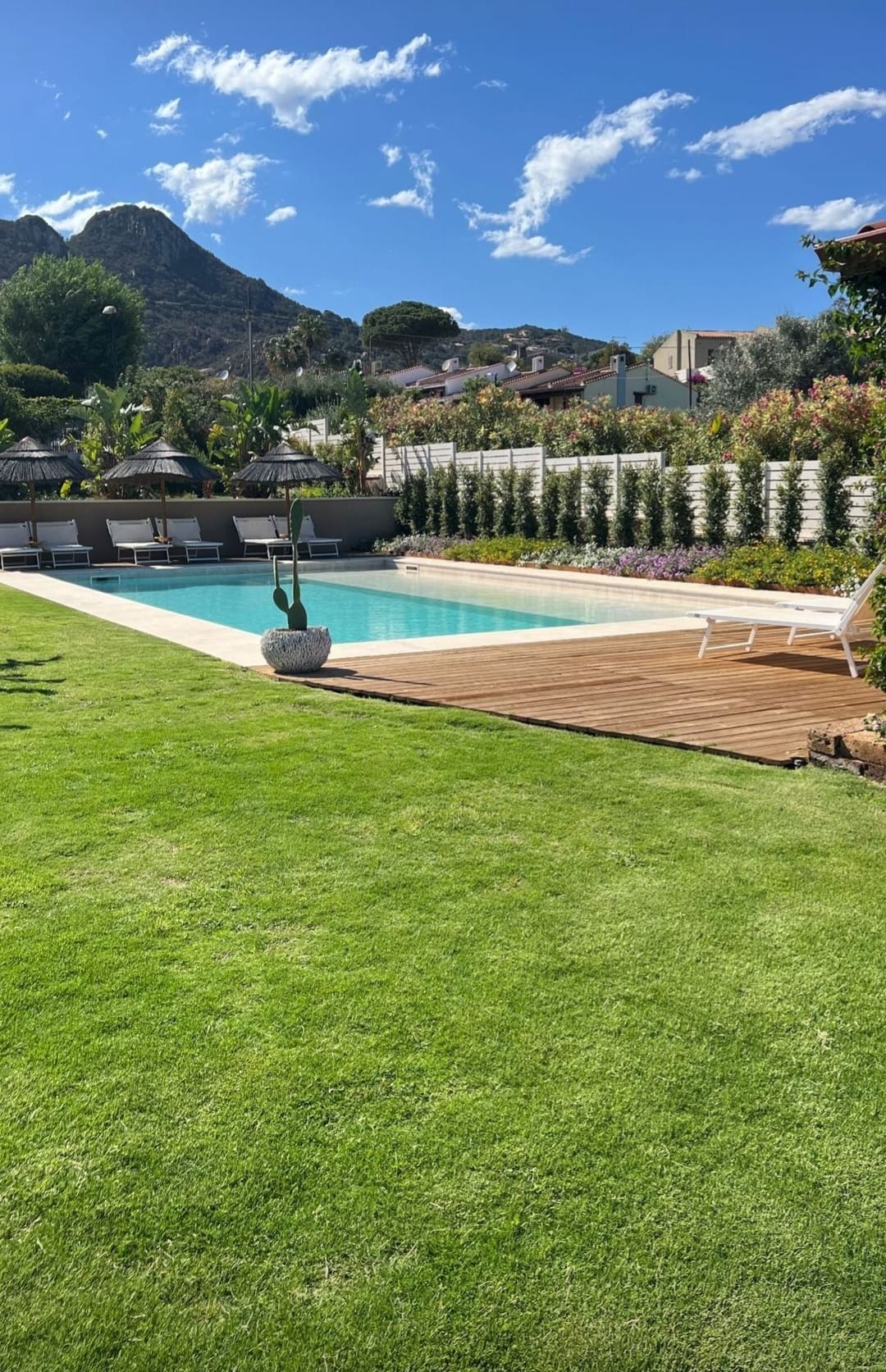 The exterior of the villa has been designed for a luxurious and relaxing experience. A large patio opens directly onto the sea, with a solid wood dining table and several smaller tables providing the perfect setting for aperitifs or candlelit dinners under the enchanting moonlight. A few steps down the stone staircase lead to a carefully manicured lawn that extends down to the beach. There are sun loungers and parasols for relaxing by the water. The villa also boasts a magnificent double-deep marble swimming pool, which can be heated in mid-season and is furnished with sun loungers and parasols. A wooden gazebo on the lawn offers a TV area and a fitness area with Tecnogym equipment for those who want to keep fit.
