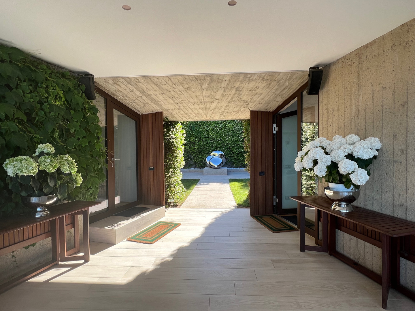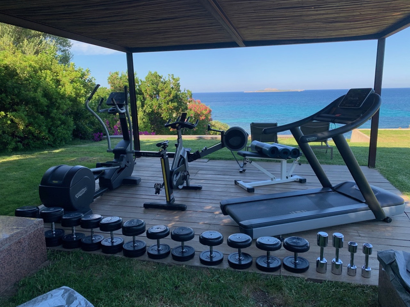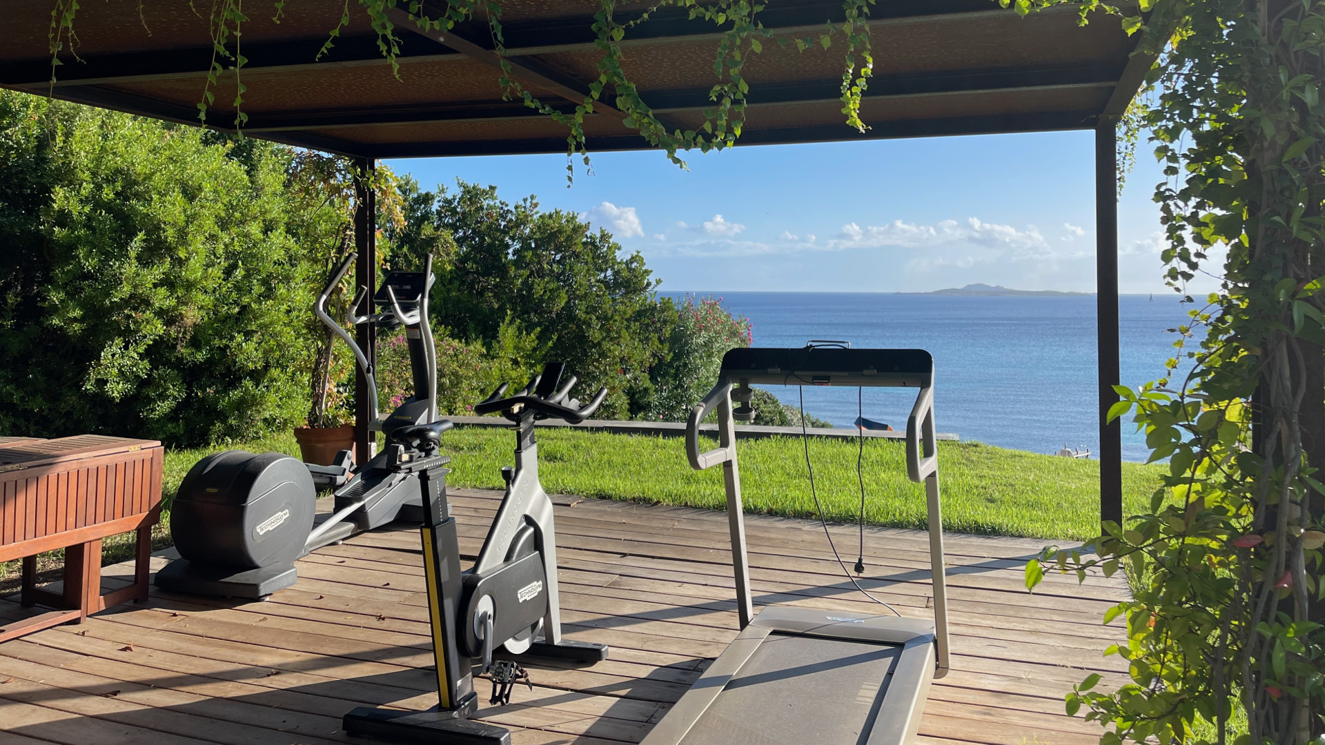 Gym Room outdoor open shaded gym with Technogym Crosstrainer Treadmaster and Bike.