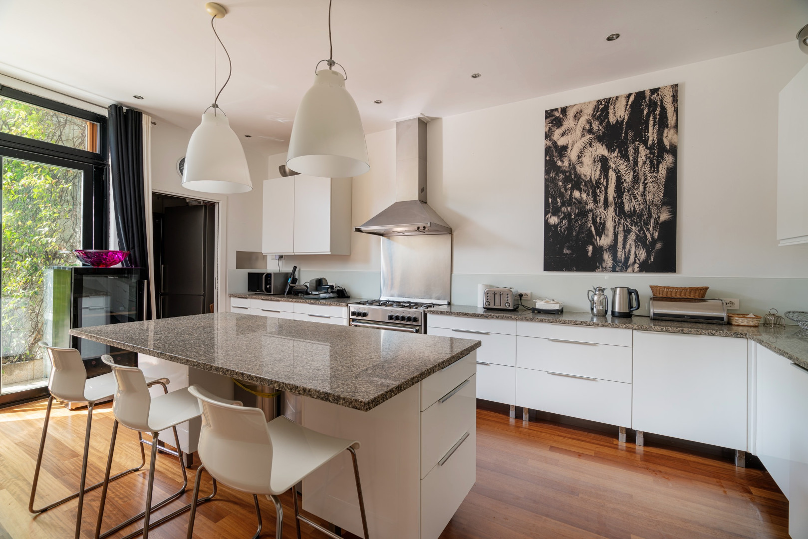 Kitchen with washing machine, gas stove, gas oven, toaster, dishwasher, washing machine, dryer