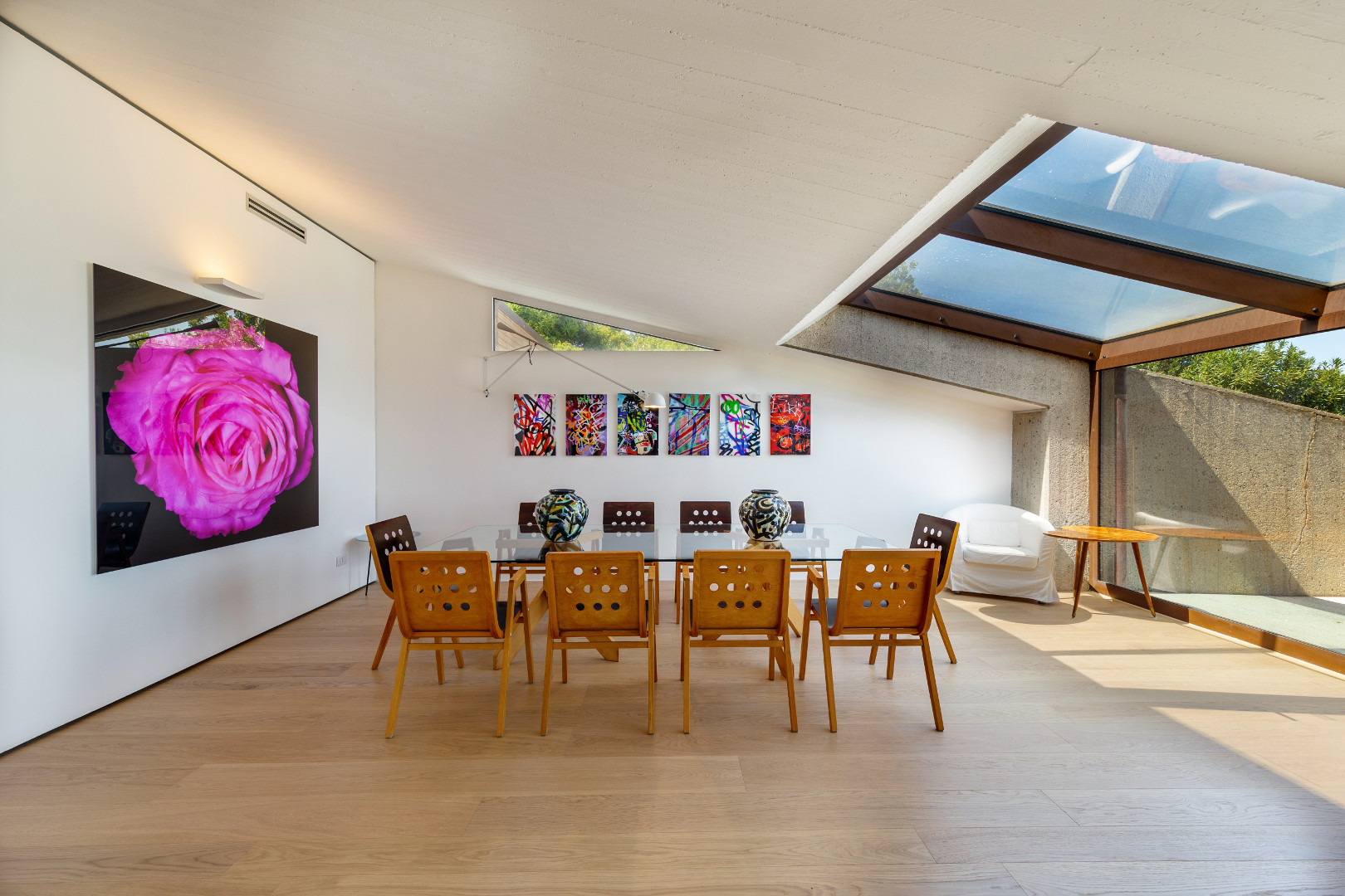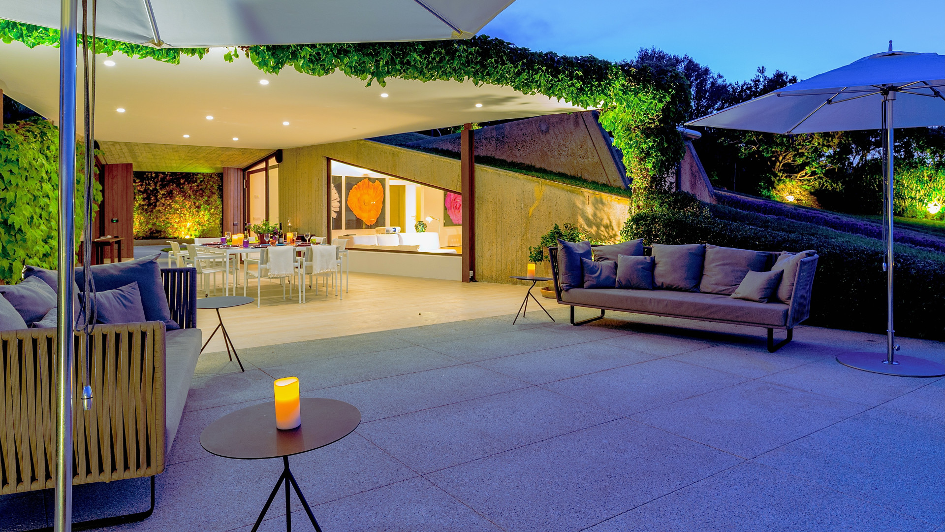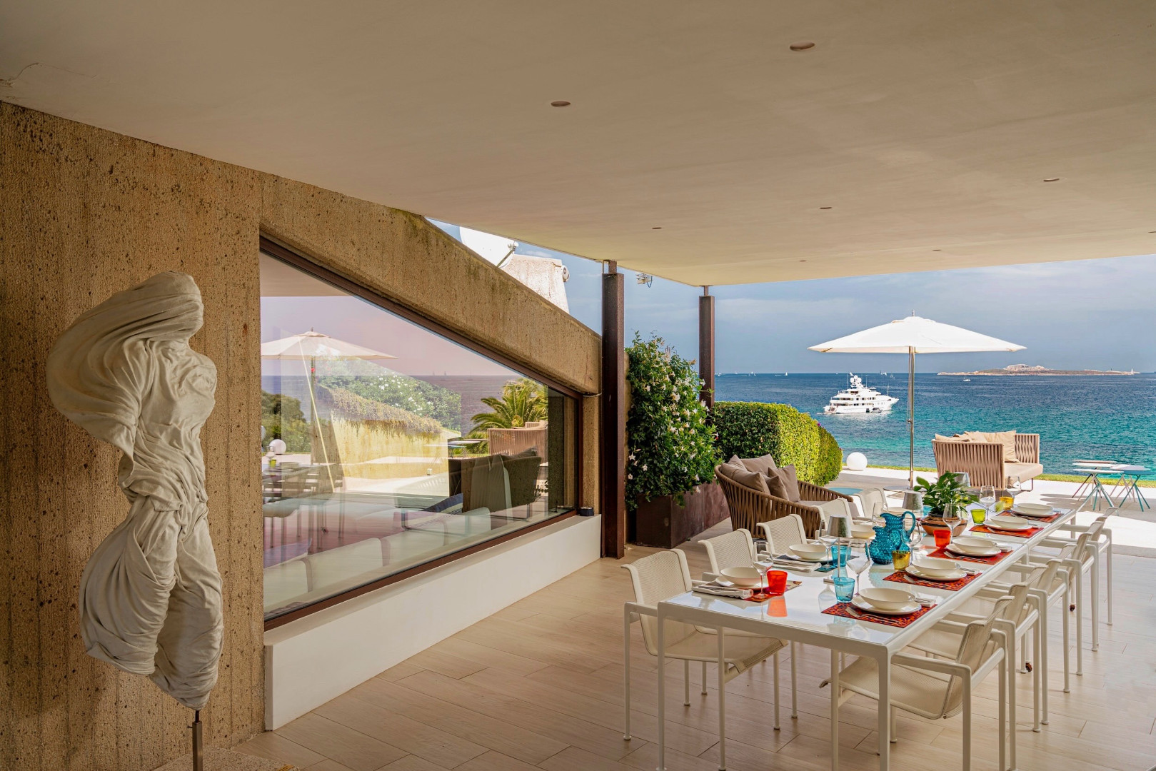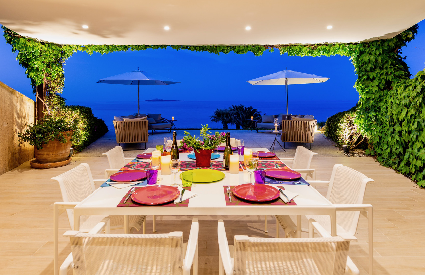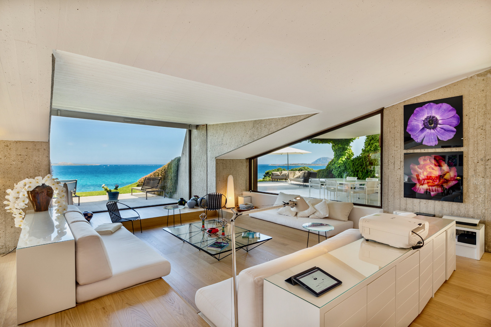 Living Room with dining area with table for 15 people with sea view, television, home cinema and Covered Terrace which connects the two wings - with a dining area to enjoy the incredible 270-degree view of the Mediterranean Sea over Porto Rotondo, the island of Mortorio and the bay of Cala di Volpe