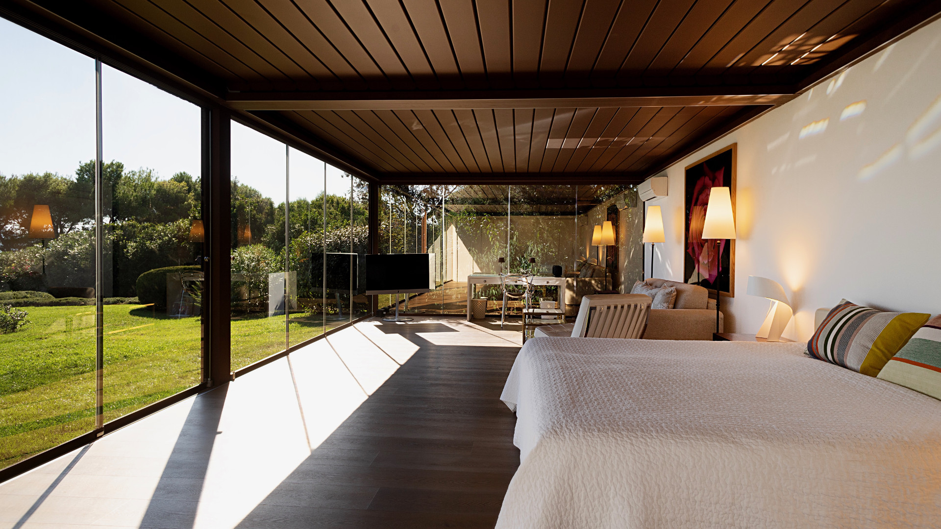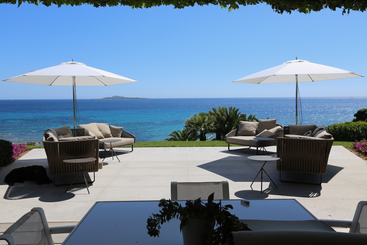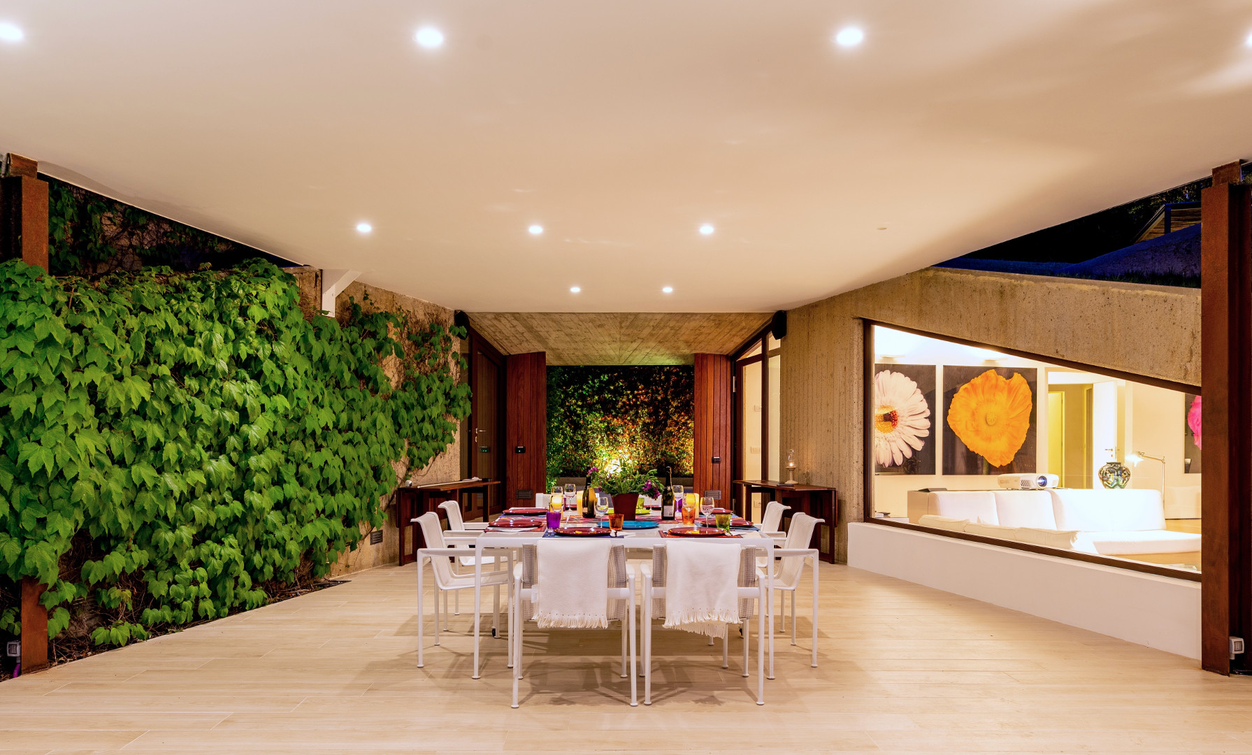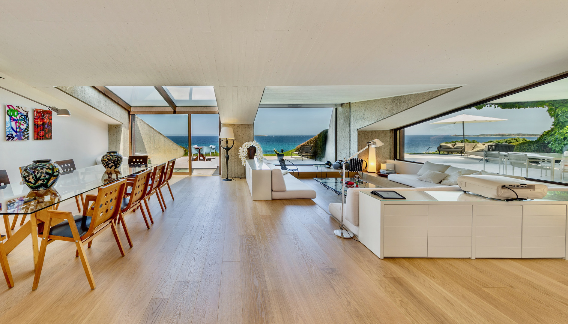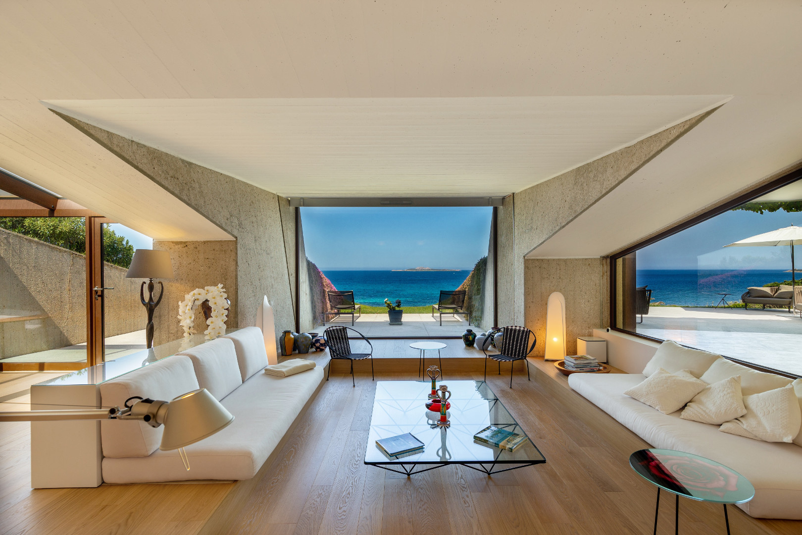 Living Room with dining area with table for 15 people with sea view, television, home cinema and Covered Terrace which connects the two wings - with a dining area to enjoy the incredible 270-degree view of the Mediterranean Sea over Porto Rotondo, the island of Mortorio and the bay of Cala di Volpe