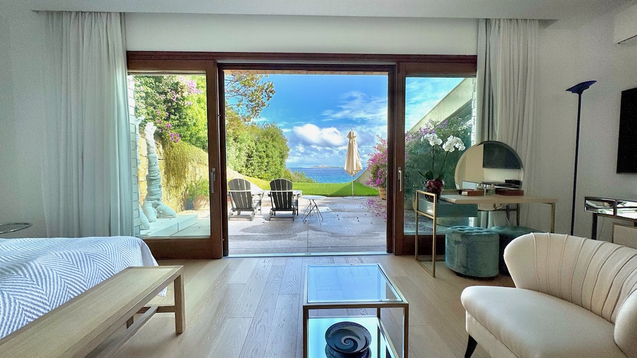 Double bedroom with garden access, terrace access, sea view and Ensuite bathroom with shower and Terrace with sea view