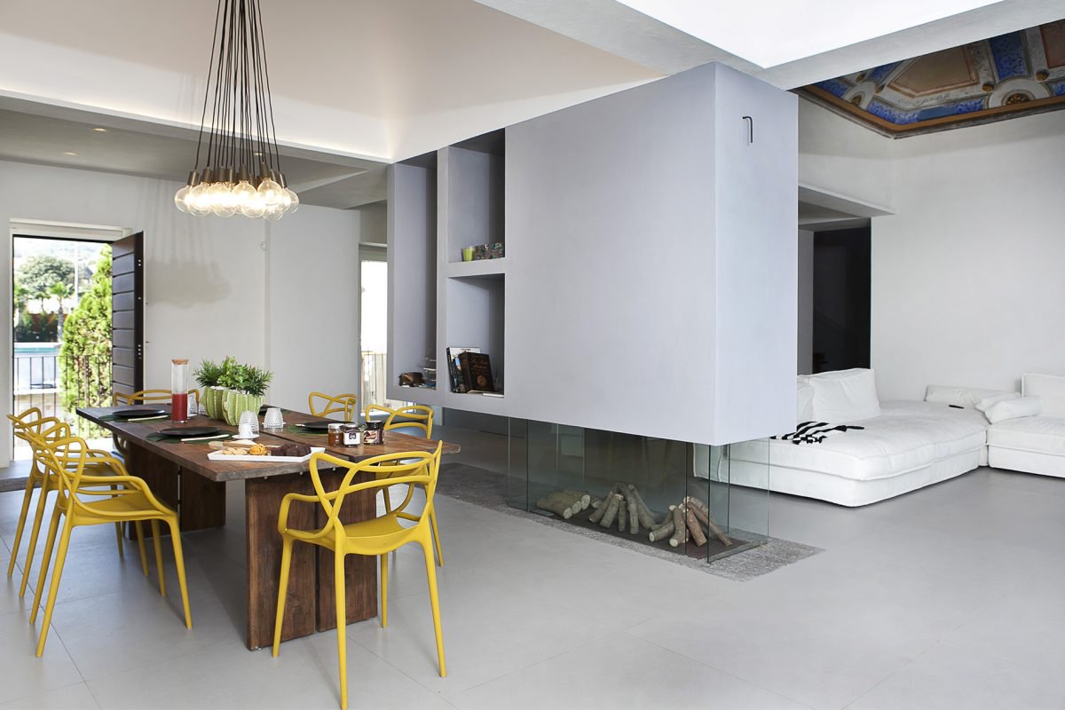 Living Room with dining area with fire place, television, satellite and Open kitchen with electric oven, dishwasher, coffee machine, microwave oven, terrace access and Covered and equipped Terrace with barbecue