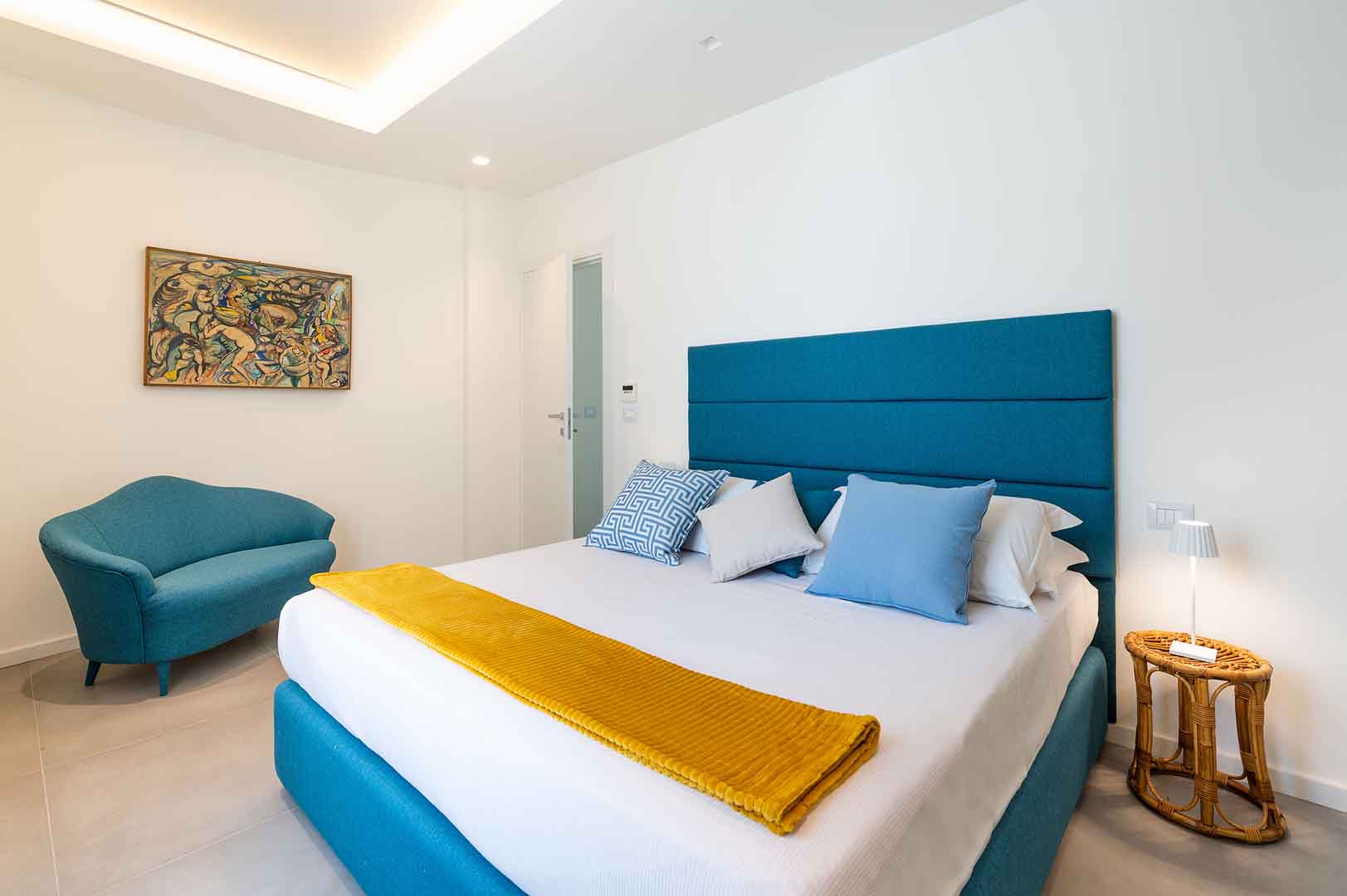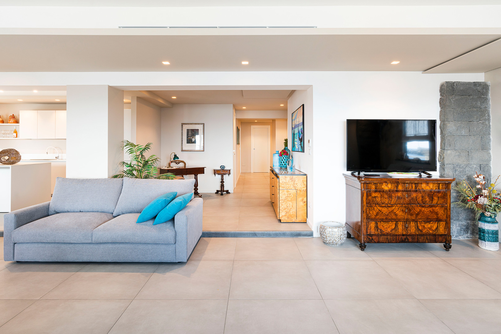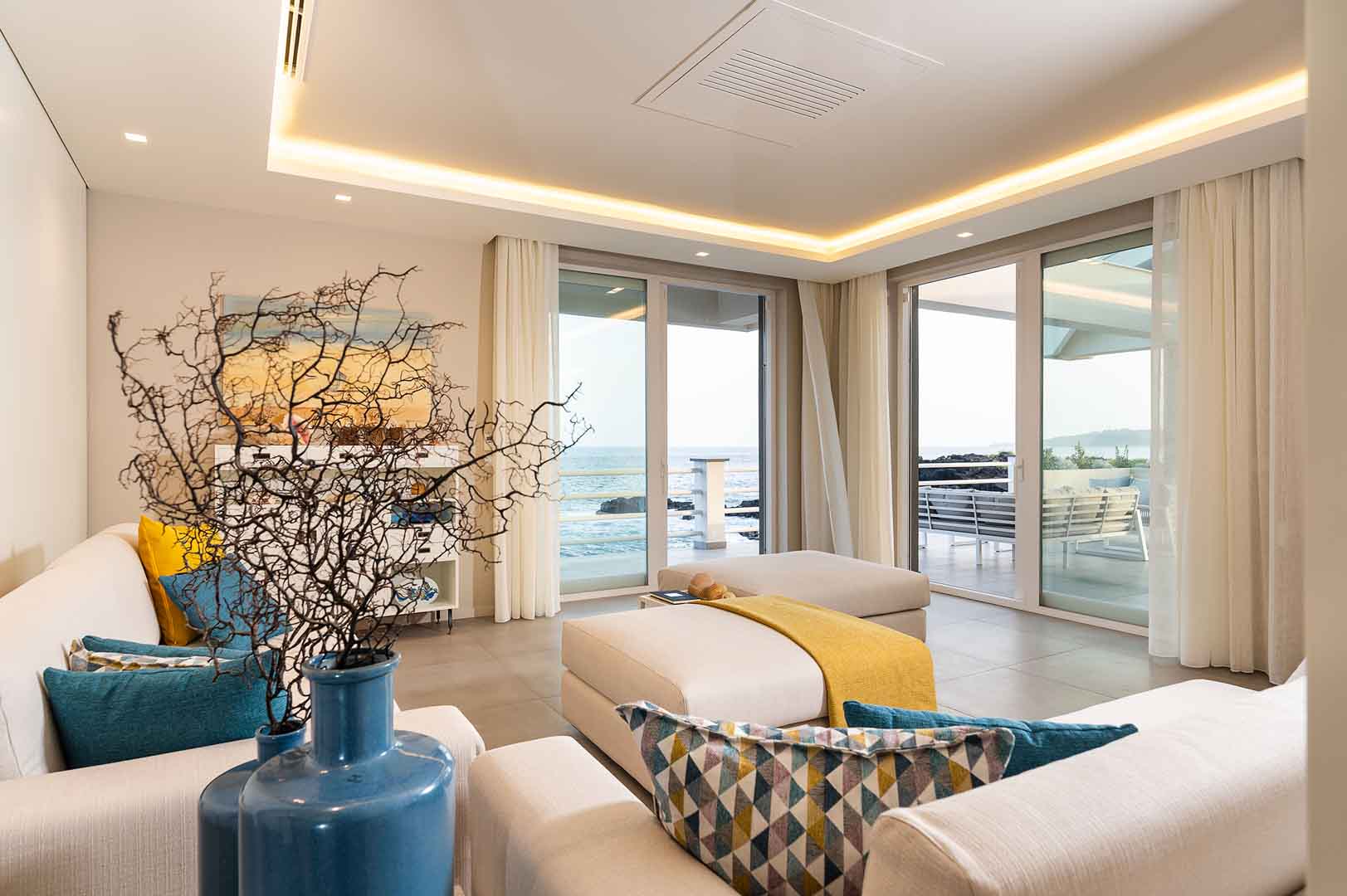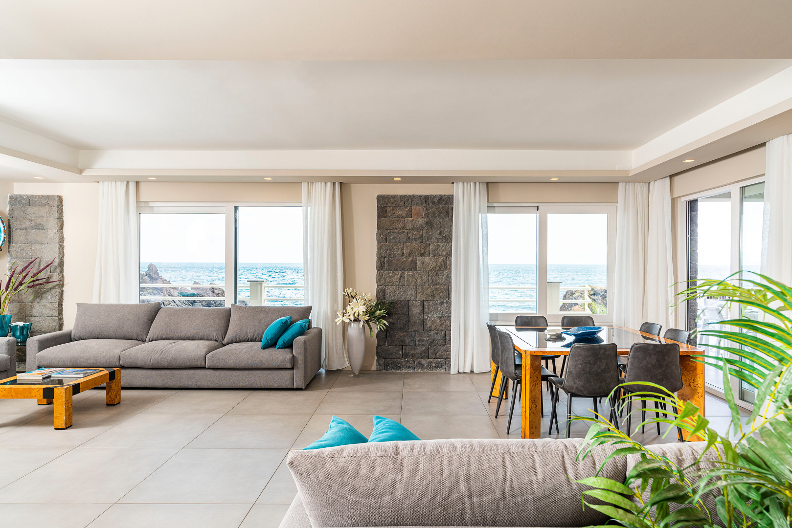 In the villa, the decoration is modern and very refined. Inside, a welcoming atmosphere is played out with decorative elements of local craftsmanship. The blue of the furniture is reminiscent of the sea, and the sober and clear interior contrasts with the black rock of the coast. This elegant and prestigious house is in itself a true work of art.