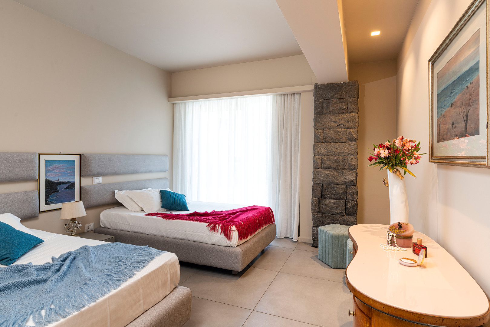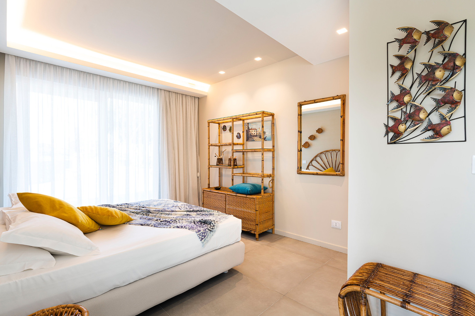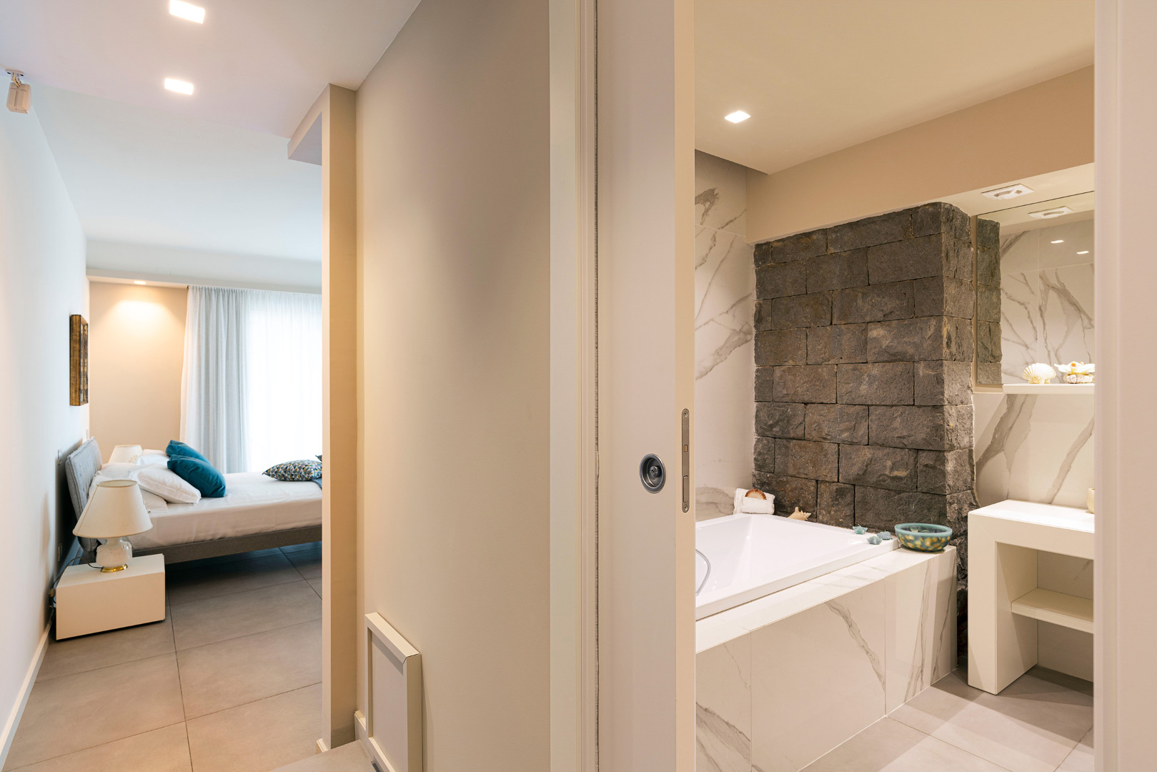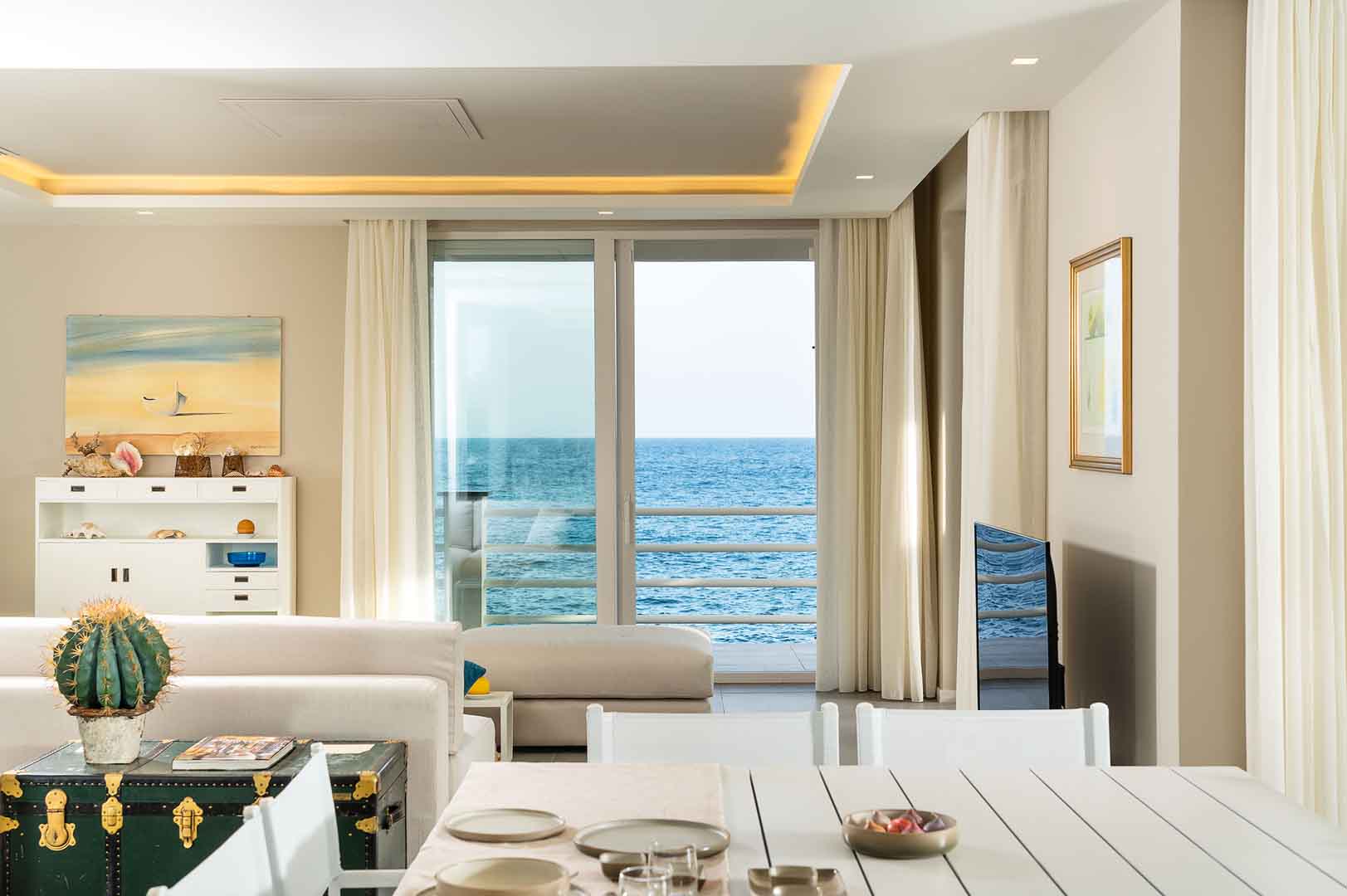 In the villa, the decoration is modern and very refined. Inside, a welcoming atmosphere is played out with decorative elements of local craftsmanship. The blue of the furniture is reminiscent of the sea, and the sober and clear interior contrasts with the black rock of the coast. This elegant and prestigious house is in itself a true work of art.