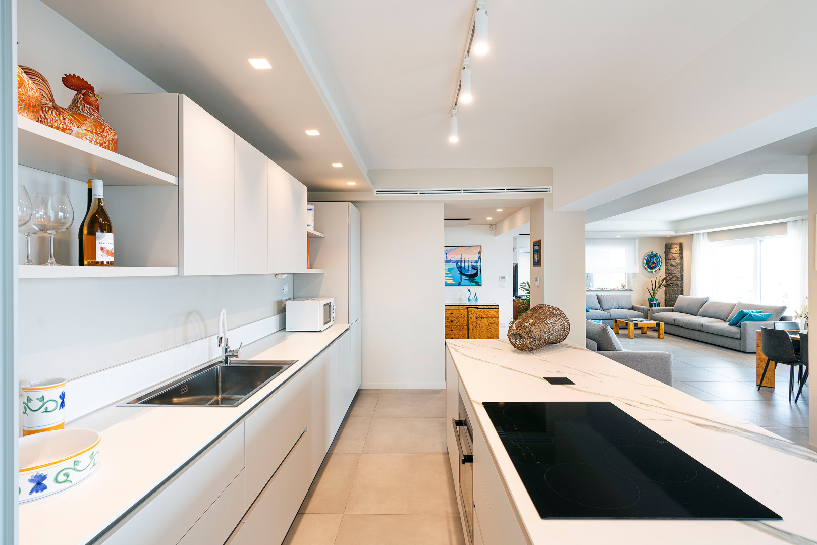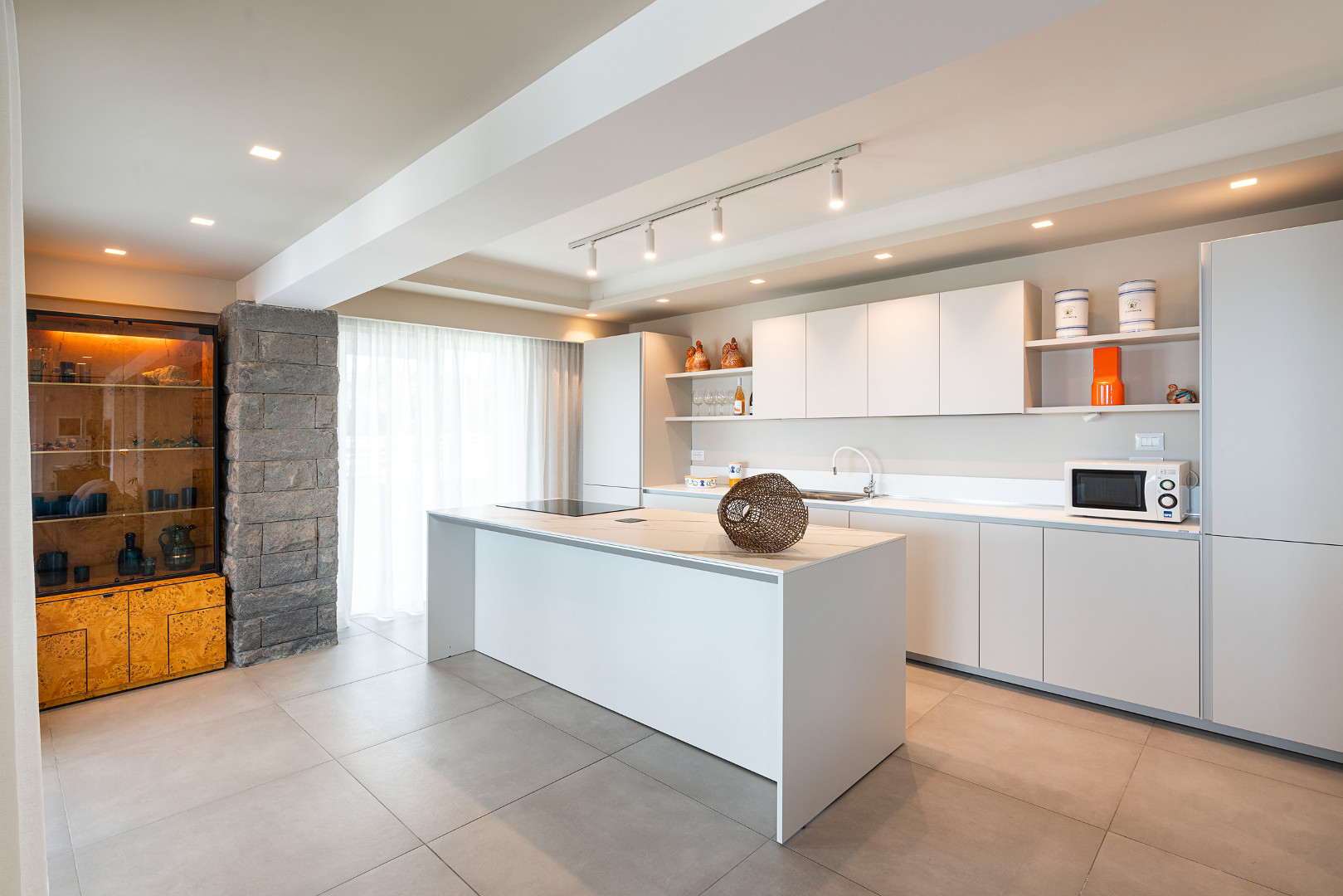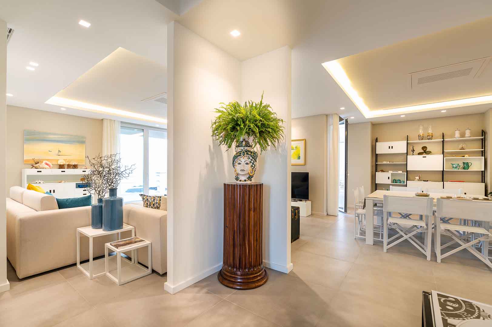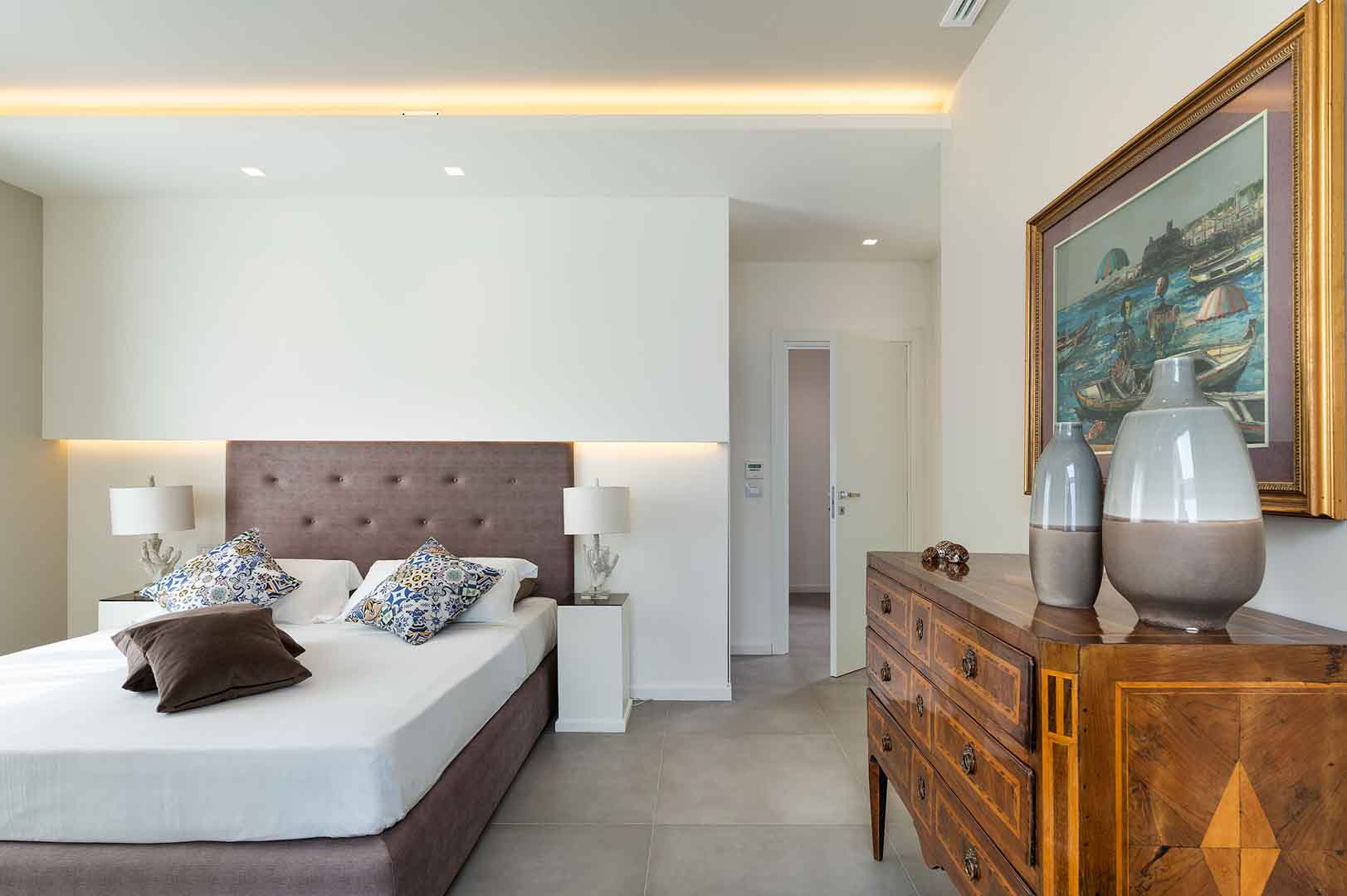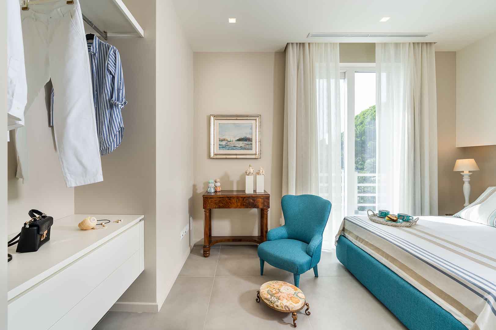 In the villa, the decoration is modern and very refined. Inside, a welcoming atmosphere is played out with decorative elements of local craftsmanship. The blue of the furniture is reminiscent of the sea, and the sober and clear interior contrasts with the black rock of the coast. This elegant and prestigious house is in itself a true work of art.