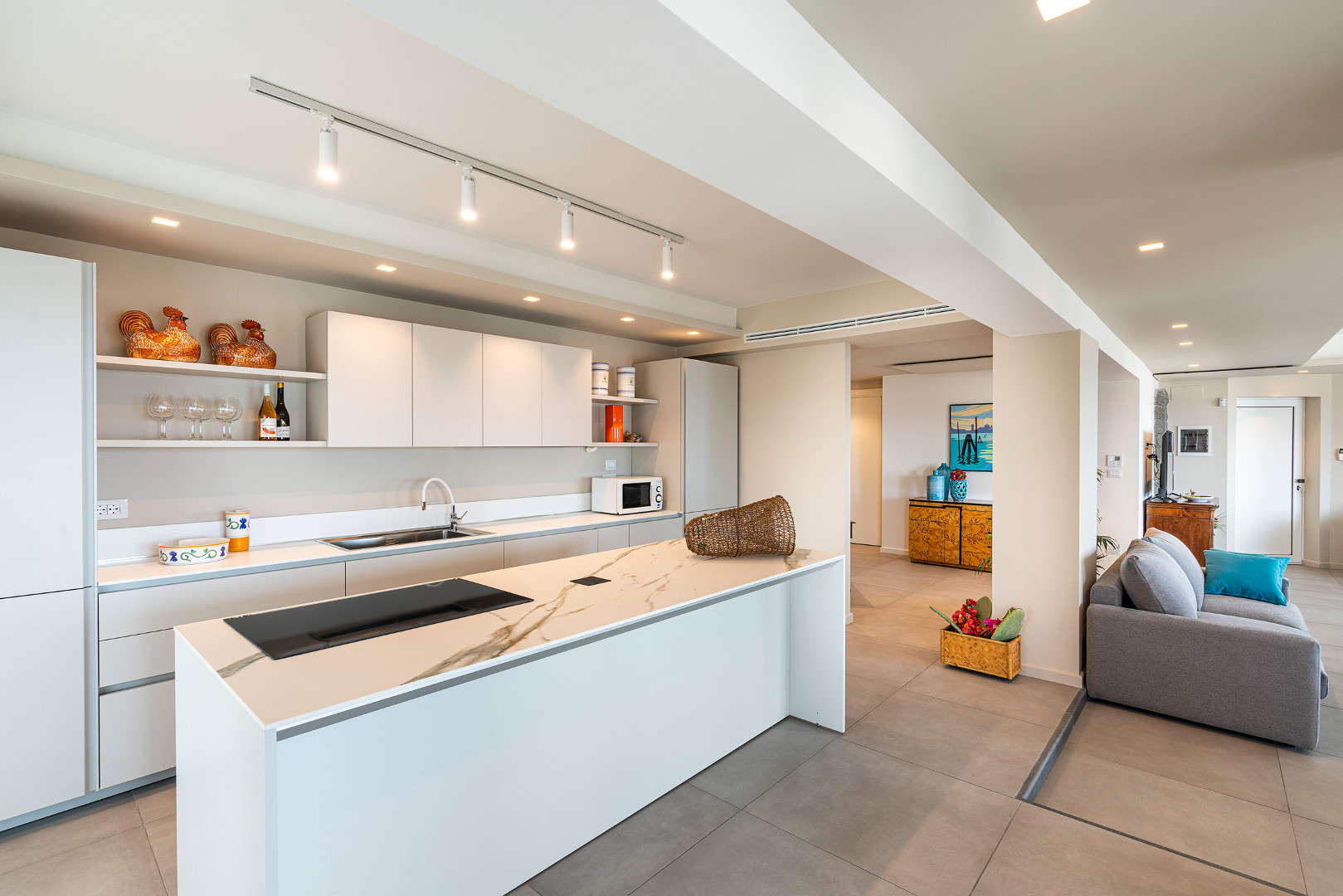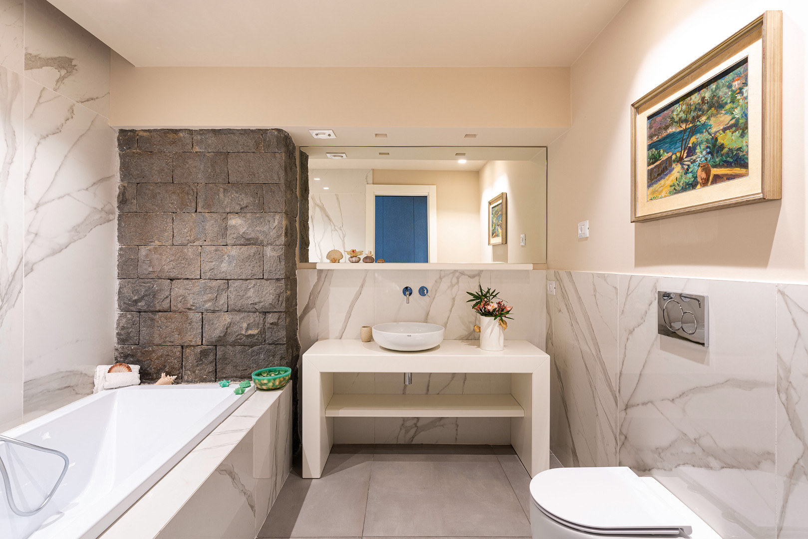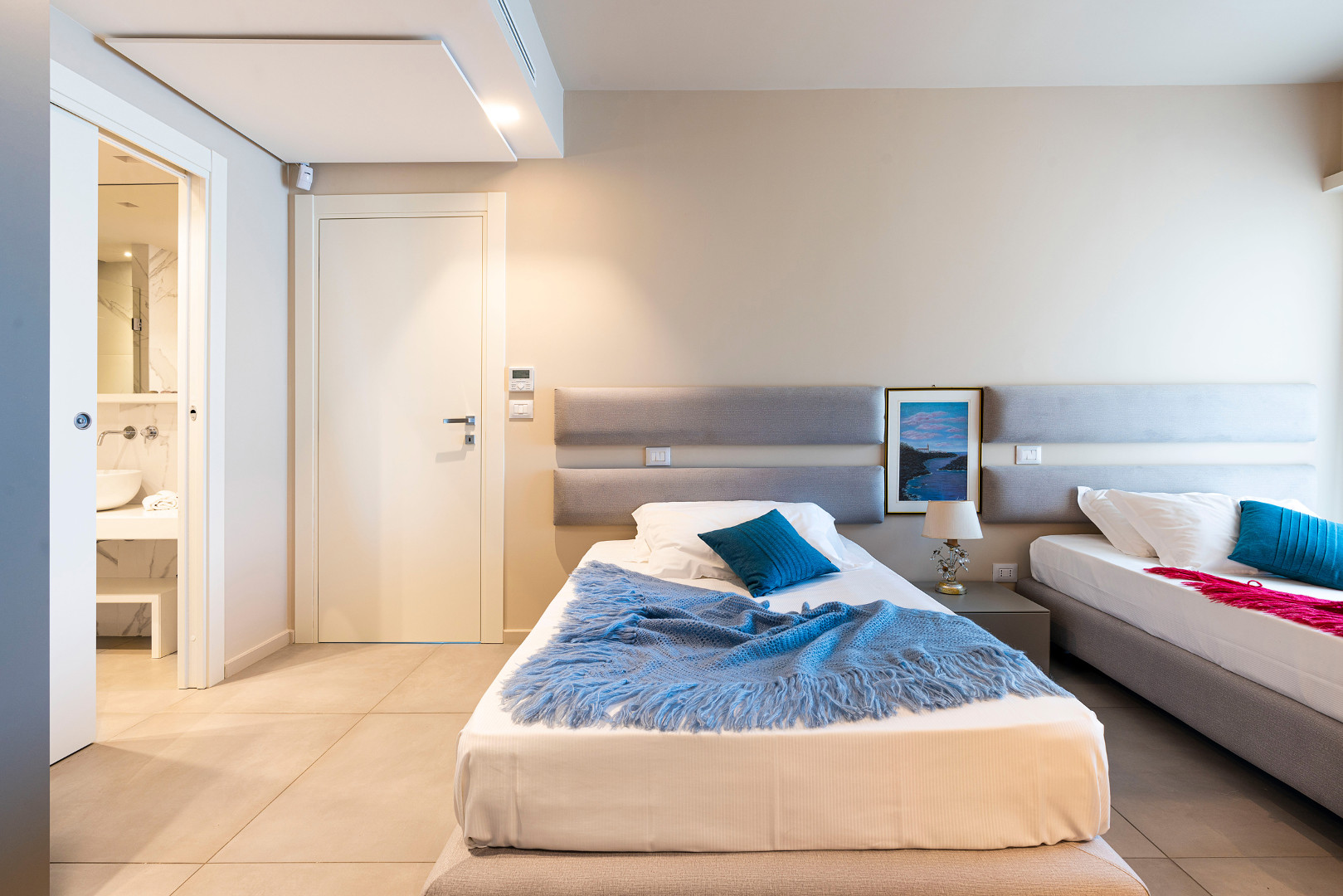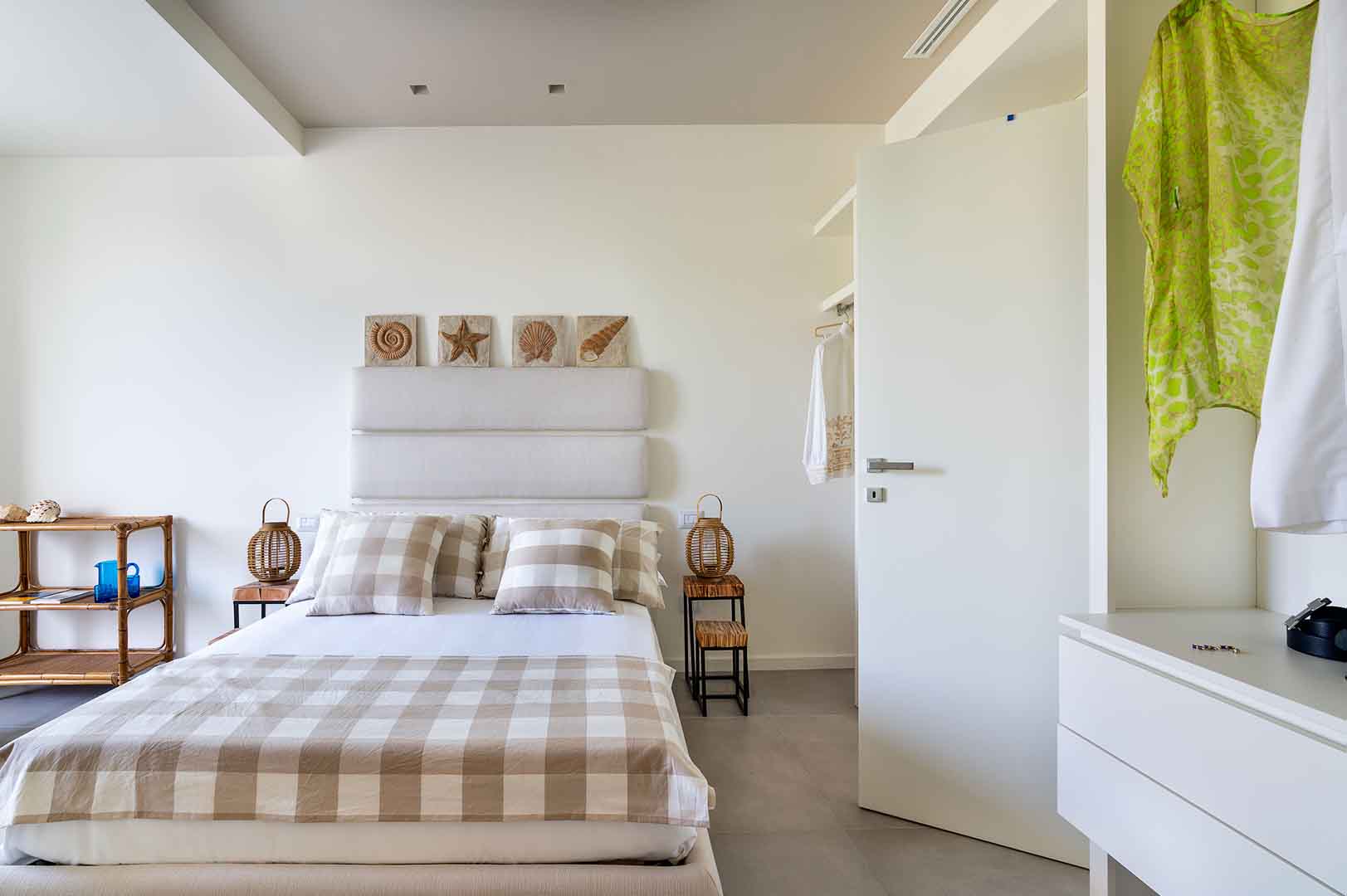 In the villa, the decoration is modern and very refined. Inside, a welcoming atmosphere is played out with decorative elements of local craftsmanship. The blue of the furniture is reminiscent of the sea, and the sober and clear interior contrasts with the black rock of the coast. This elegant and prestigious house is in itself a true work of art.