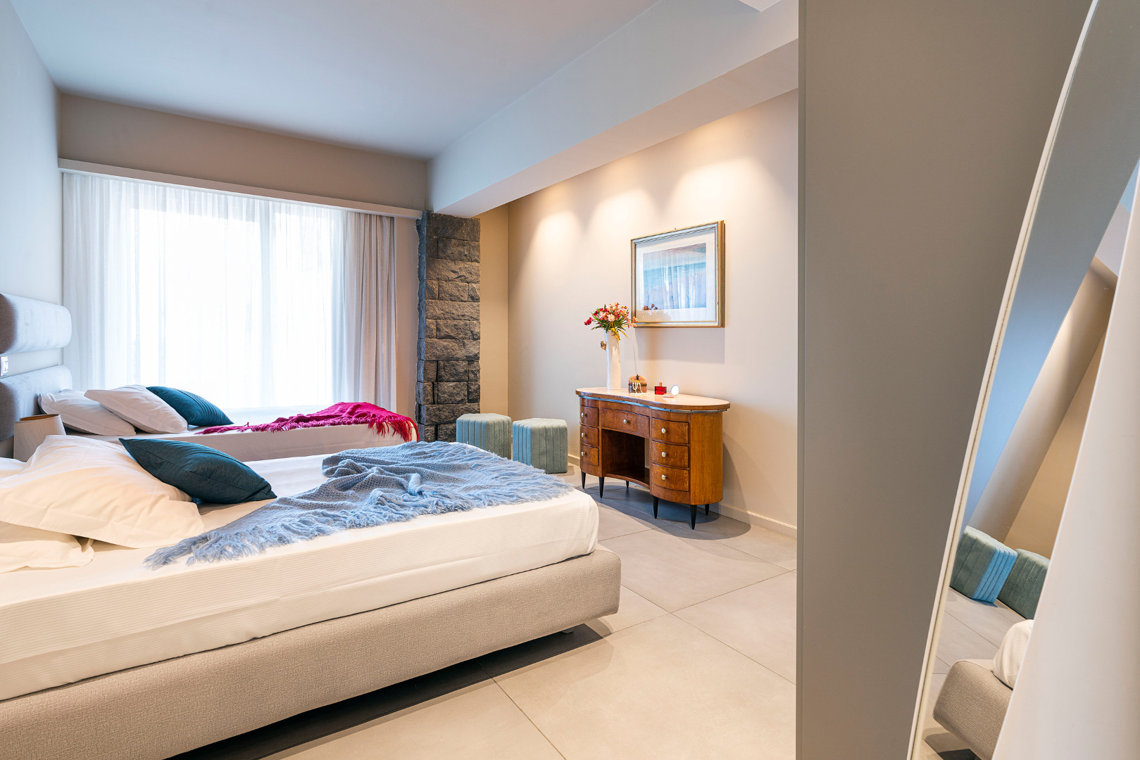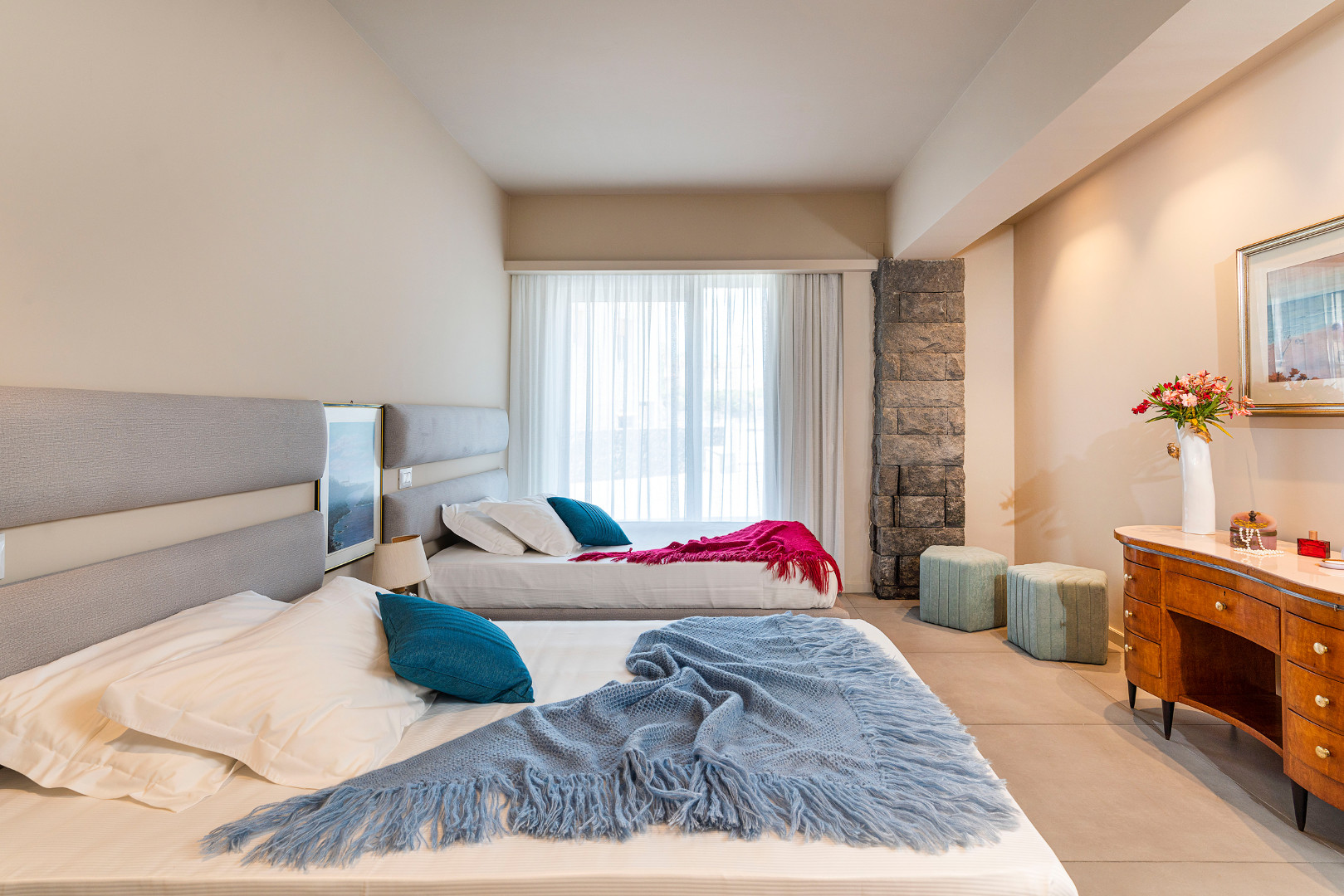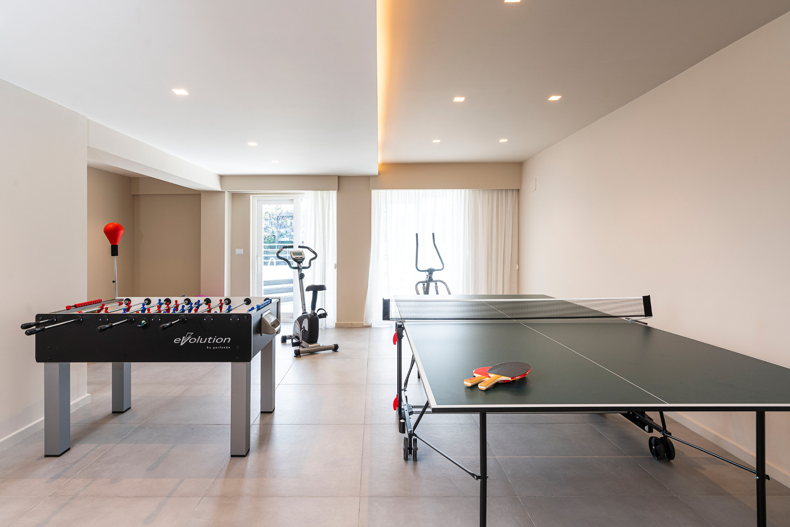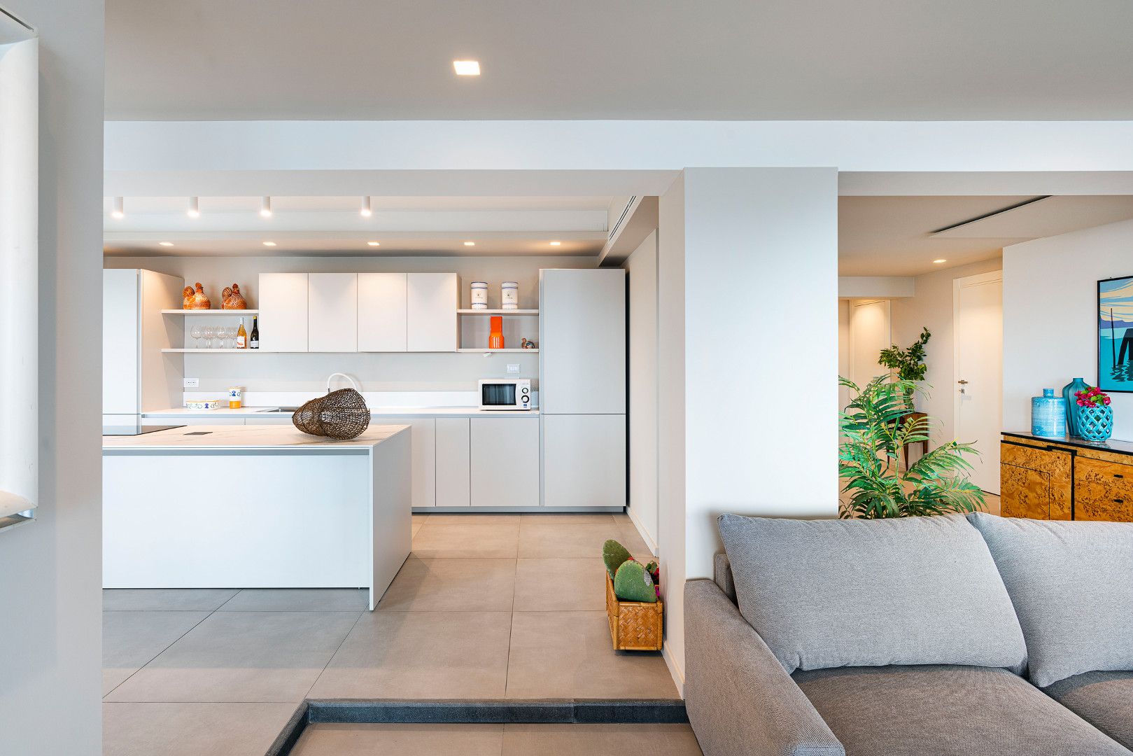In the villa, the decoration is modern and very refined. Inside, a welcoming atmosphere is played out with decorative elements of local craftsmanship. The blue of the furniture is reminiscent of the sea, and the sober and clear interior contrasts with the black rock of the coast. This elegant and prestigious house is in itself a true work of art.