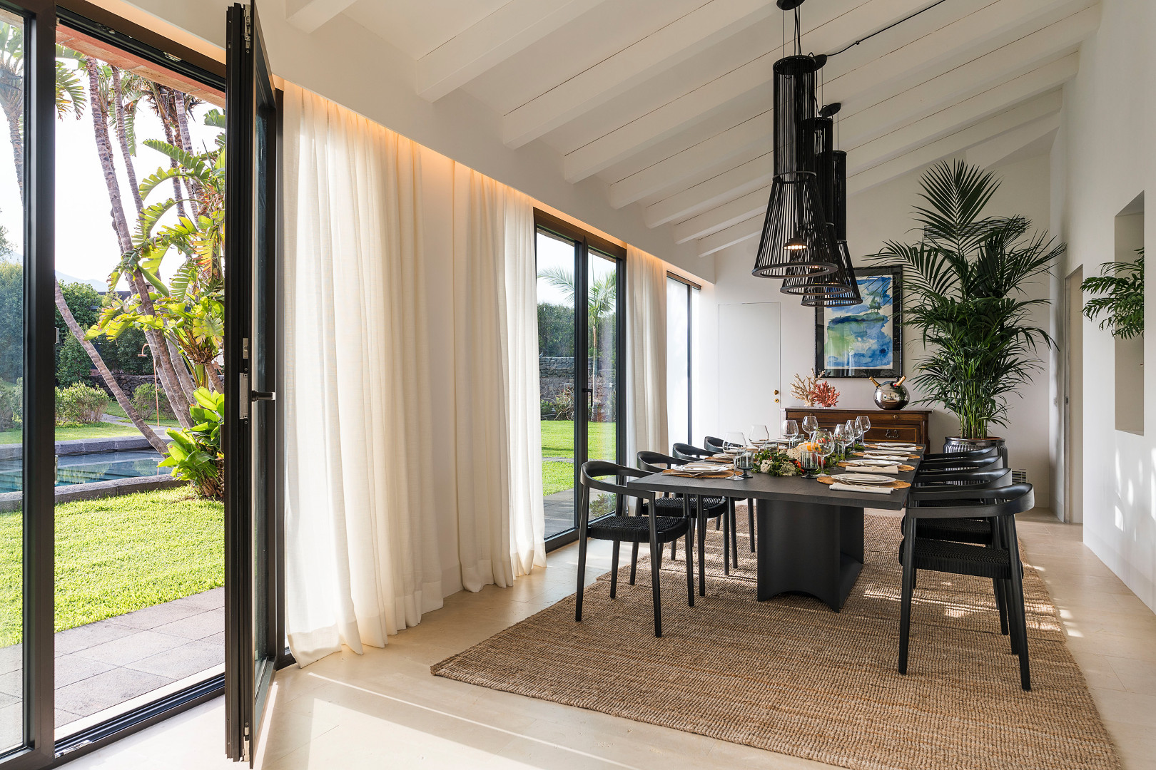 An outdoor area perfectly laid out for your comfort and pleasure:On one side is the garden, adorned with Mediterranean plants, palm trees and the beautiful 13-metre-long swimming pool; On the other is the terrace that runs alongside the property on the seaside.