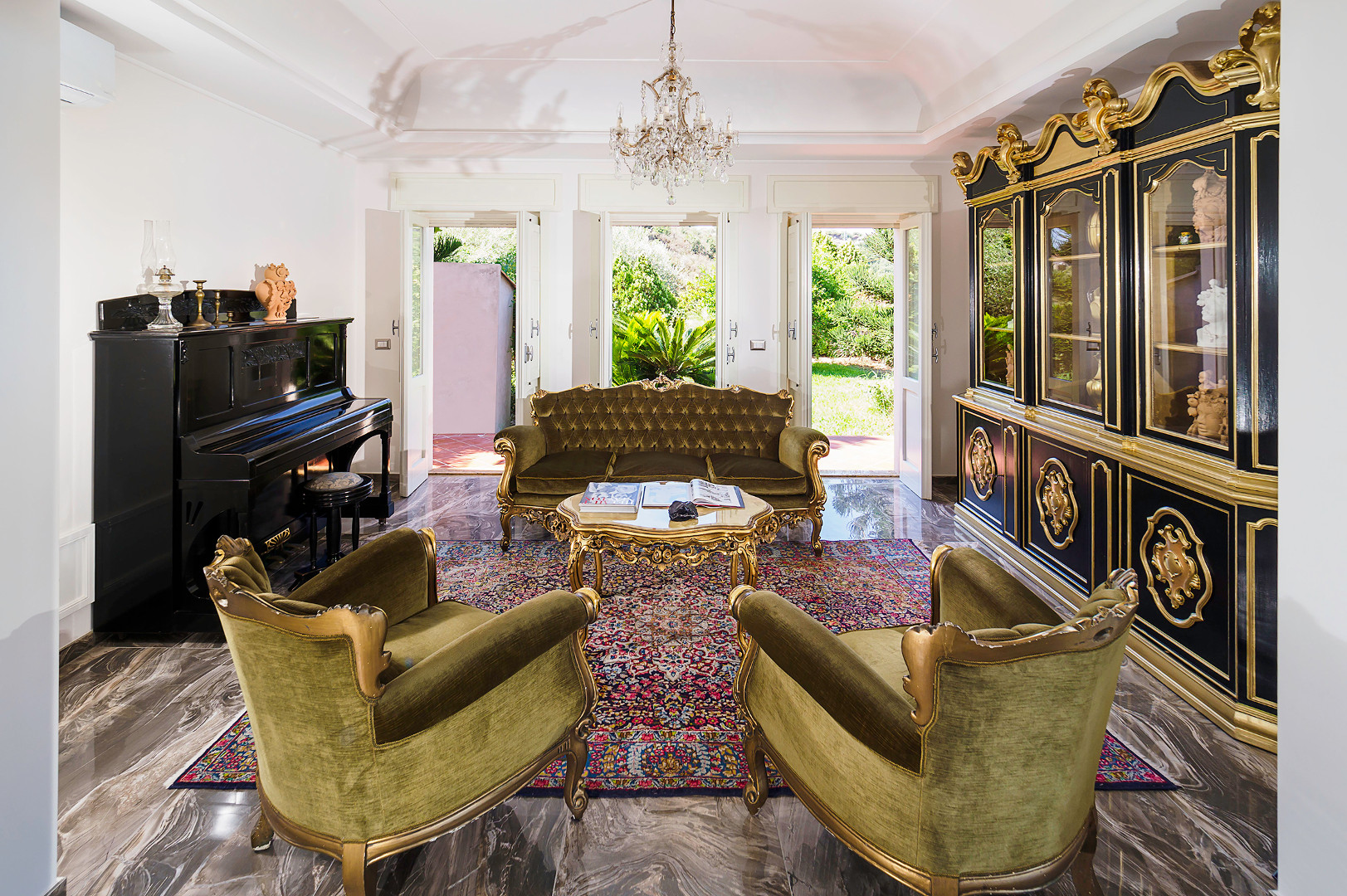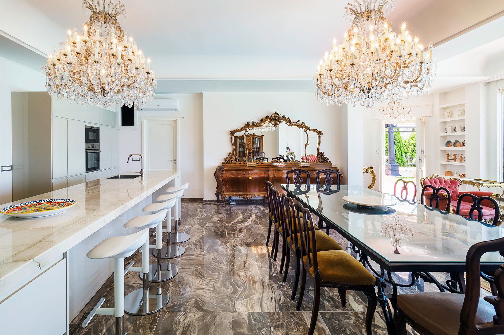 Living Room with dining area with piano, sea view and Kitchen with percolator, dishwasher, electric oven, expresso machine, freezer, fridge, gas stove, ice making machine, kettle, microwave oven, toaster