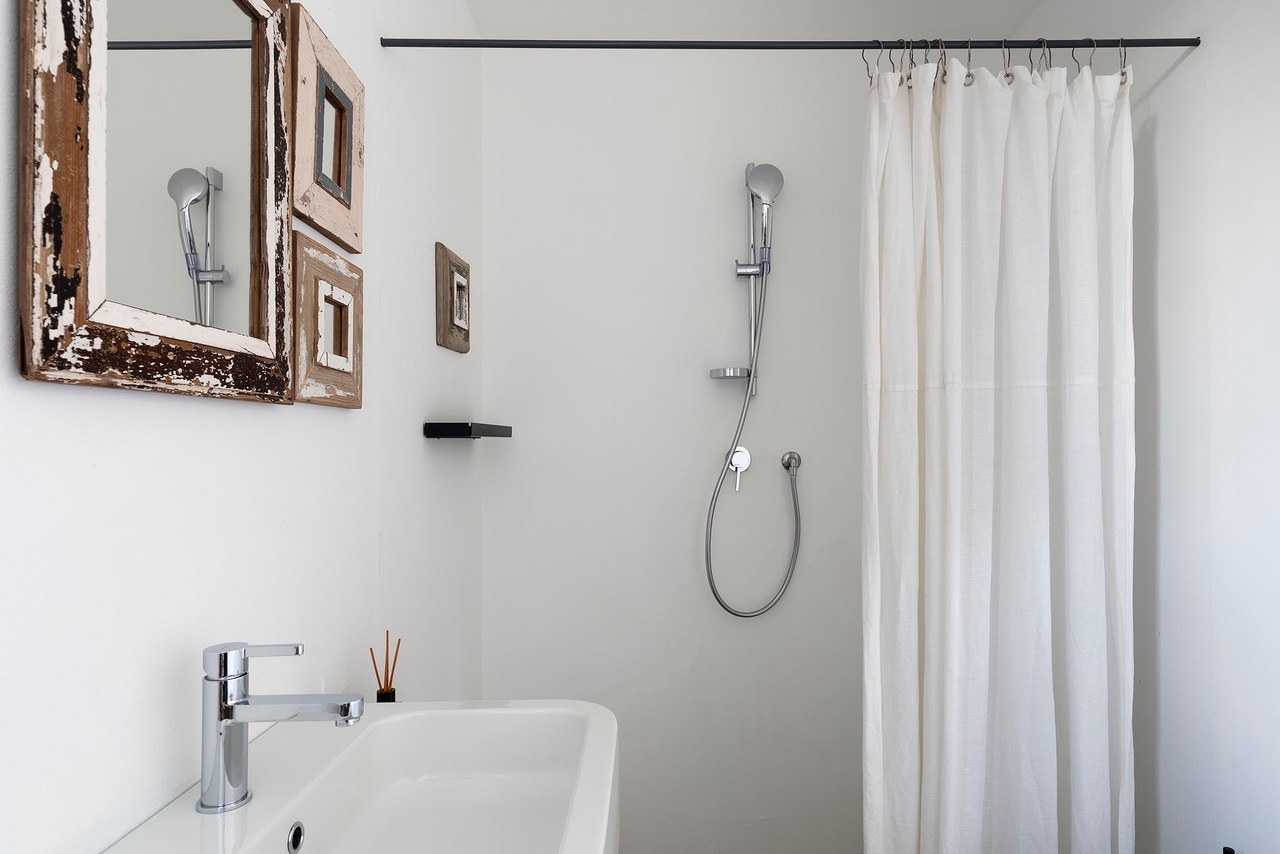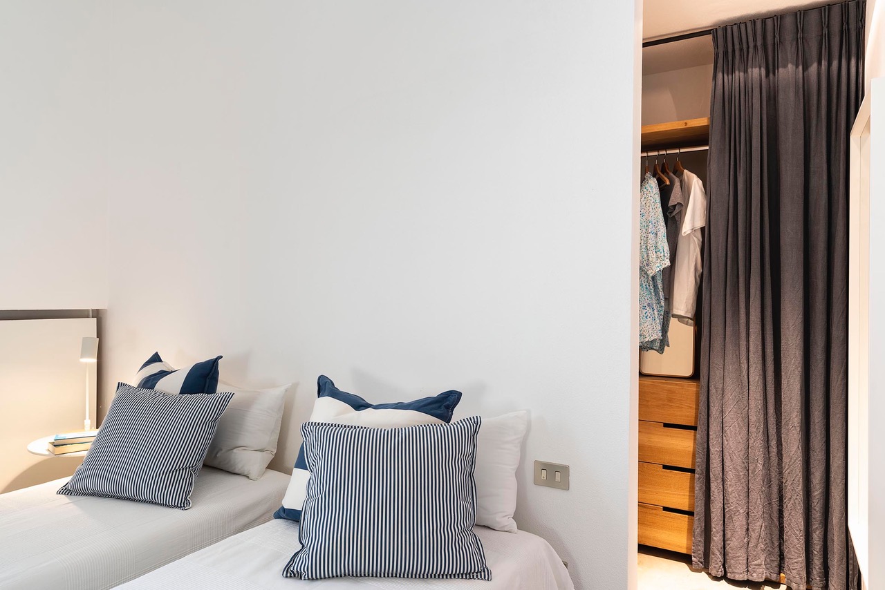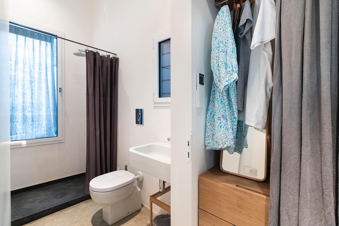 Double bedroom has blackout curtains that can be positioned with suction cups with terrace access and Ensuite bathroom with shower, wc