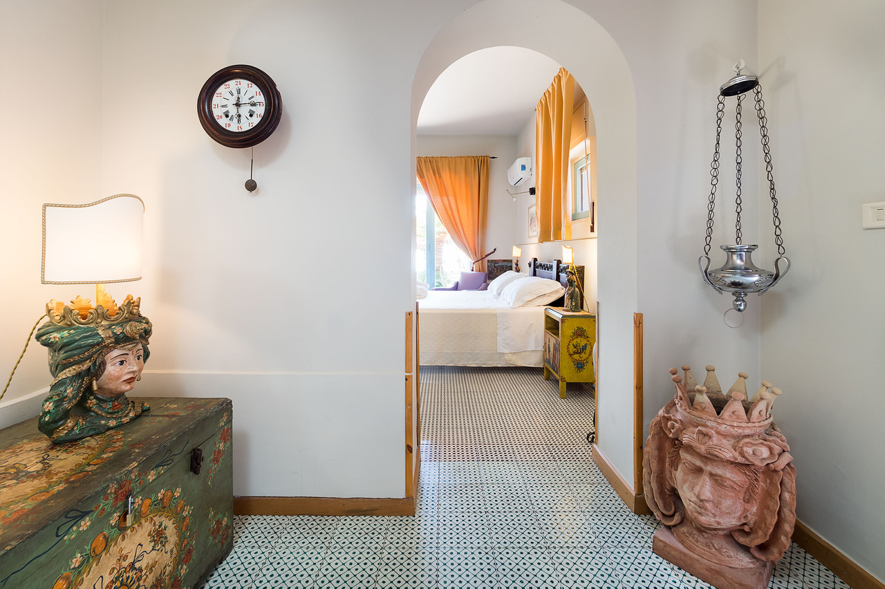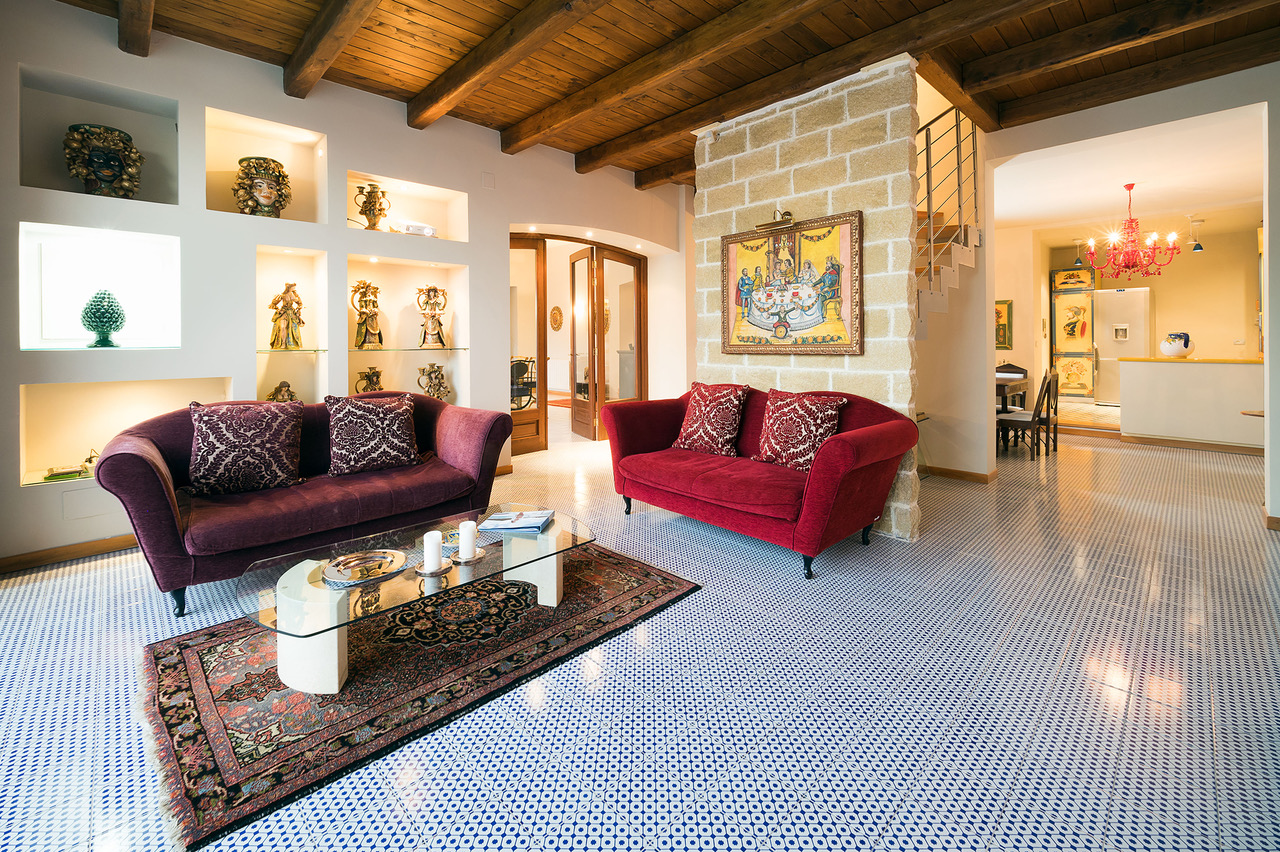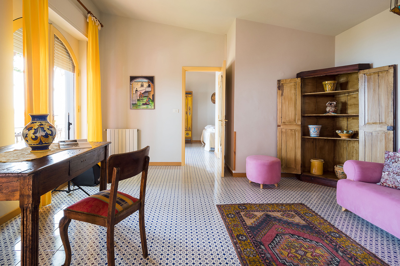 The refined interiors have been beautifully decorated in Sicilian style, from traditional ceramic tiles to antique furnishings, imbuing the property with warmth and character.