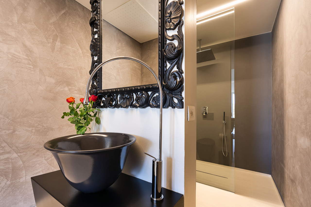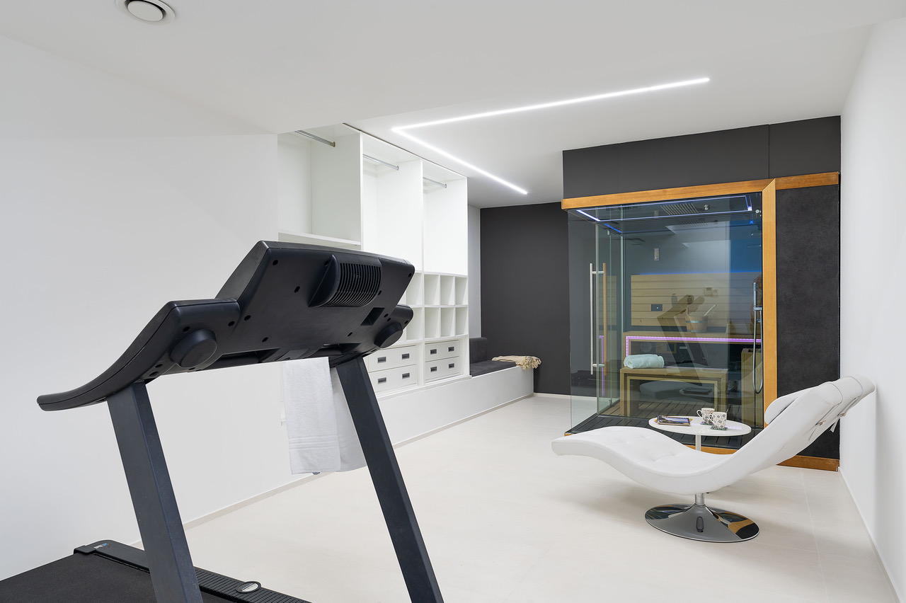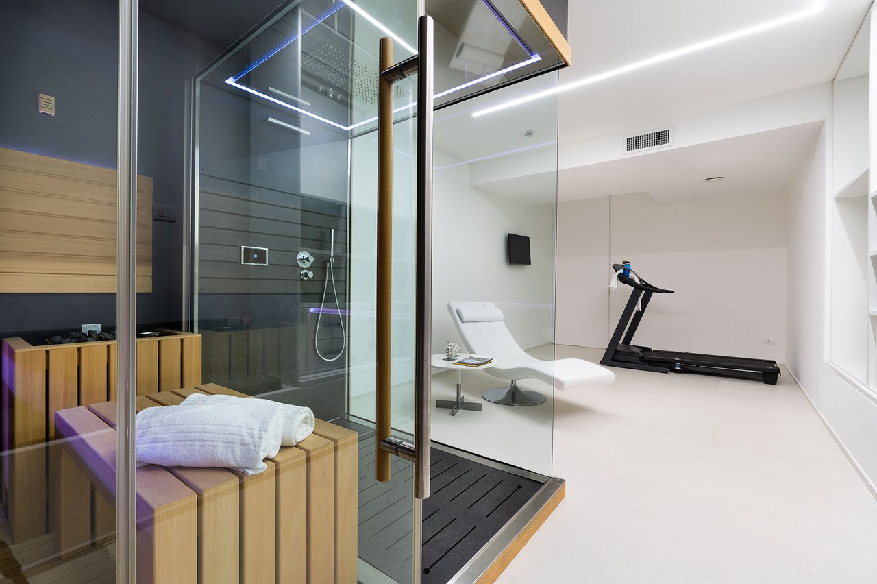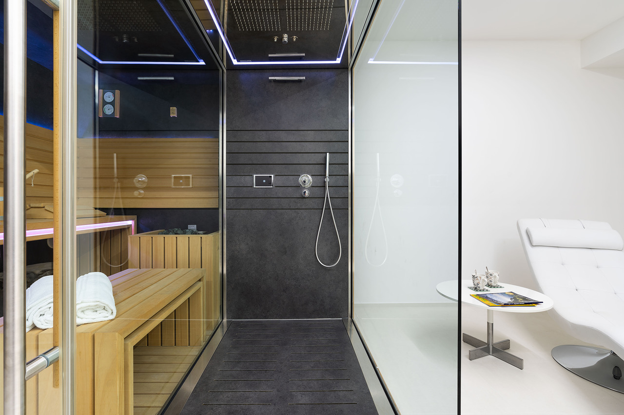 Terrace with deckchairs, sun umbrella, outdoor shower, jacuzzi