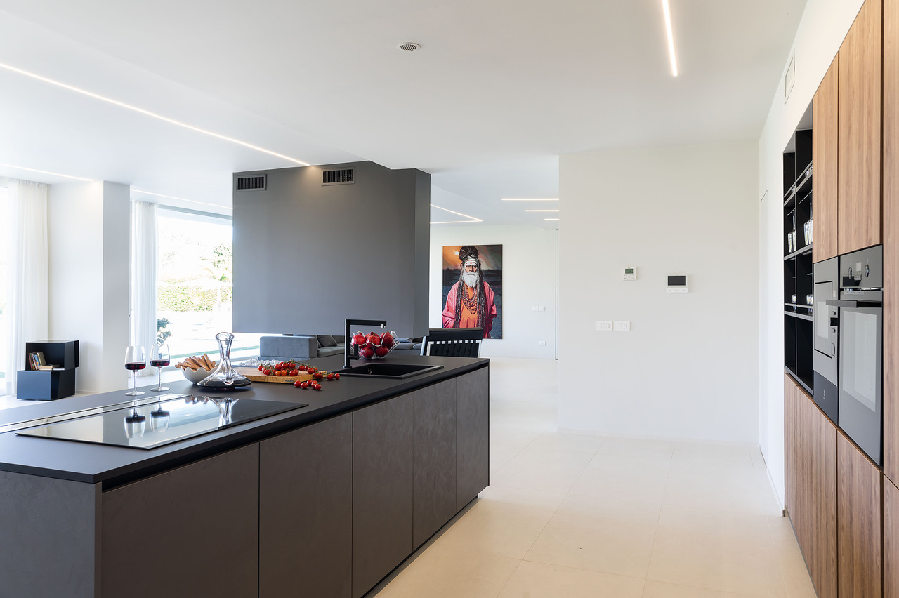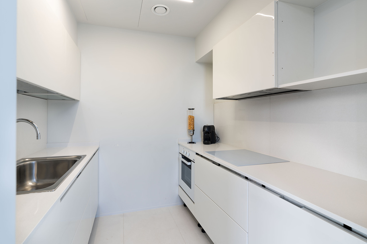 Kitchen with dishwasher, electric oven, expresso machine, fridge, induction hob, kettle