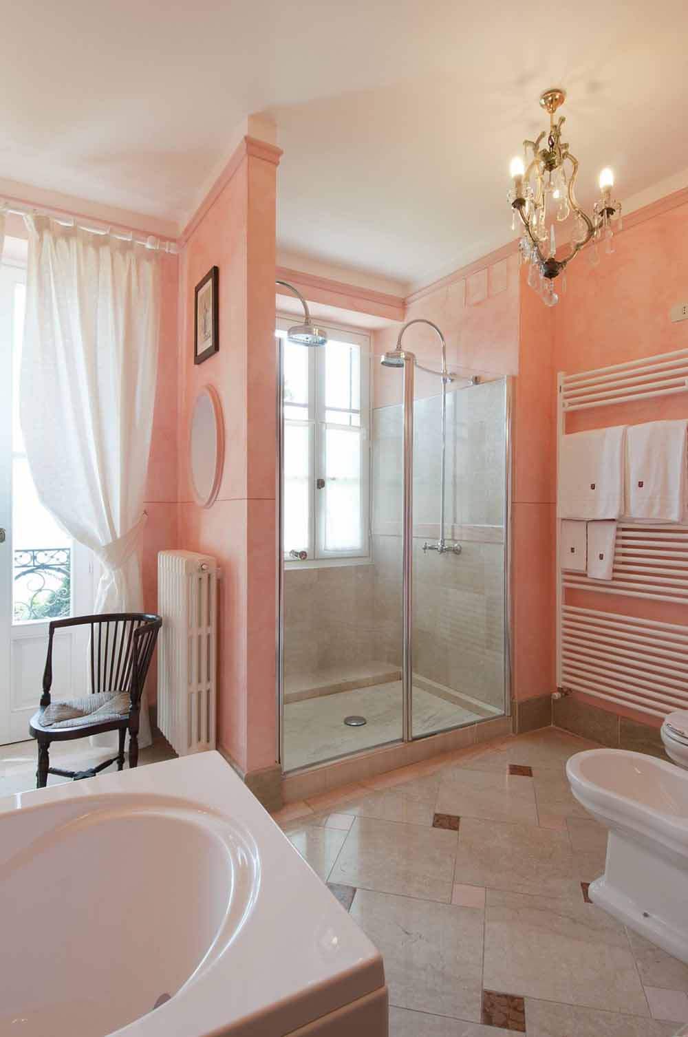 Double bedroom Pinck with lake view with air conditioning and Ensuite bathroom with shower, bath, hydro massage