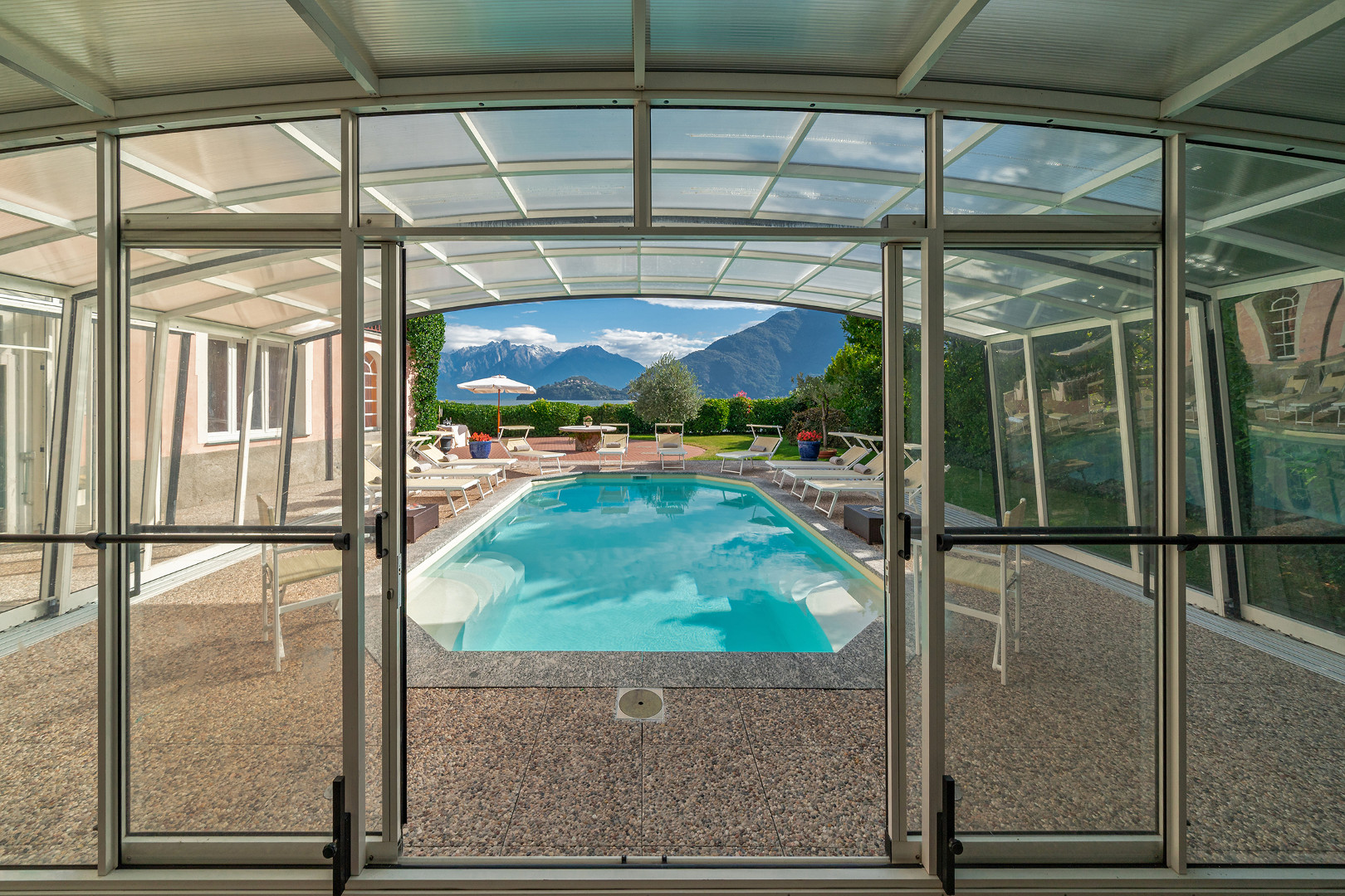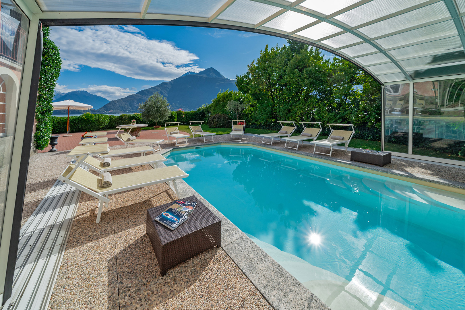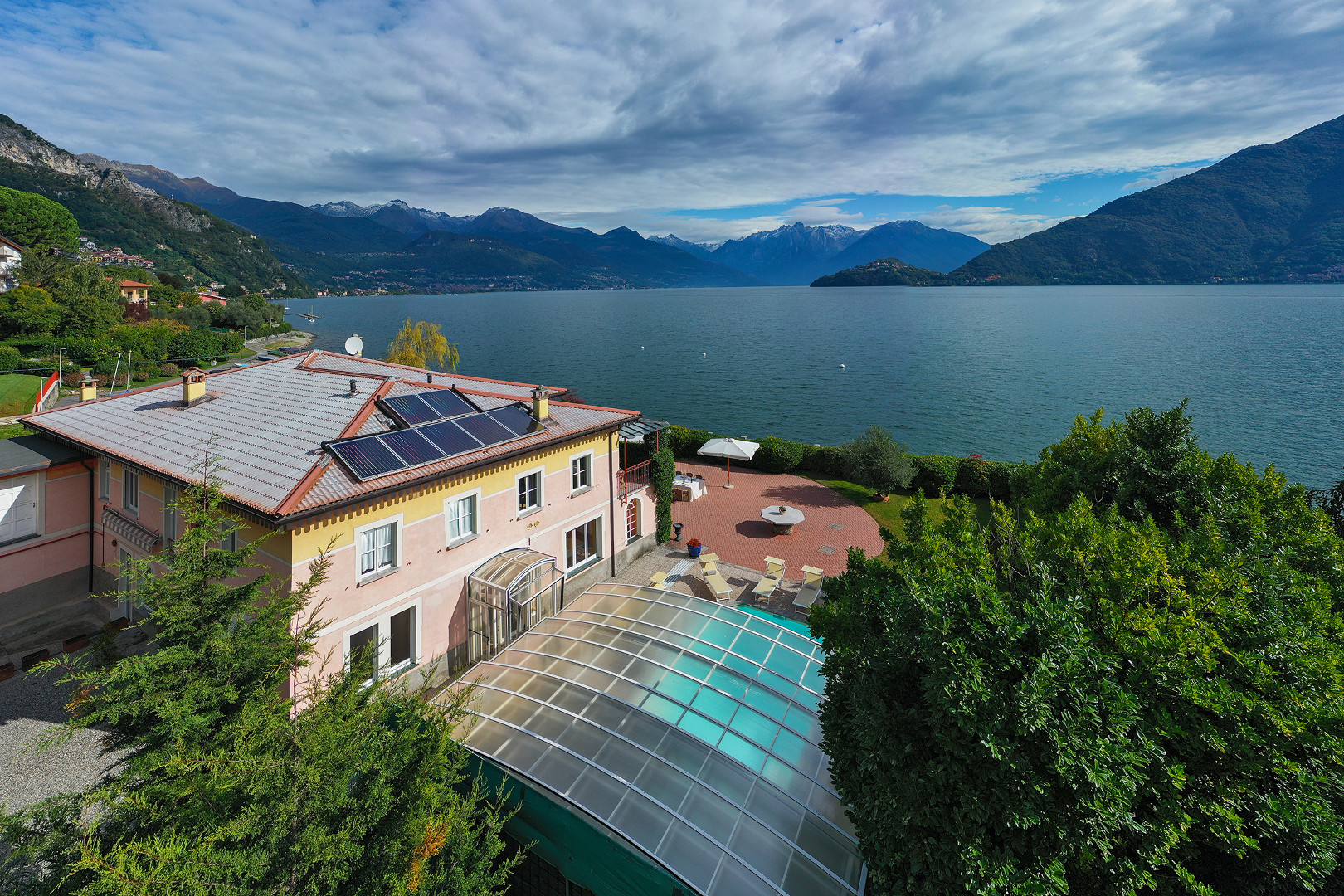 Beautiful property located in front of Lake Como, on the north-west shore, 10 km north of the village of Menaggio. The villa is located in a unique place with direct access to the beach and it has a panoramic terrace that offers a magnificent view of the lake and the nearby mountains. This house with its spacious and decorated interiors, is ideal for group holidays. The indoor pool can be heated and used during the winter. You can moor your boat in front of the villa.