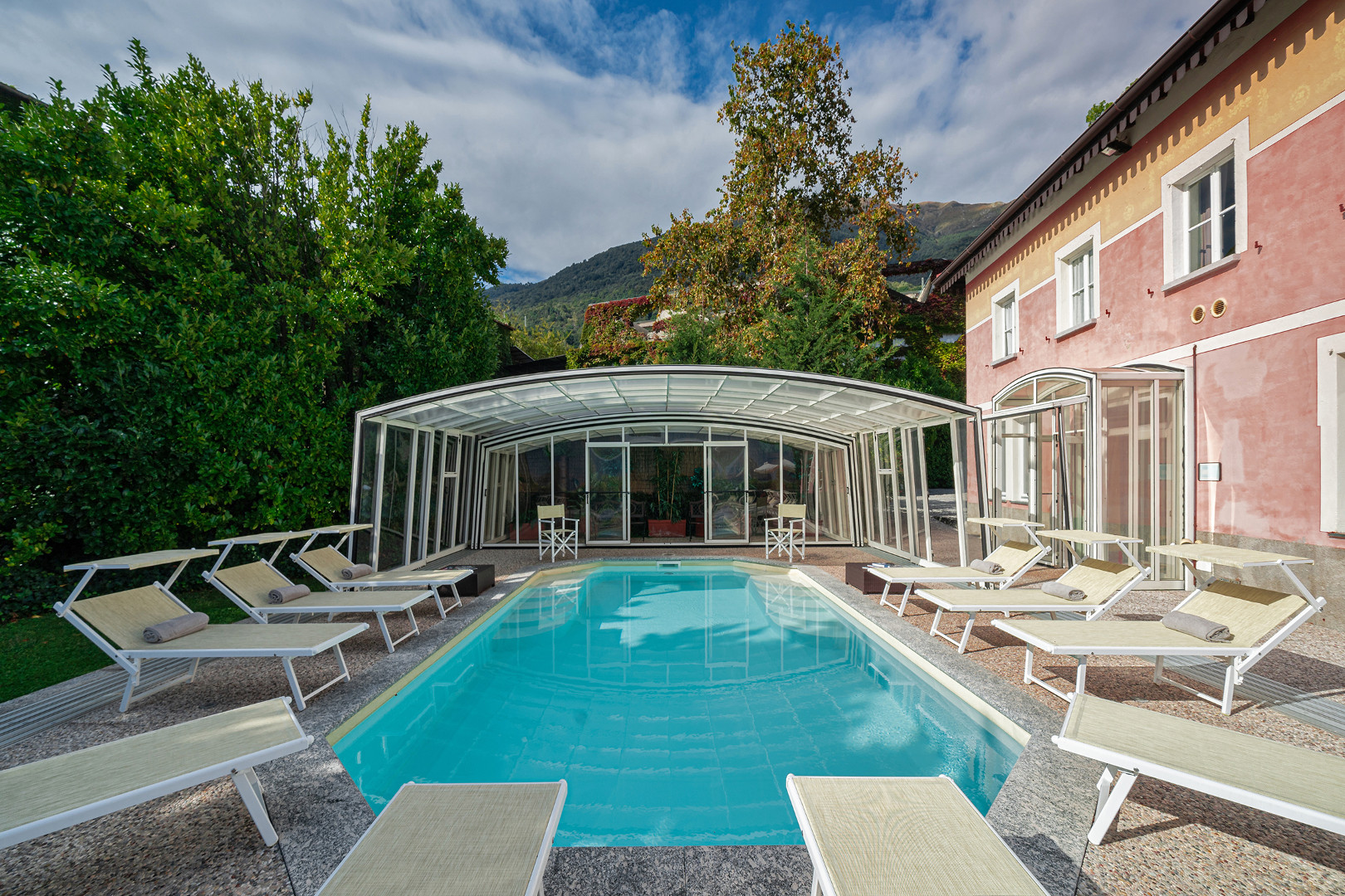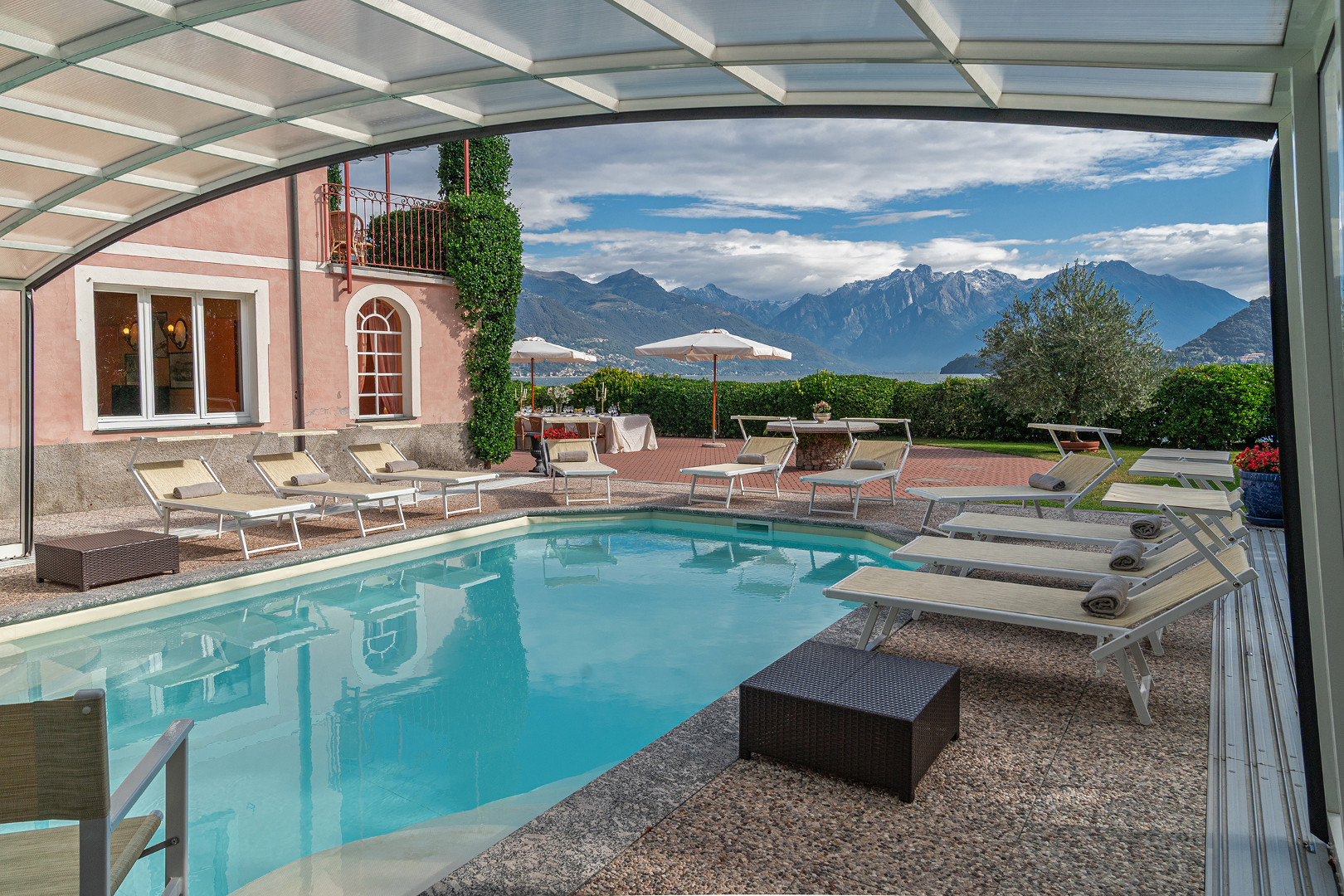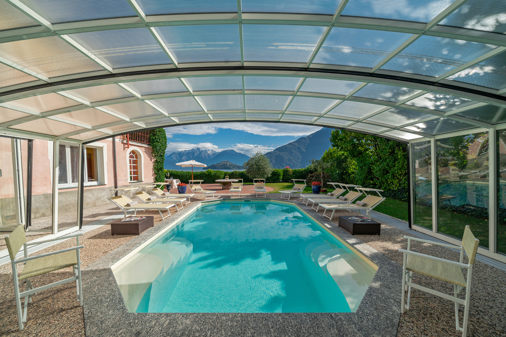 Beautiful property located in front of Lake Como, on the north-west shore, 10 km north of the village of Menaggio. The villa is located in a unique place with direct access to the beach and it has a panoramic terrace that offers a magnificent view of the lake and the nearby mountains. This house with its spacious and decorated interiors, is ideal for group holidays. The indoor pool can be heated and used during the winter. You can moor your boat in front of the villa.