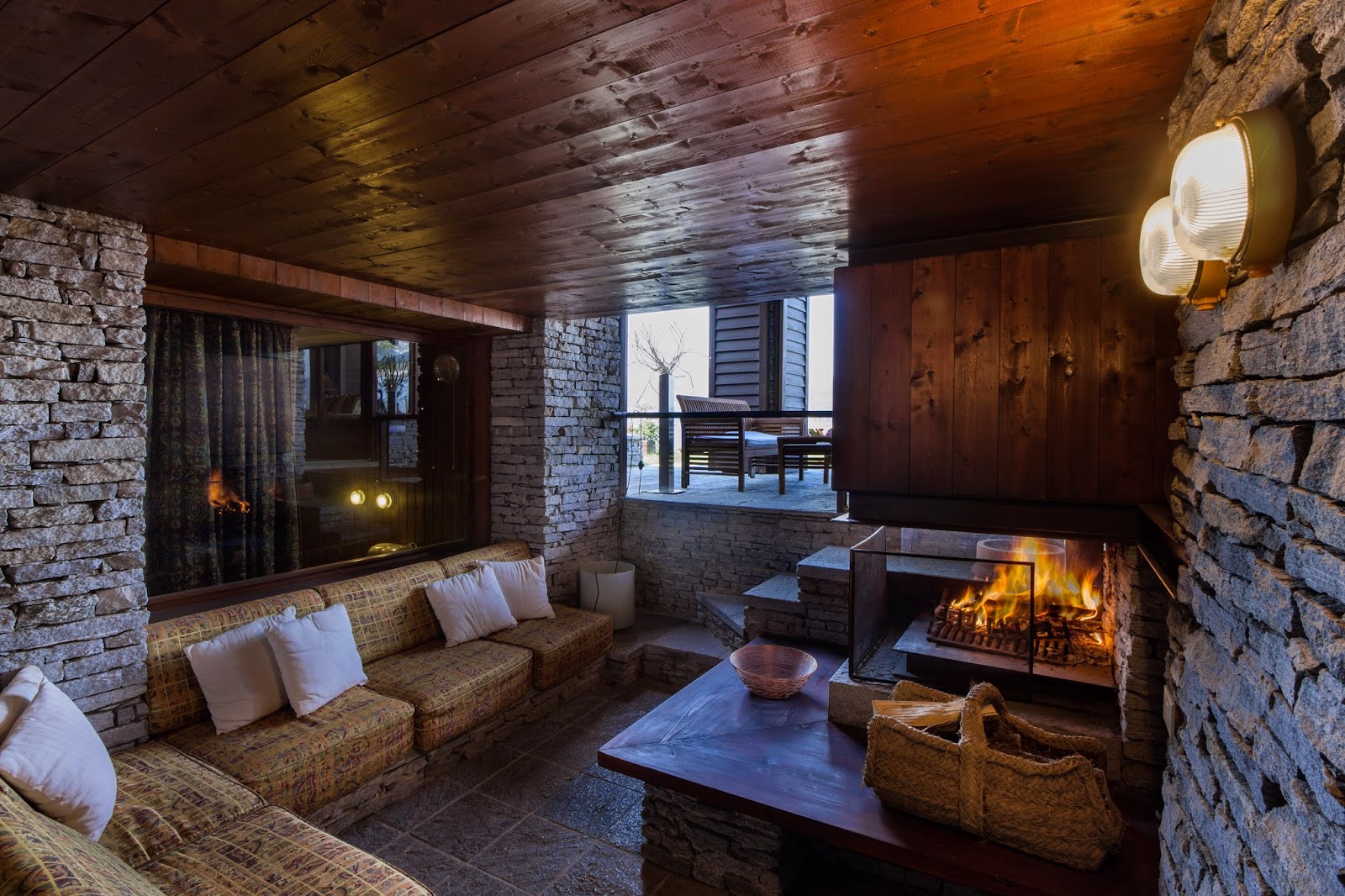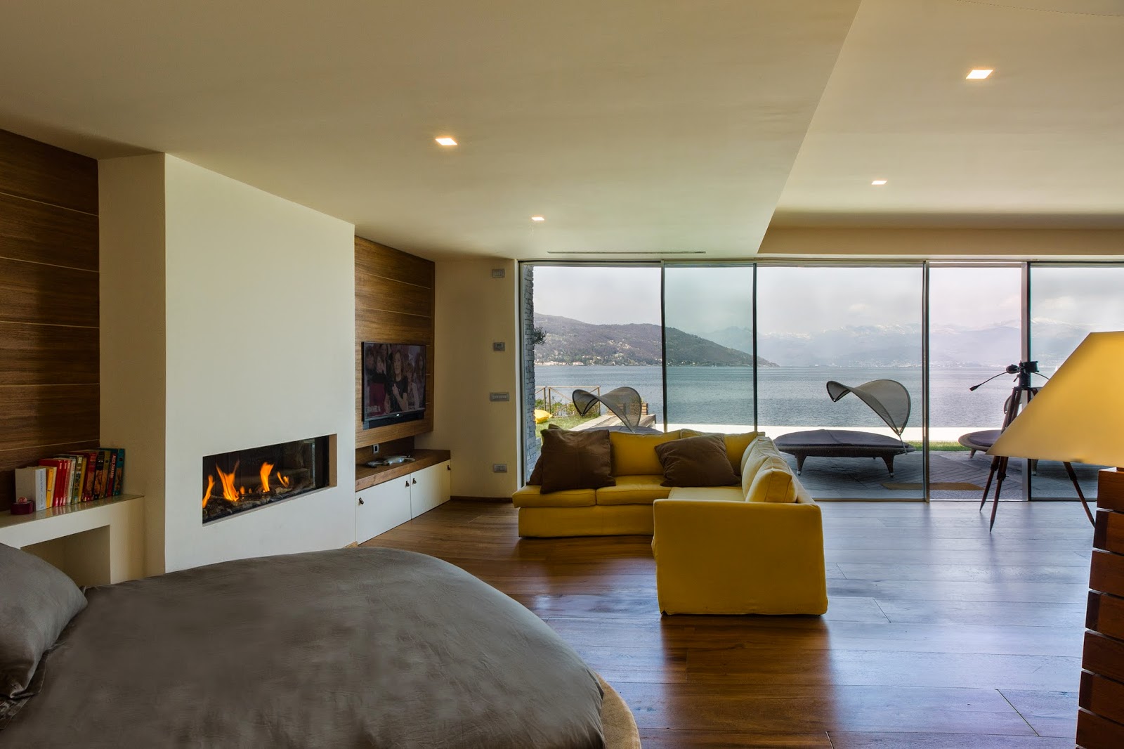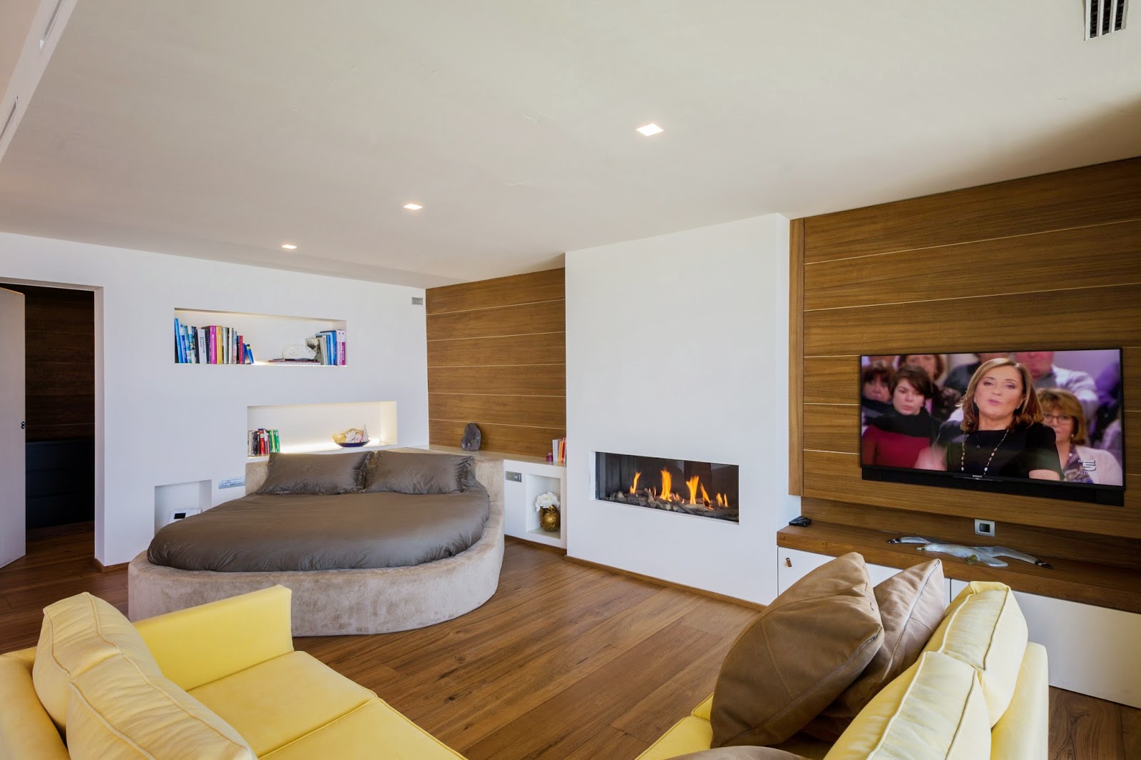 Master bedroom suite 63 sqm with large glass sliding doors overlooking the lake, round double bed 210x180 with air conditioning, fire place, jacuzzi, shower, terrace access, living room area, lcd tv