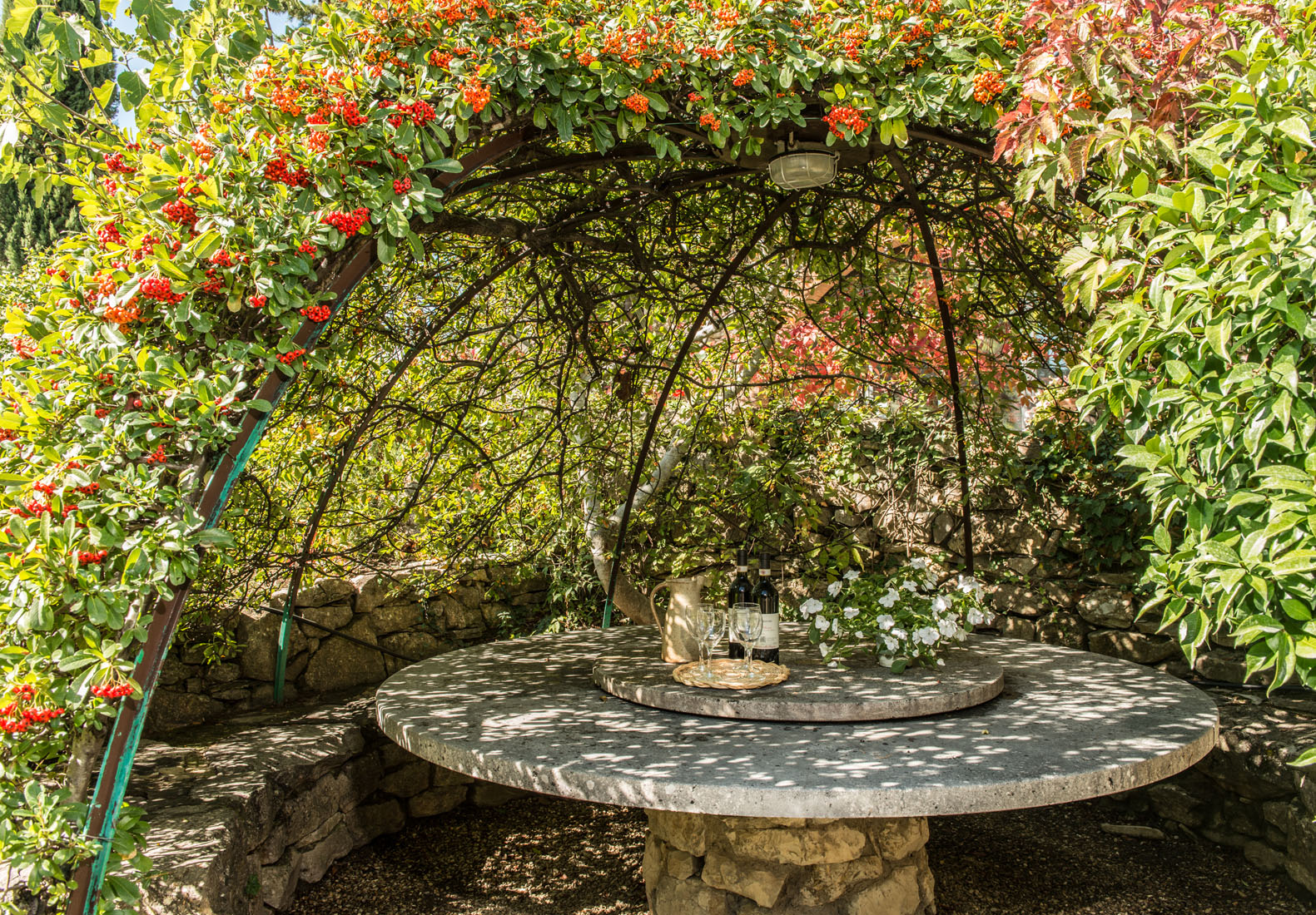 Living Room with dining area with fire place and Terrace and internal patio with vine-covered pergola with marble table ideal for al fresco dining