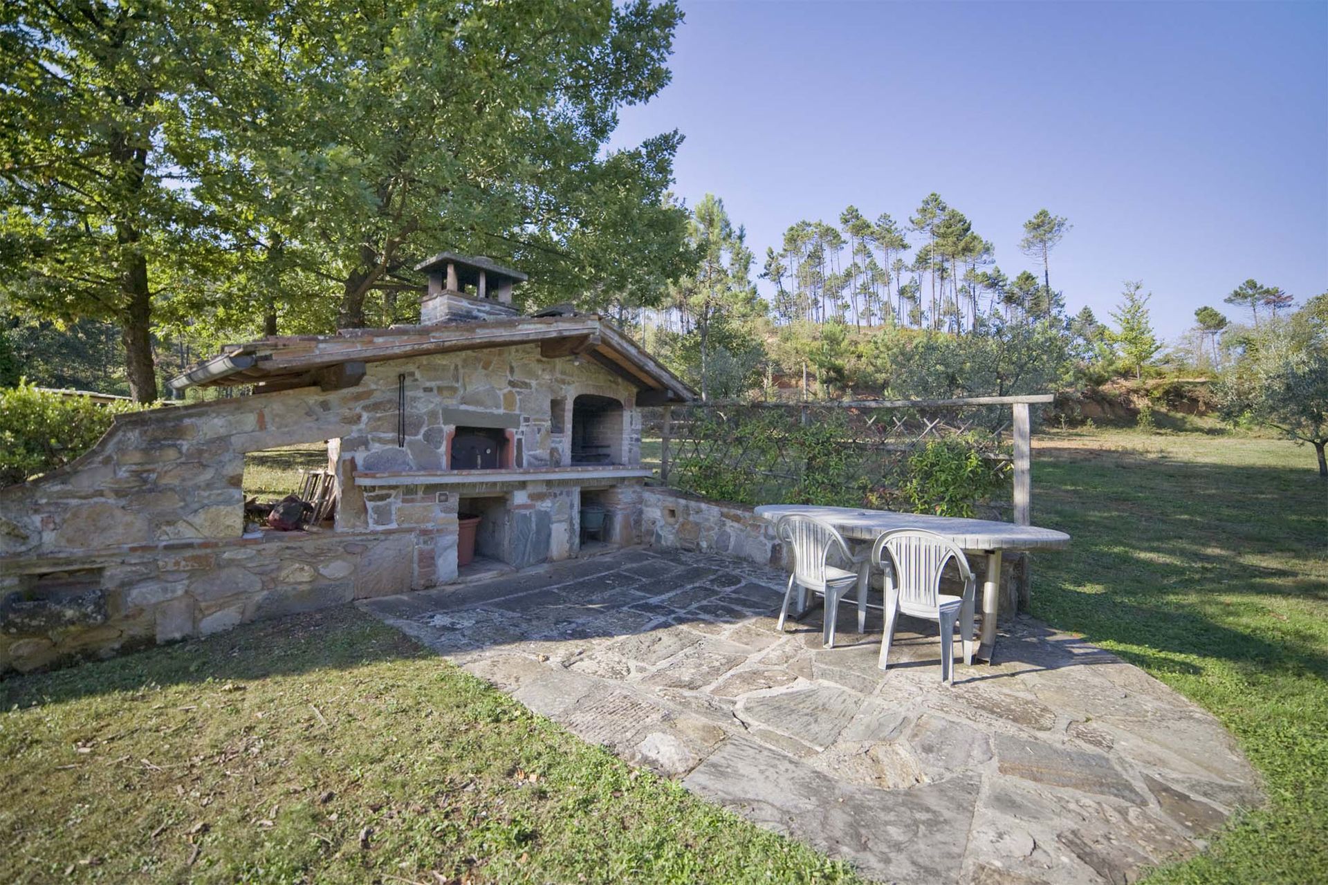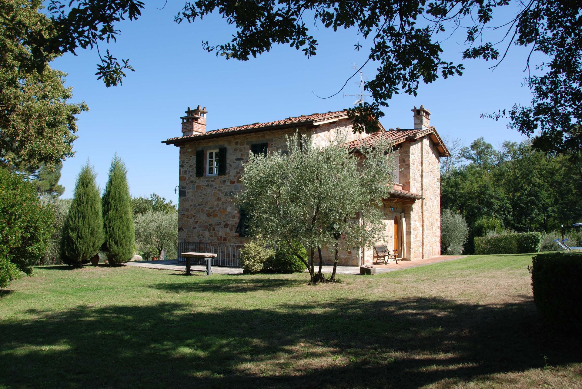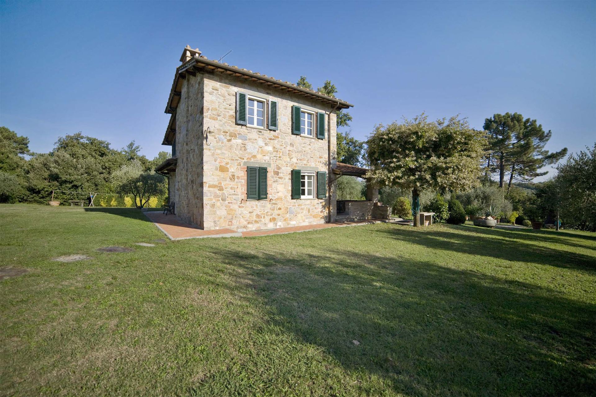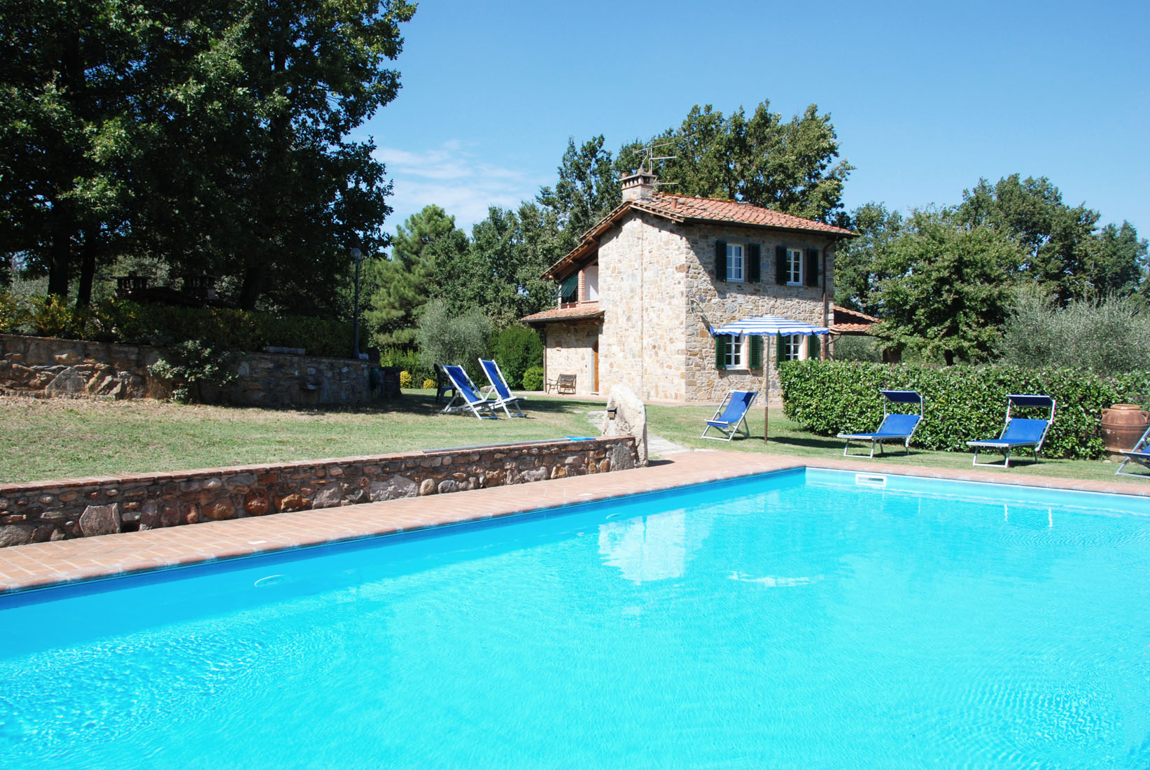 This attractive stone built farmhouse was completely and immaculately restored. The interiors are particularly light and comfortable. The owner has used authentic Tuscan materials, such as cotto floors, beamed ceilings, and exposed brickwork. The wooden flooring on the second floor is all hand made. This property also benefits from a large, flat garden, completely fenced and surrounded by trees, making the house an ideal place for families. The new swimming pool is located 50 meters from the house, close to a patio with barbecue and pizza oven, ideal for evening meals. On the other side of the house the comfortable kitchen opens onto a veranda, ideal for al fresco meals. The location of the house is very convenient for visiting the main Tuscan towns. It is only 12 Km from the centre of Lucca and, being only 6 Km from a motorway exit, it is also possible to reach Florence in less than 50 minutes, and both Pisa and the beaches in half an hour.