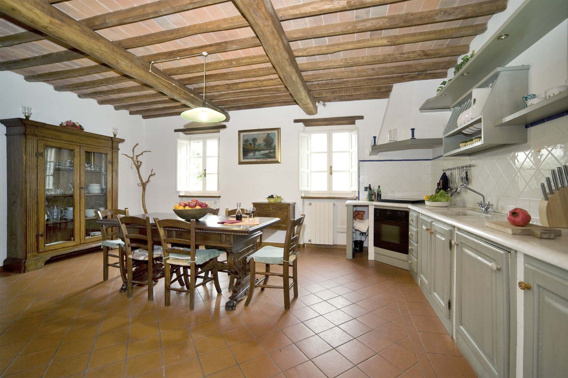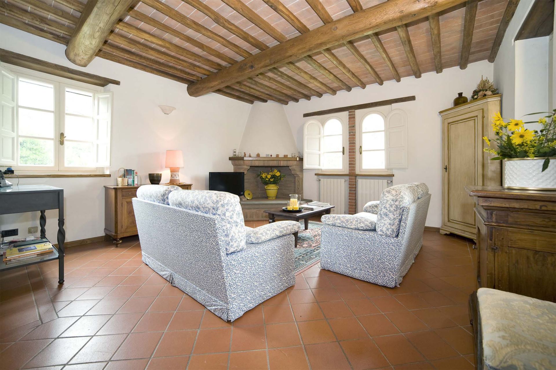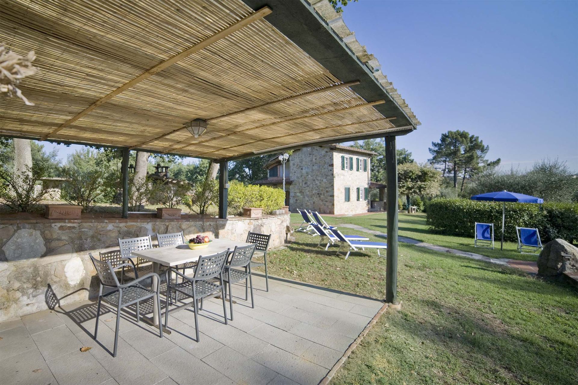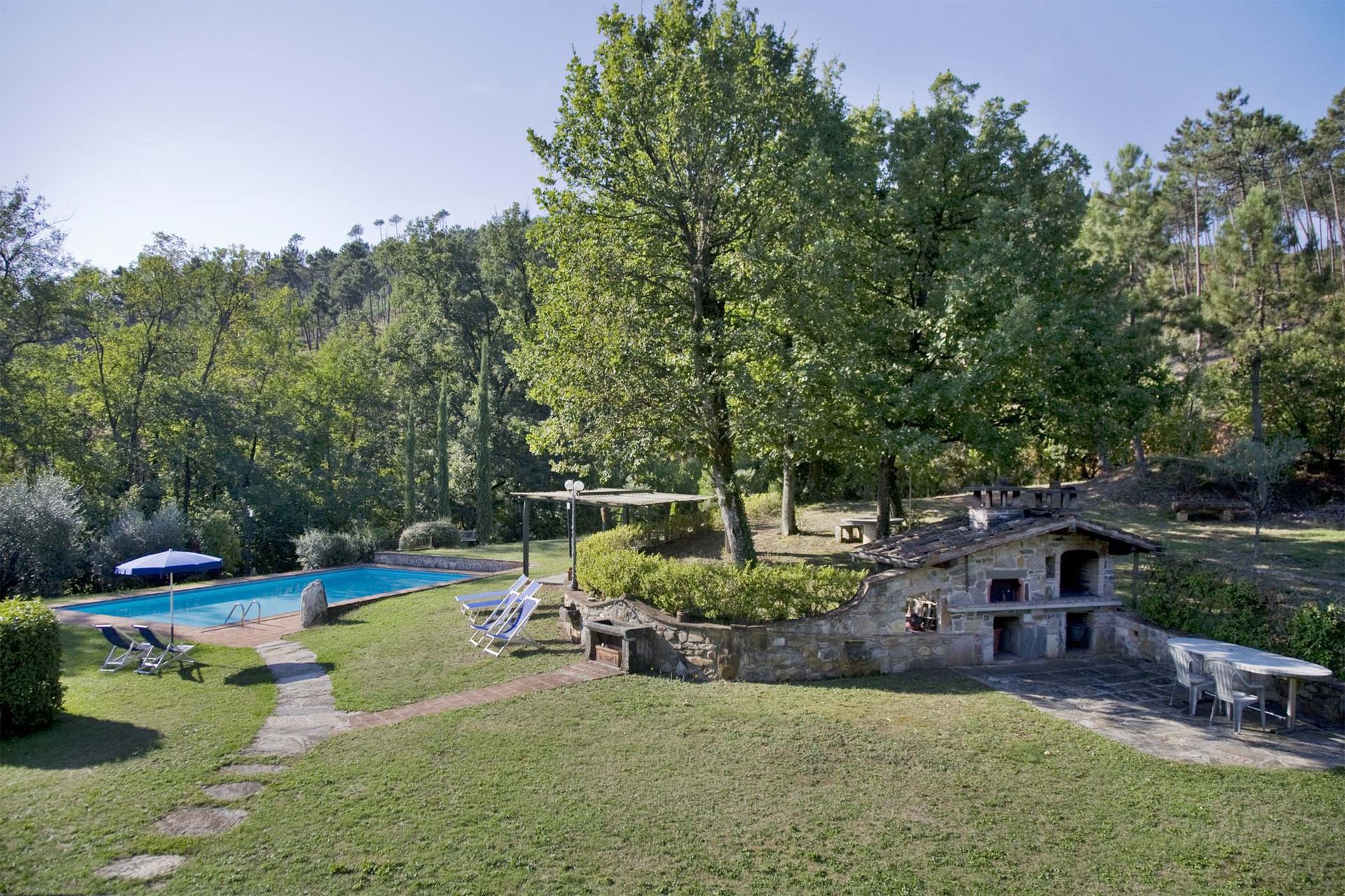 This attractive stone built farmhouse was completely and immaculately restored. The interiors are particularly light and comfortable. The owner has used authentic Tuscan materials, such as cotto floors, beamed ceilings, and exposed brickwork. The wooden flooring on the second floor is all hand made. This property also benefits from a large, flat garden, completely fenced and surrounded by trees, making the house an ideal place for families. The new swimming pool is located 50 meters from the house, close to a patio with barbecue and pizza oven, ideal for evening meals. On the other side of the house the comfortable kitchen opens onto a veranda, ideal for al fresco meals. The location of the house is very convenient for visiting the main Tuscan towns. It is only 12 Km from the centre of Lucca and, being only 6 Km from a motorway exit, it is also possible to reach Florence in less than 50 minutes, and both Pisa and the beaches in half an hour.