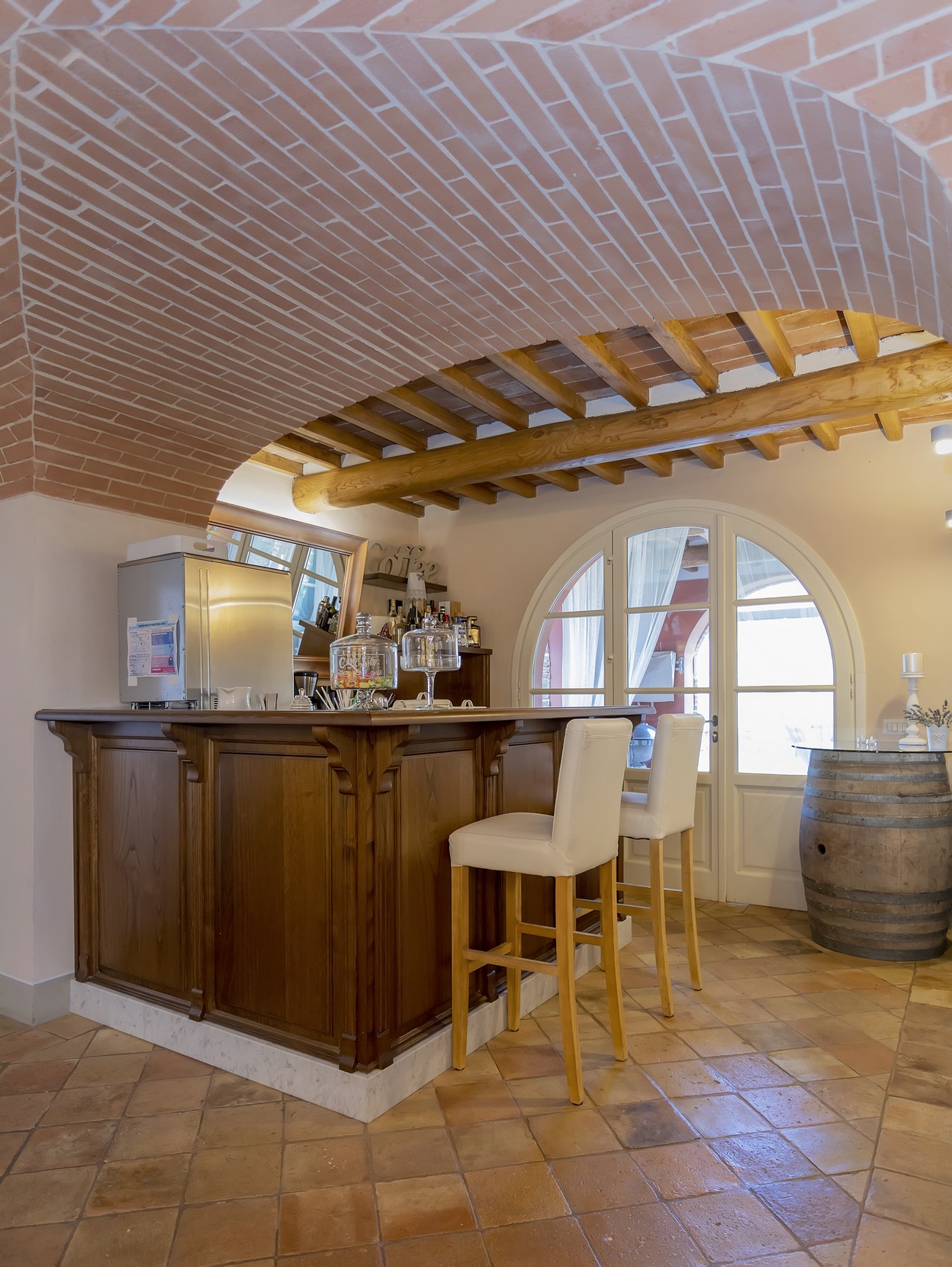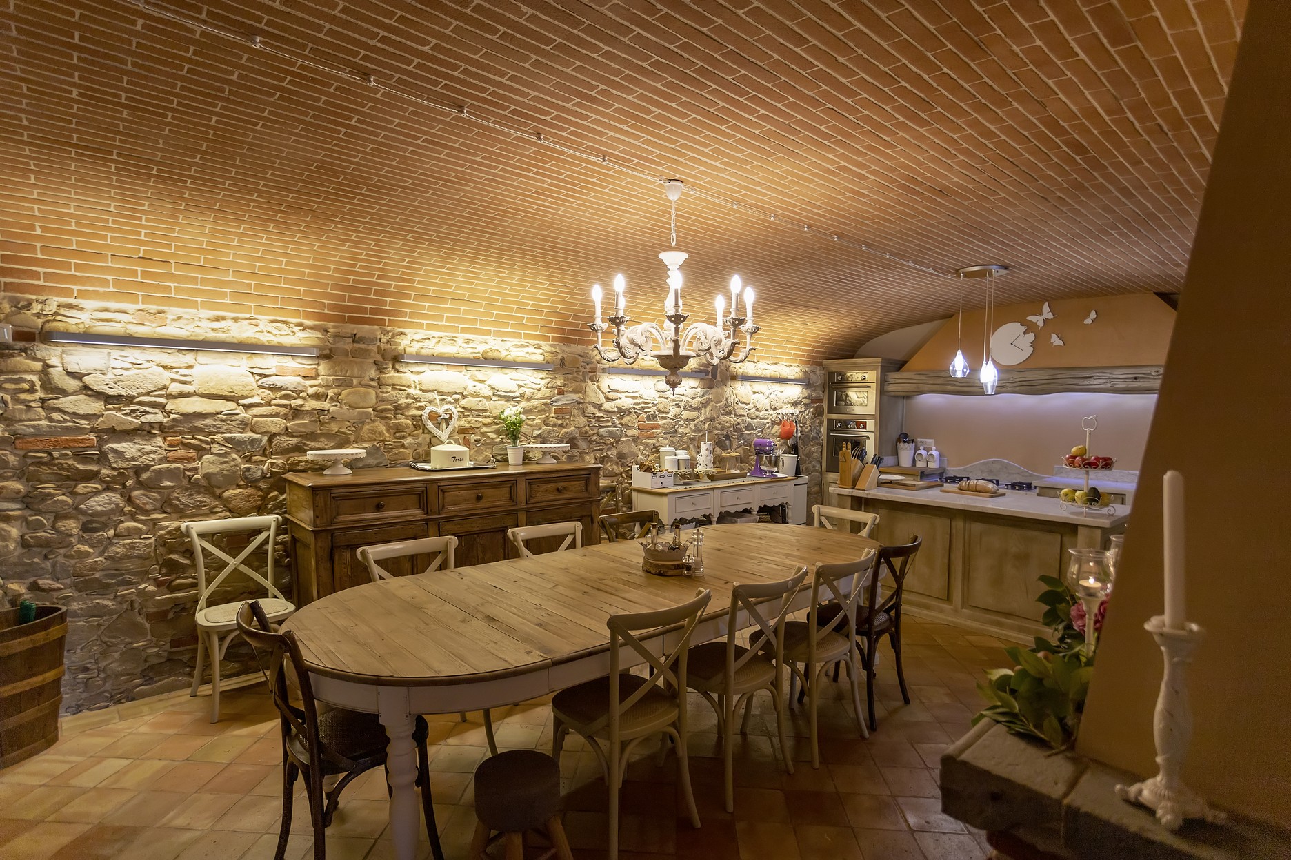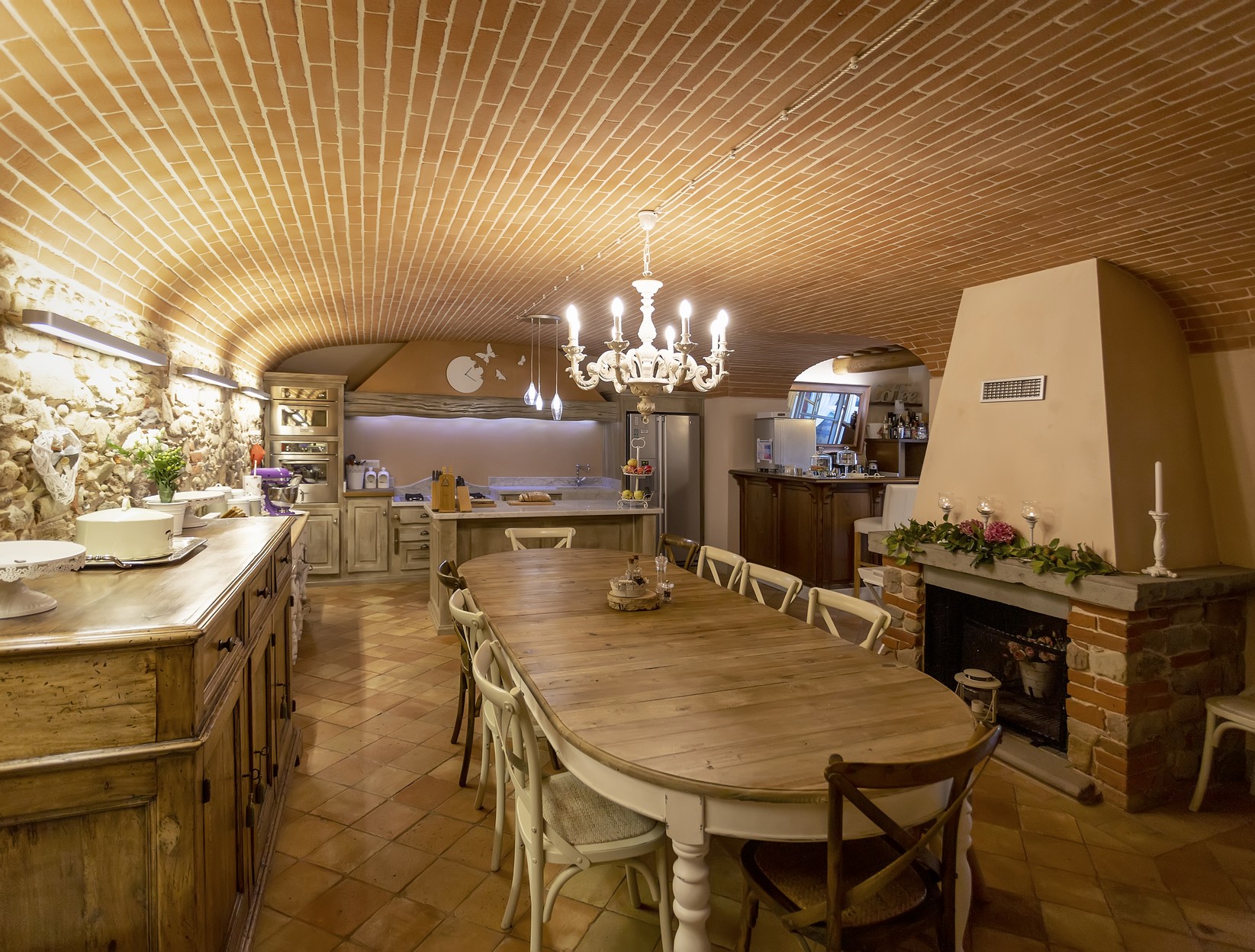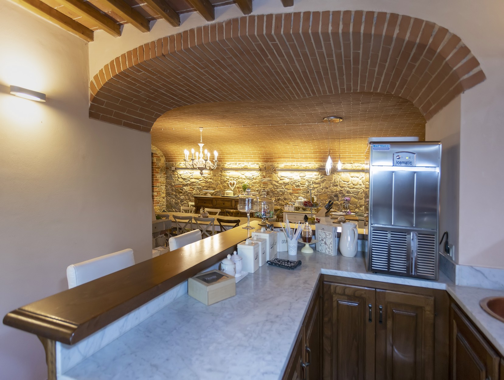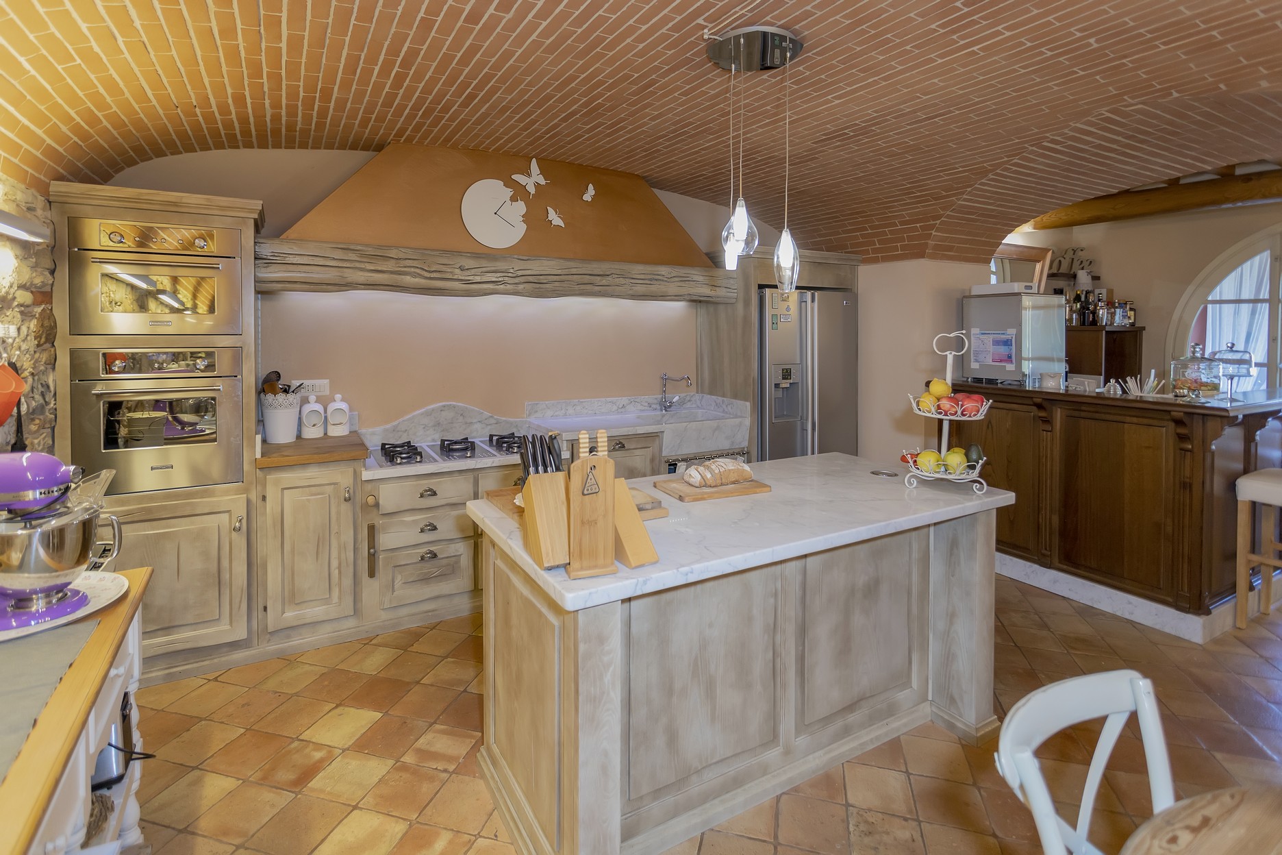 Open kitchen overhanged by a wonderful arched ceiling with electric oven, fridge, ice making machine, gas stove, garden access