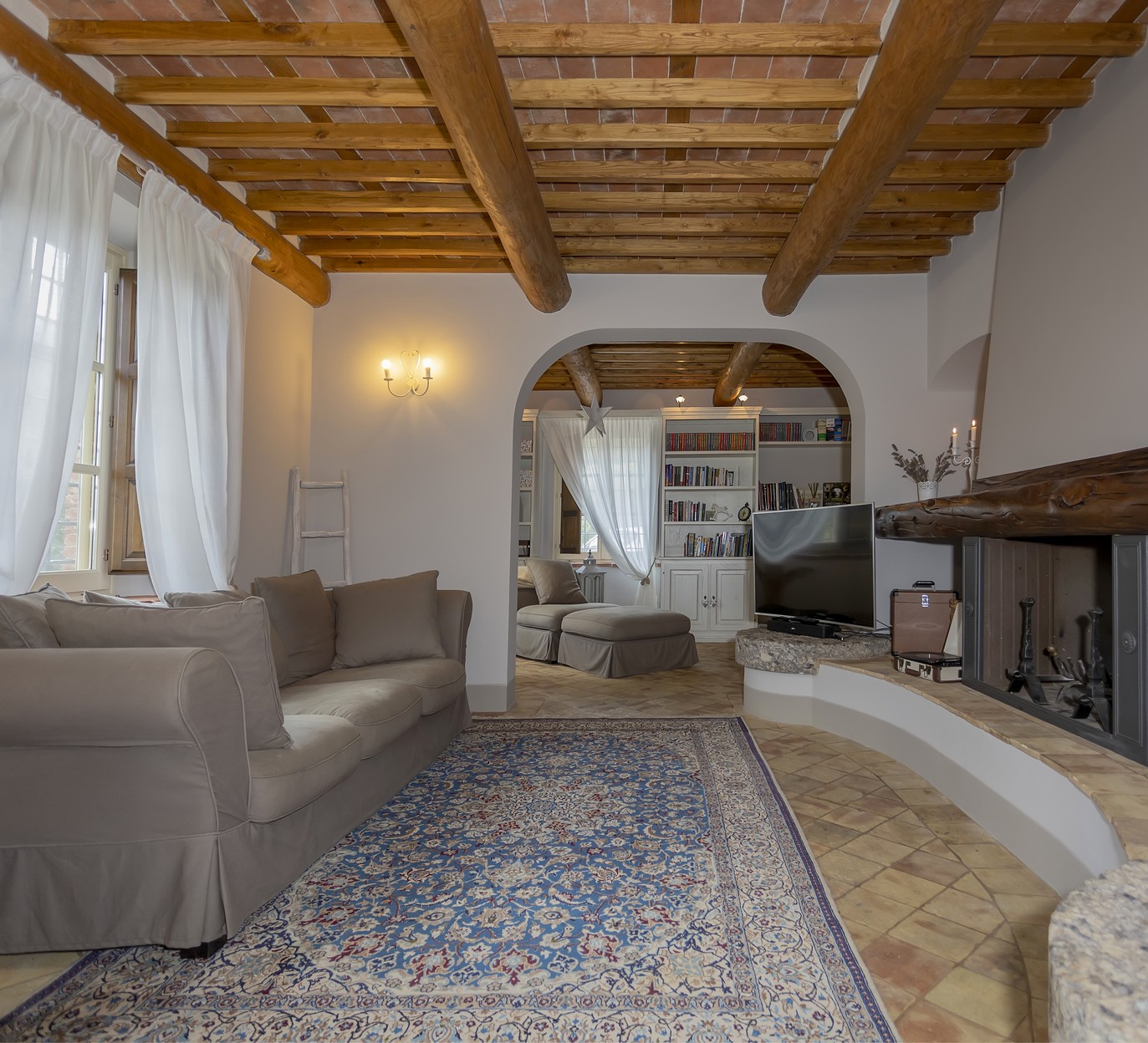 Living Room with fire place, plasma tv and Library